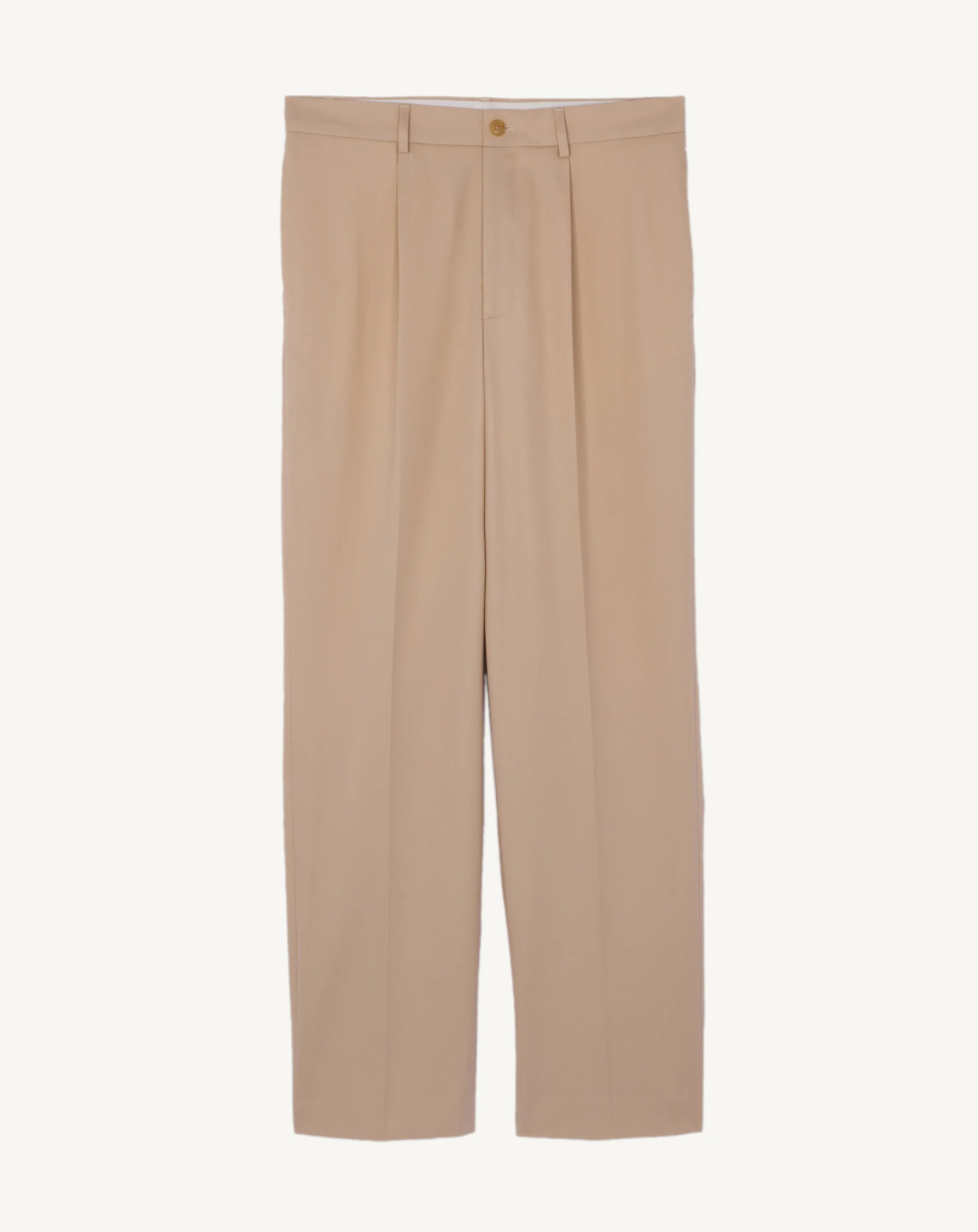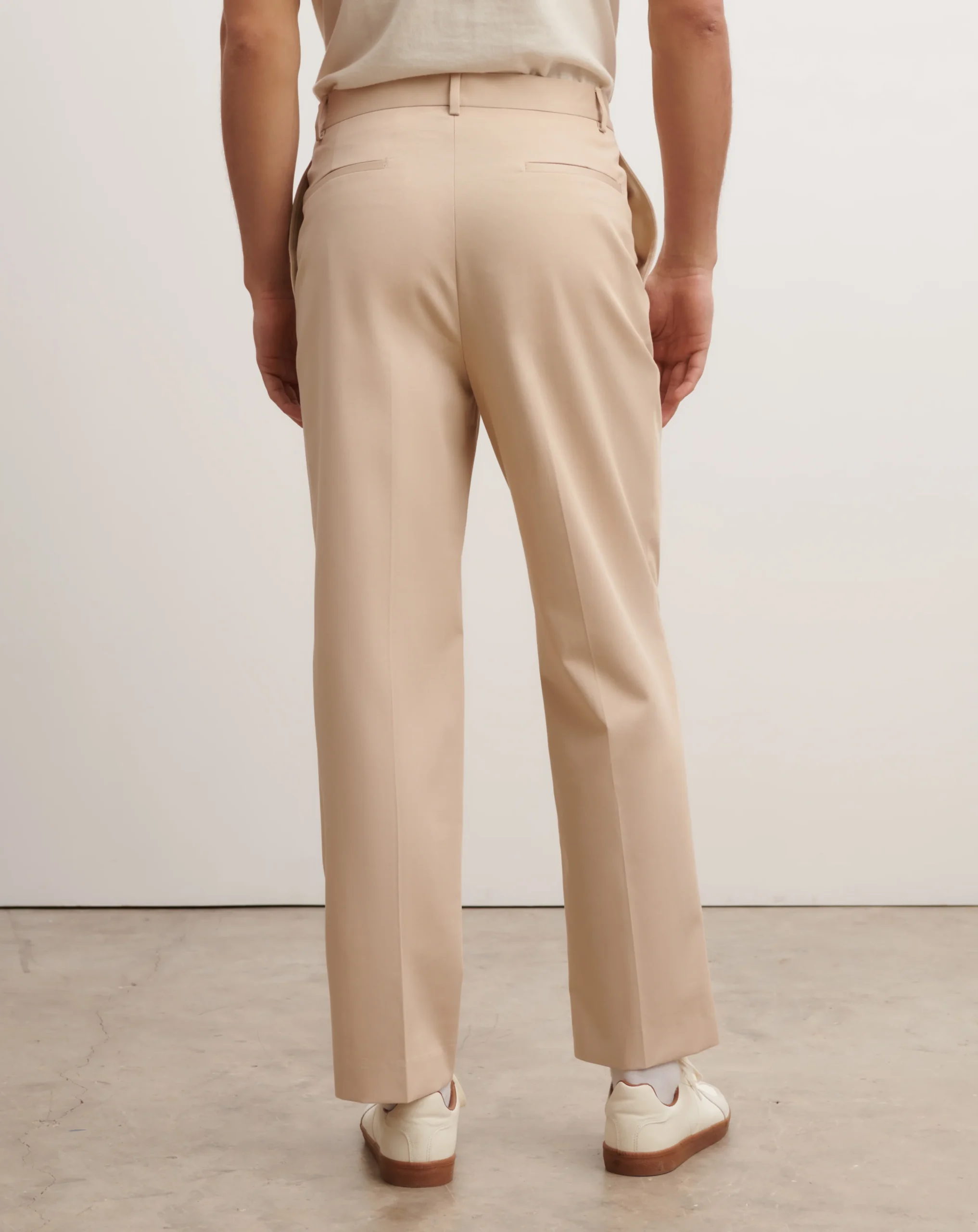 Pantalon en twill de coton souple. Modèle à coupe droite intemporelle. Poches italiennes et poches passepoilées dans le dos. Jambes avec plis marqués.