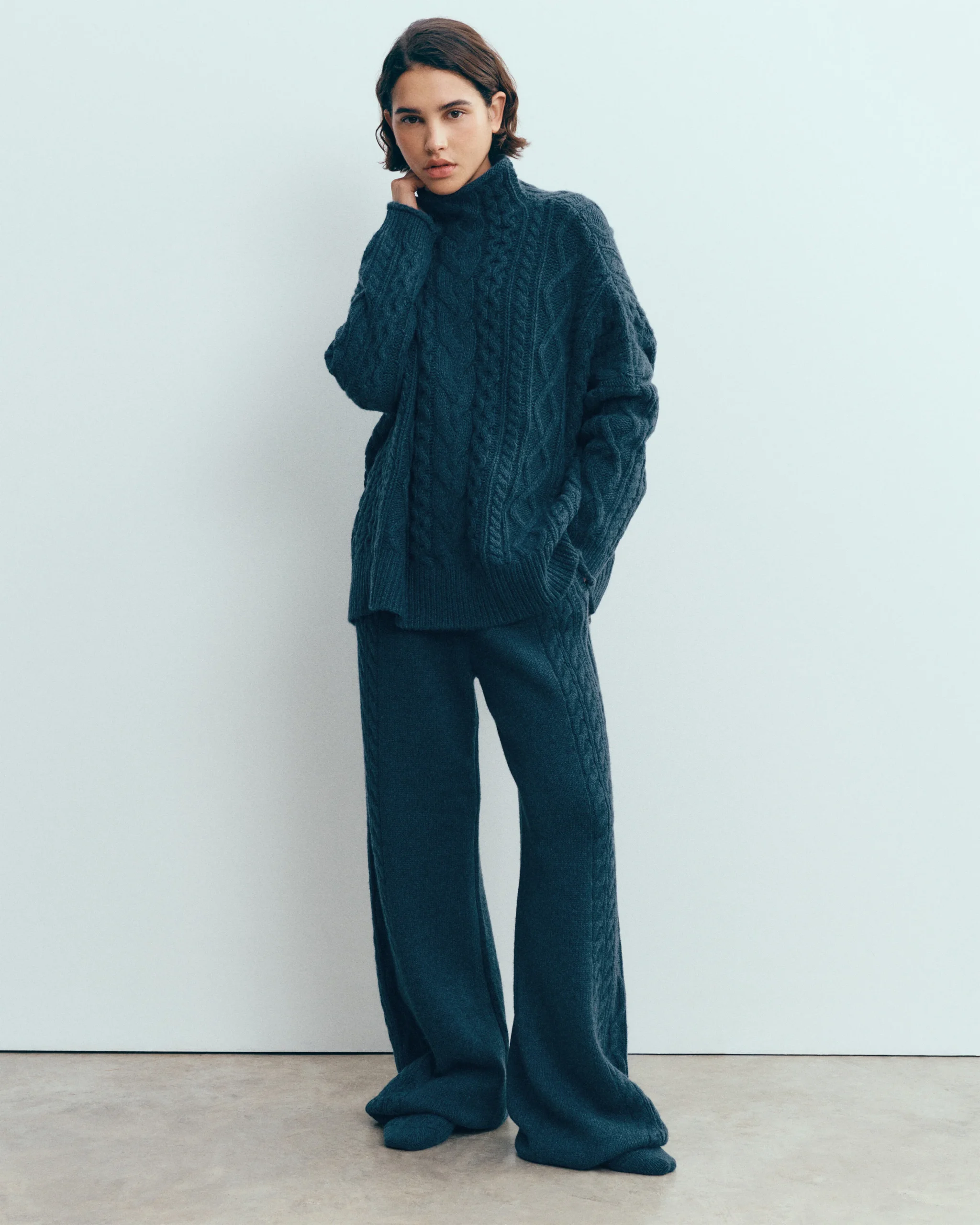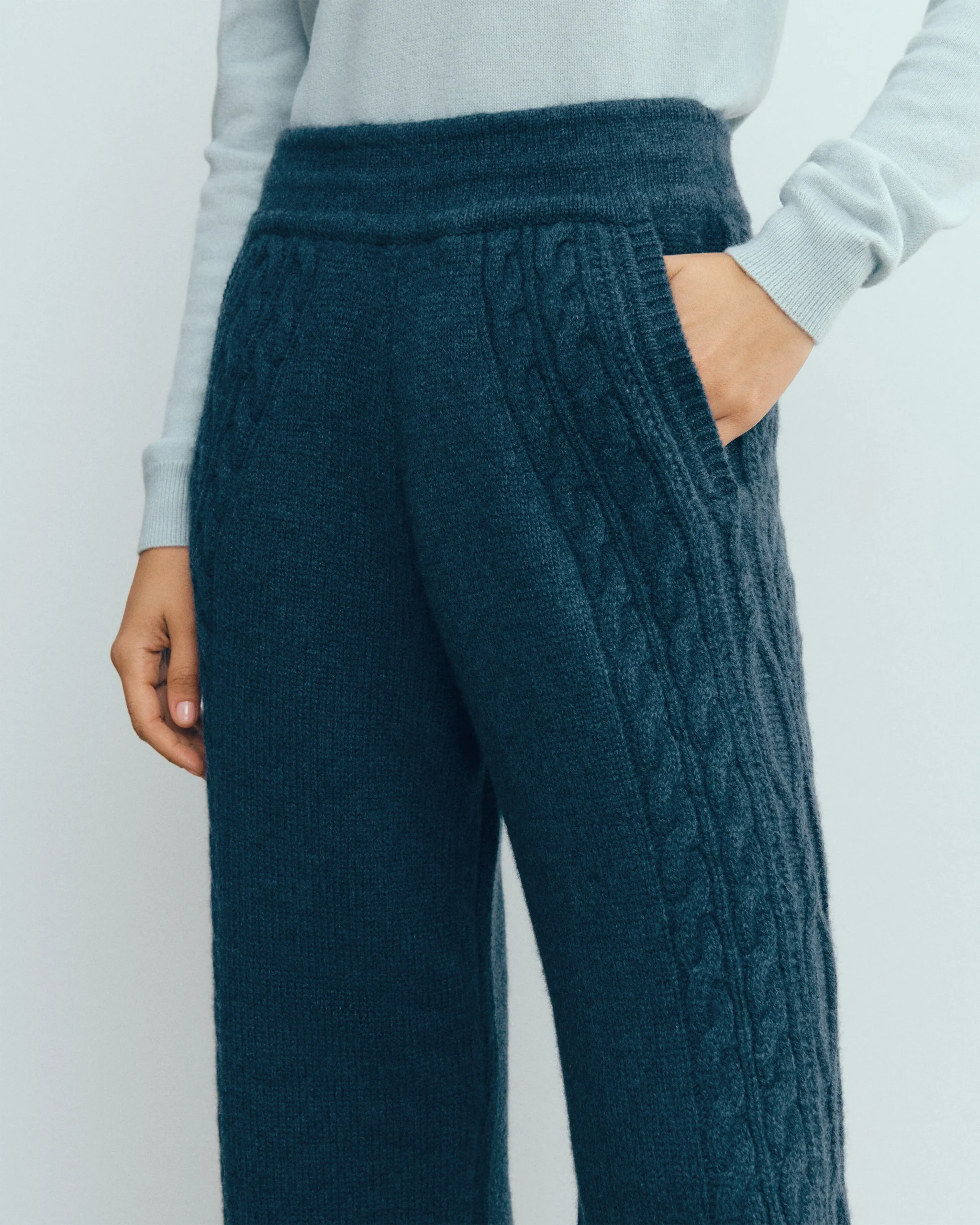 Pantalon en cachemire tricoté, orné de torsades placées à l’avant. Un modèle inédit, conçu pour la collection capsule des quarante ans de la Maison Bompard, célébrant la couleur et l’excellence du savoir-faire torsadé.