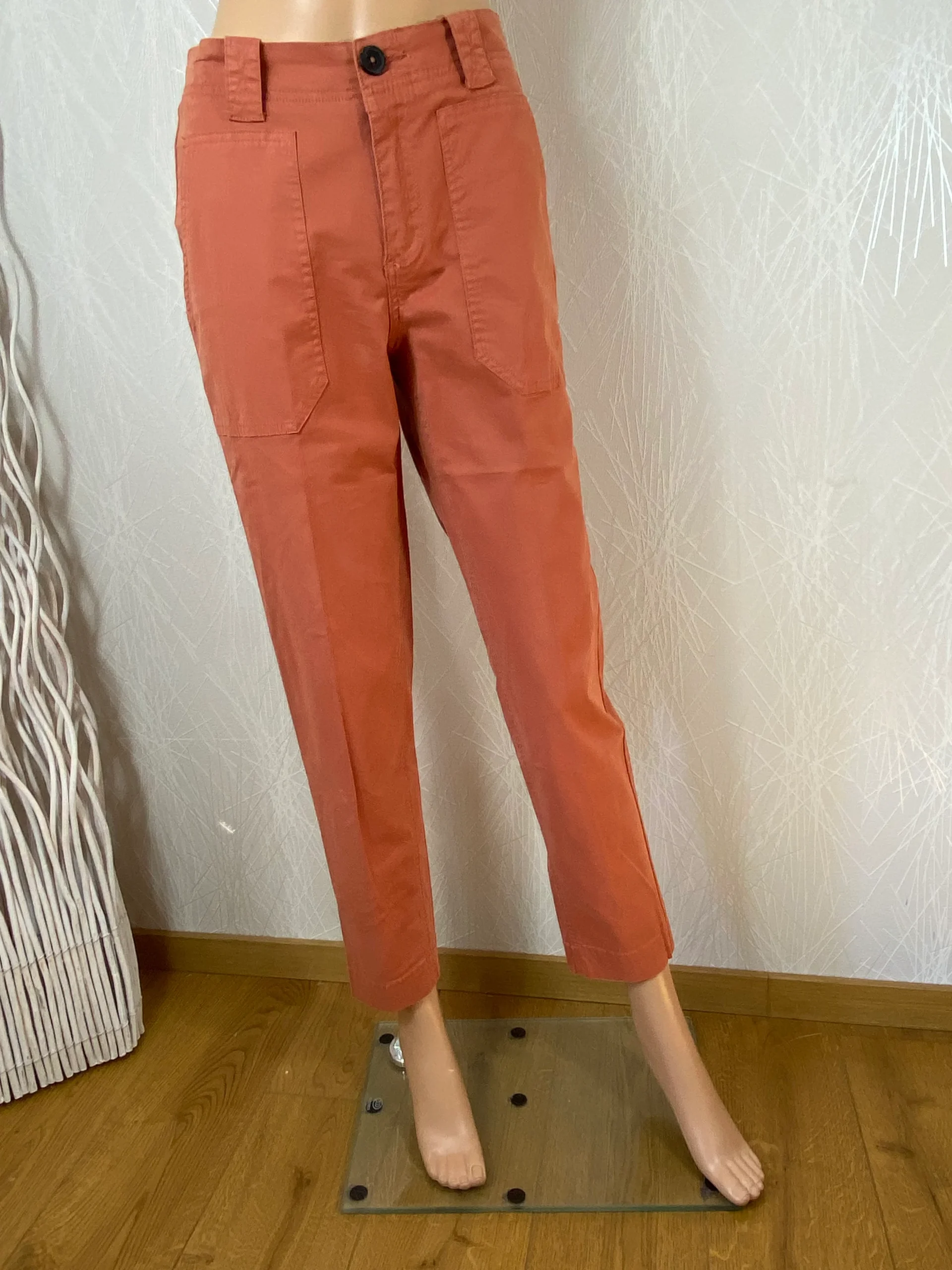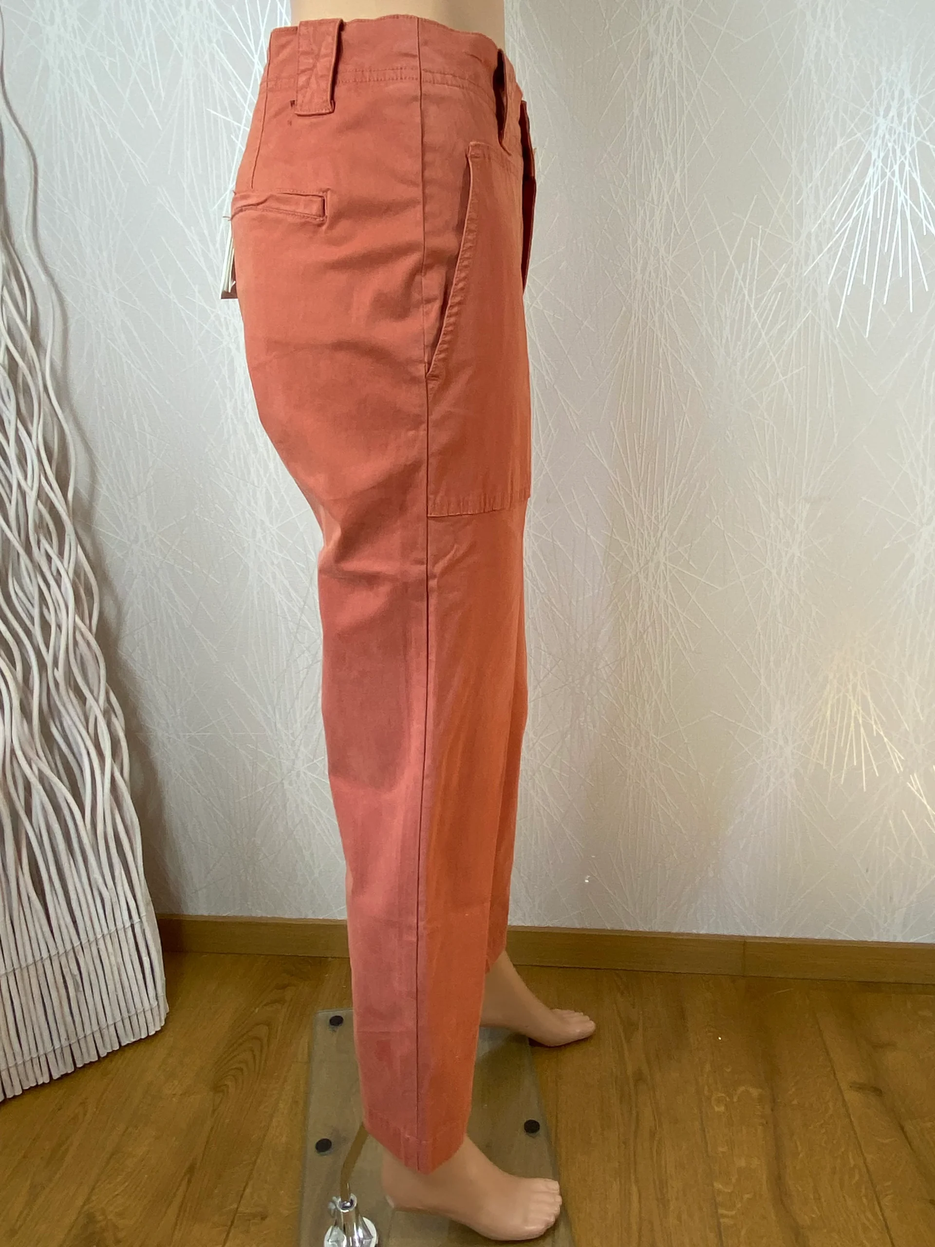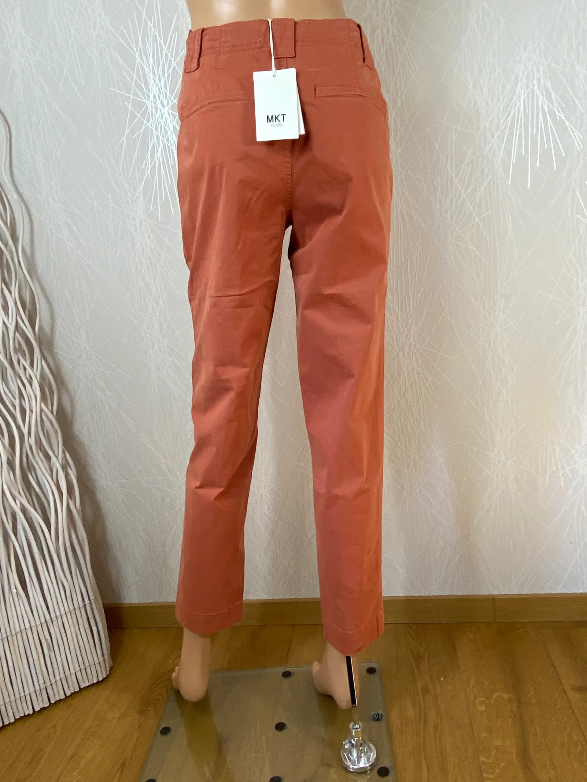 Pantalon en toile de la marque MKT Studio. Coupe droite, passants pour ceinture, 2 poches à l’avant, 2 poches passepoilées à l’arrière et léger. Matière : 98% coton – 2% élasthanne. Couleur : Brun noisette. Dimensions Taille 35 ( T. américaine 25): Tour de taille : 70 cm ; longueur : 97 cm ; longueur […]