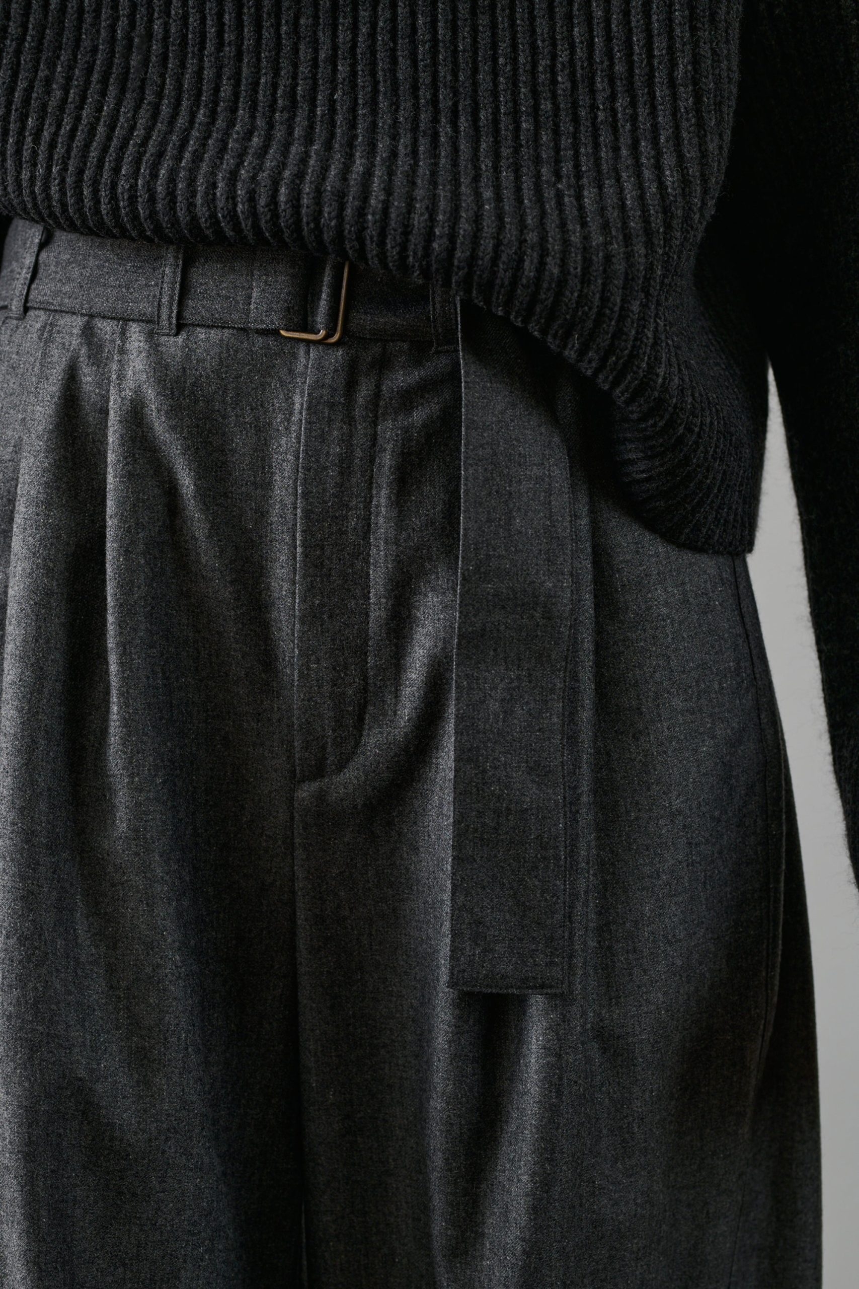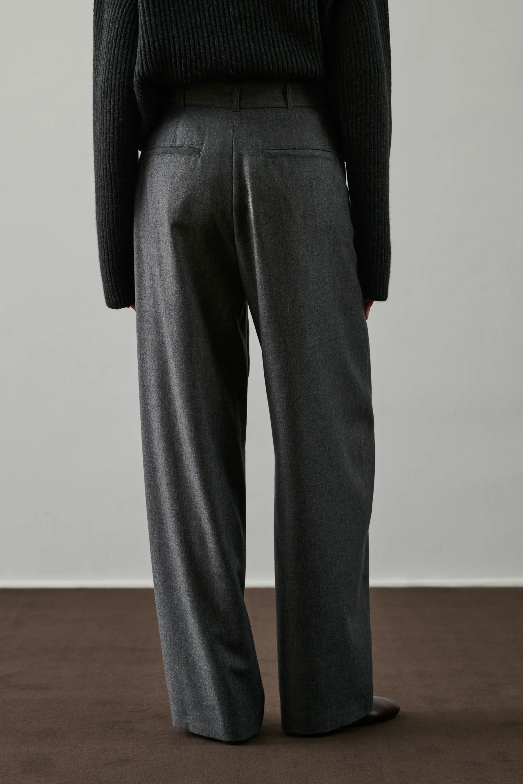 COLE est un pantalon ample en flanelle grise, à pinces. Ses jambes larges et longues, sa ceinture amovible avec boucle et ses poches italiennes à l’avant, passepoilées au dos, apportent une allure sophistiquée. Le lainage fin et souple assure confort et élégance.