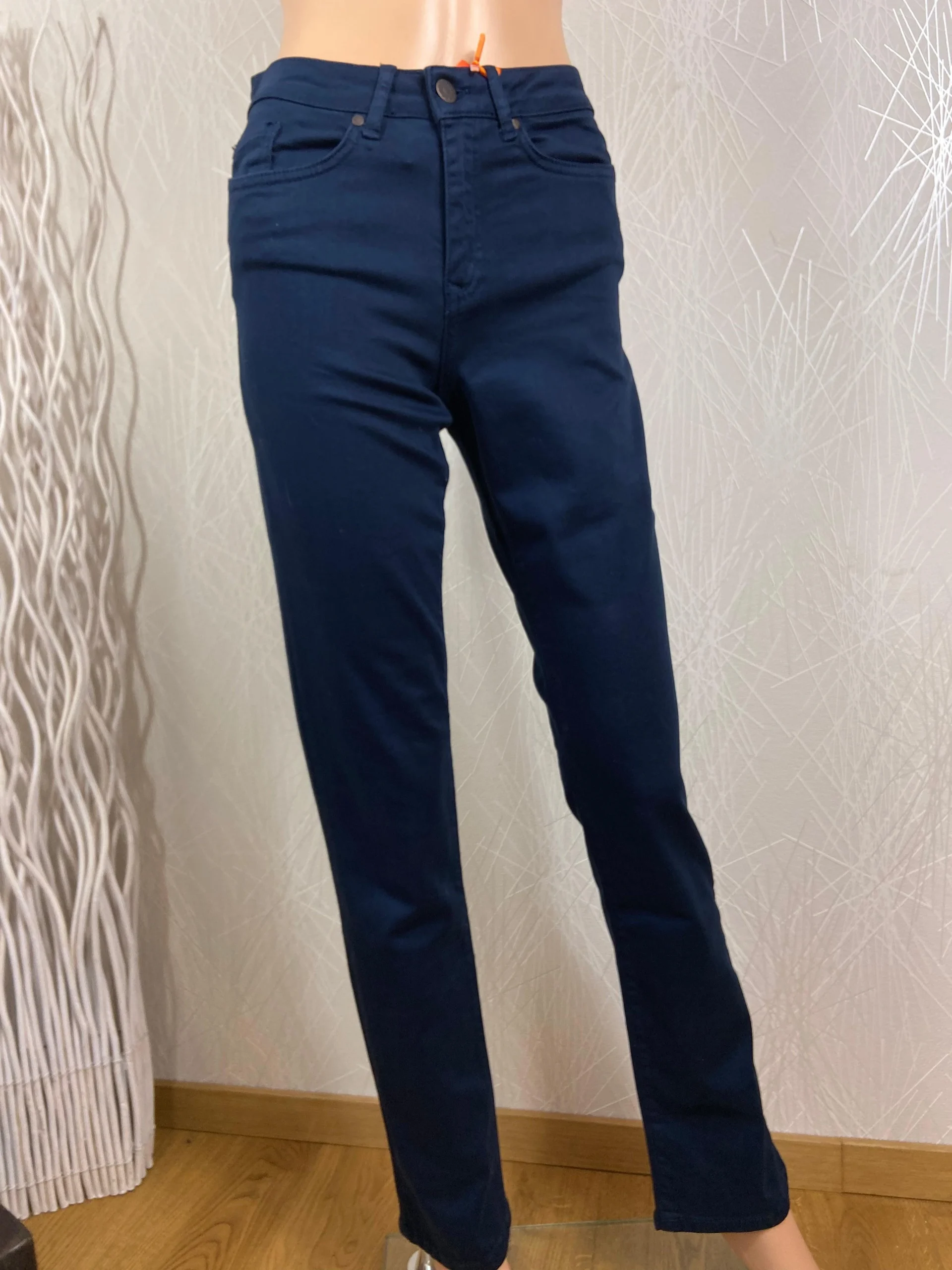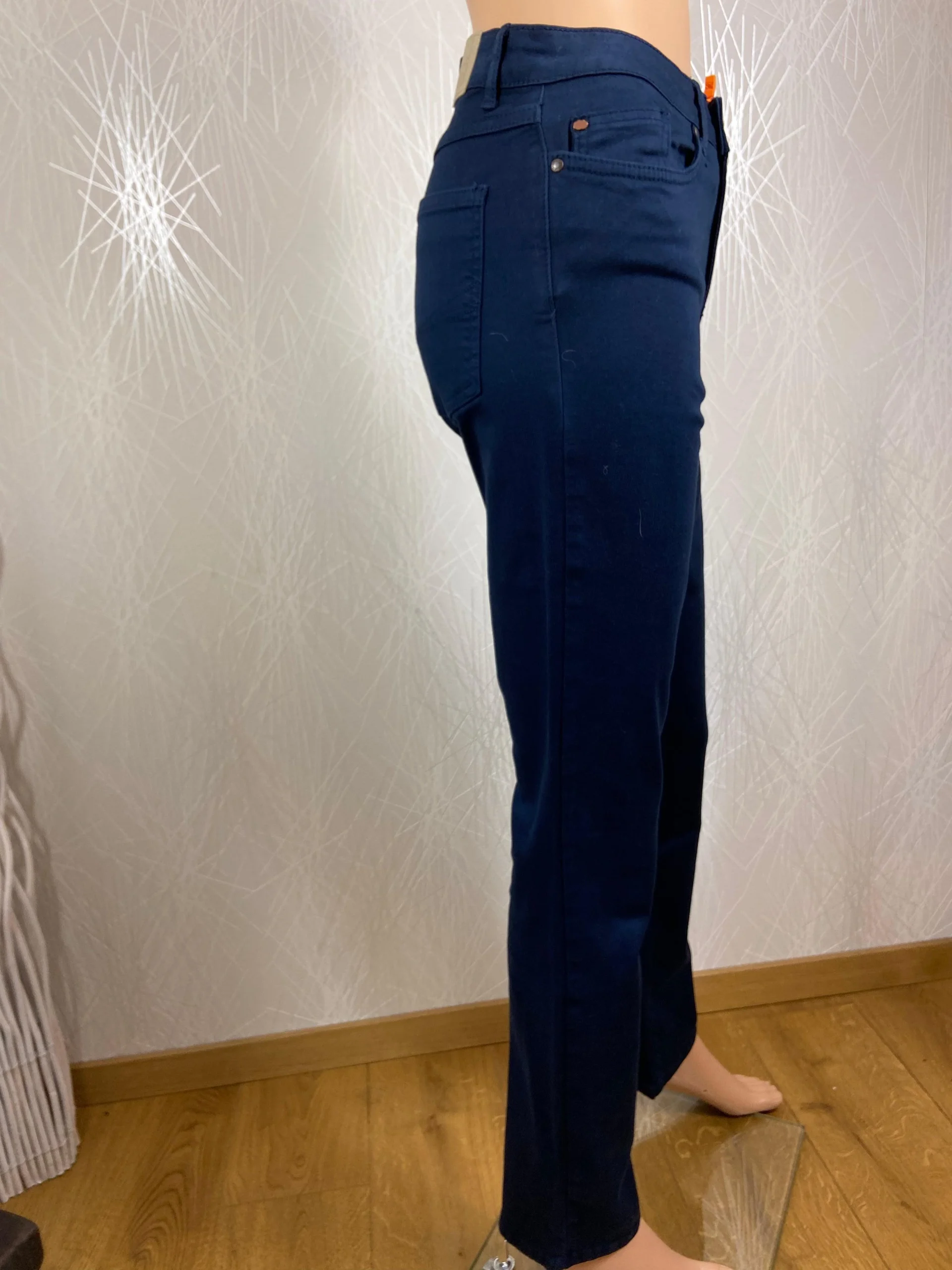 Taille haute, coupe droite, 3 poches à l’avant, 2 poches à l’arrière et fermeture avec zip et bouton.
