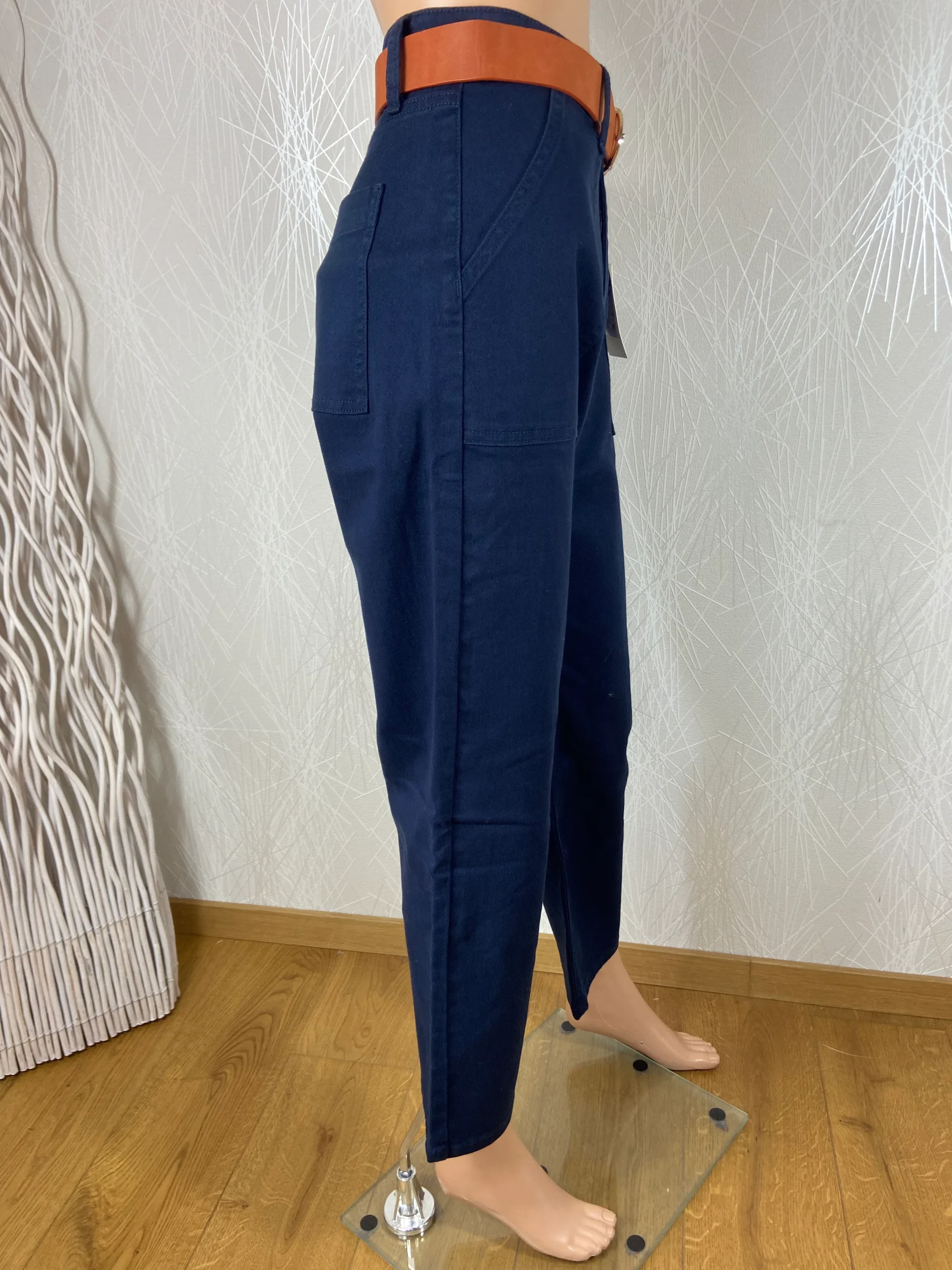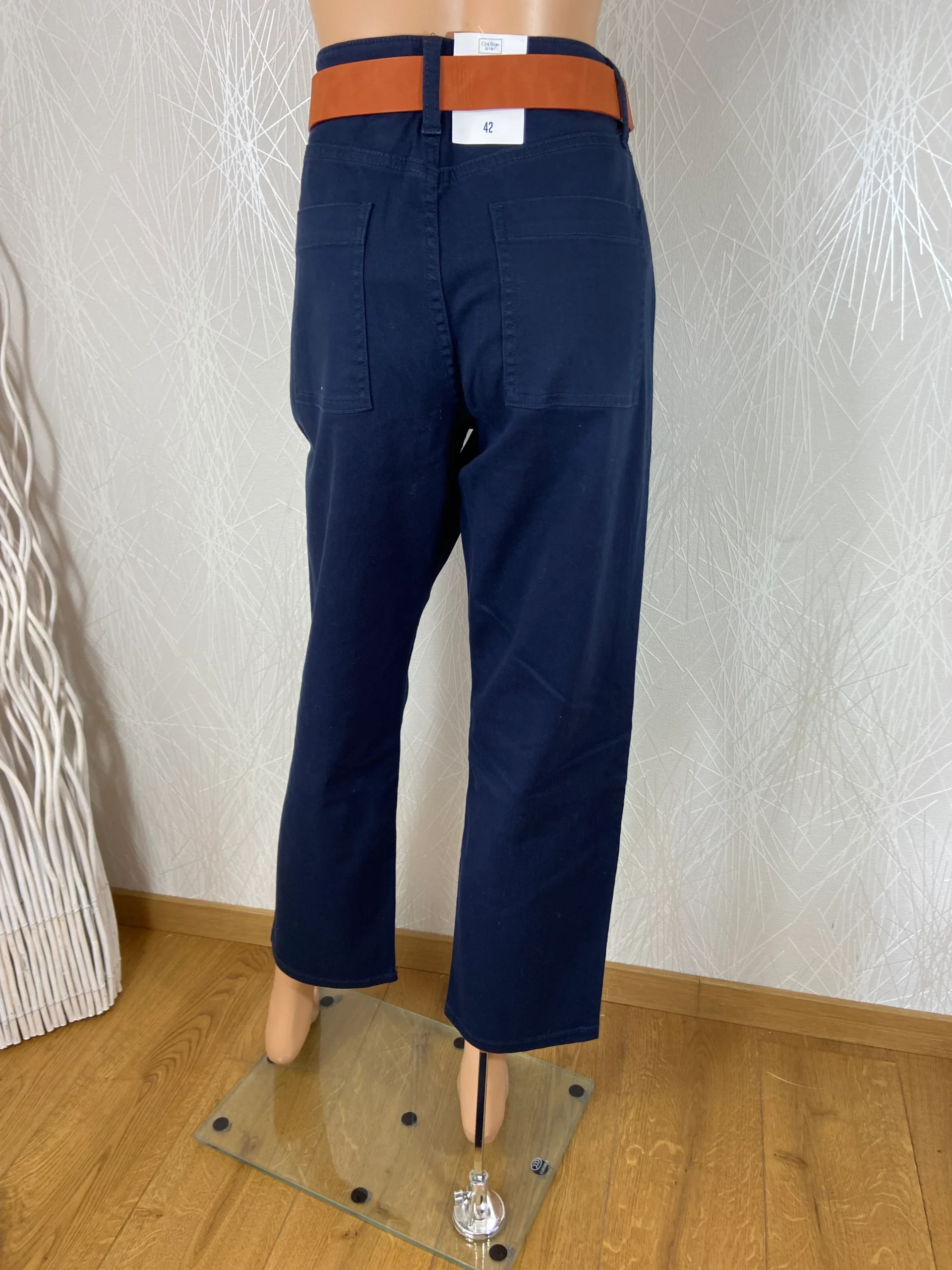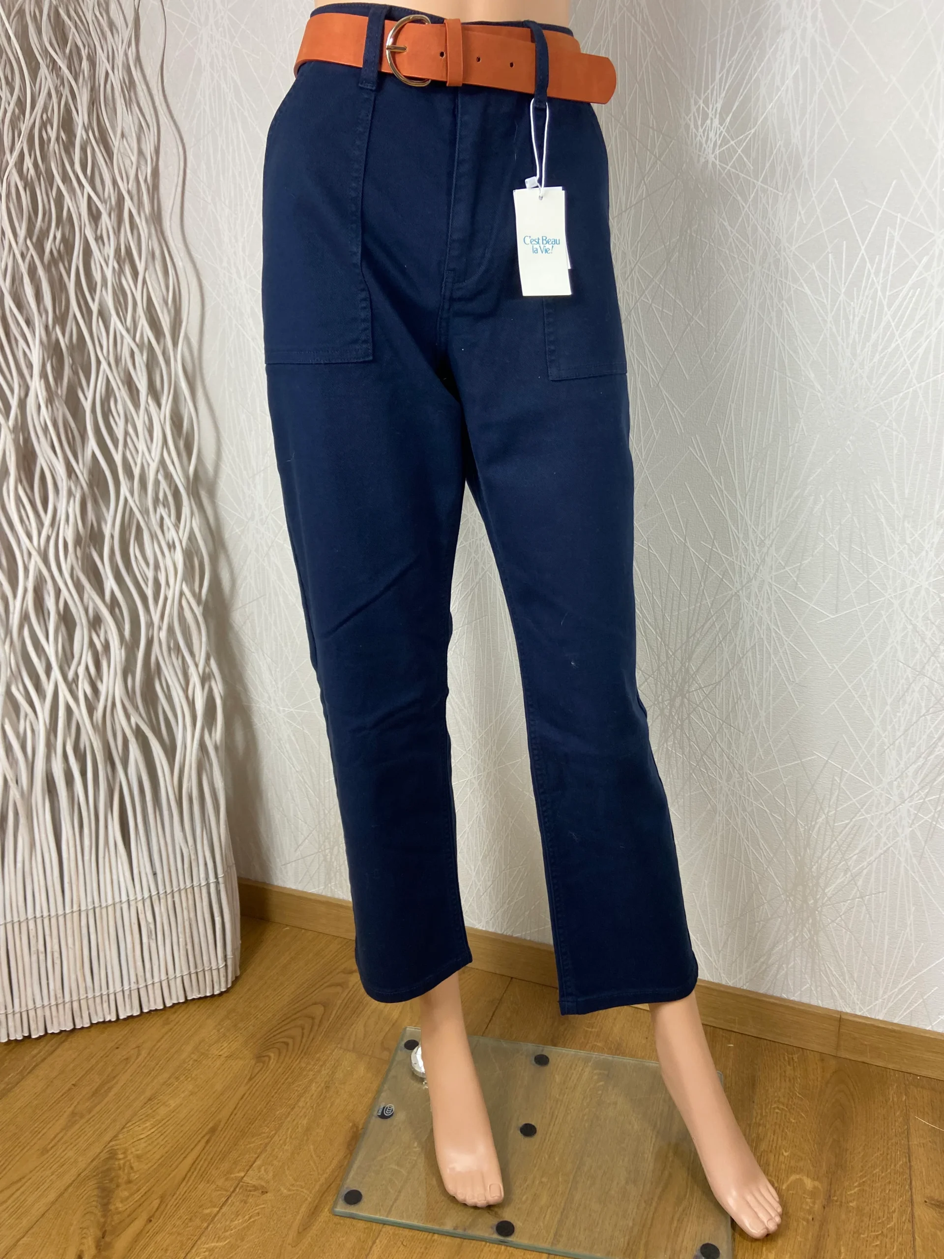 Pantalon pour femme coupe large avec ceinture, tissu sergé coton stretch, taille haute, 2 poches charpentier devant, 2 poches plaquées au dos, jambes légèrement fuselées. Il est vendu avec sa ceinture au toucher suédine et à boucle métal. Composition : 99 % Coton – 1 % élasthanne Couleur: Bleu Marine Valeur en boutique : 65 […]