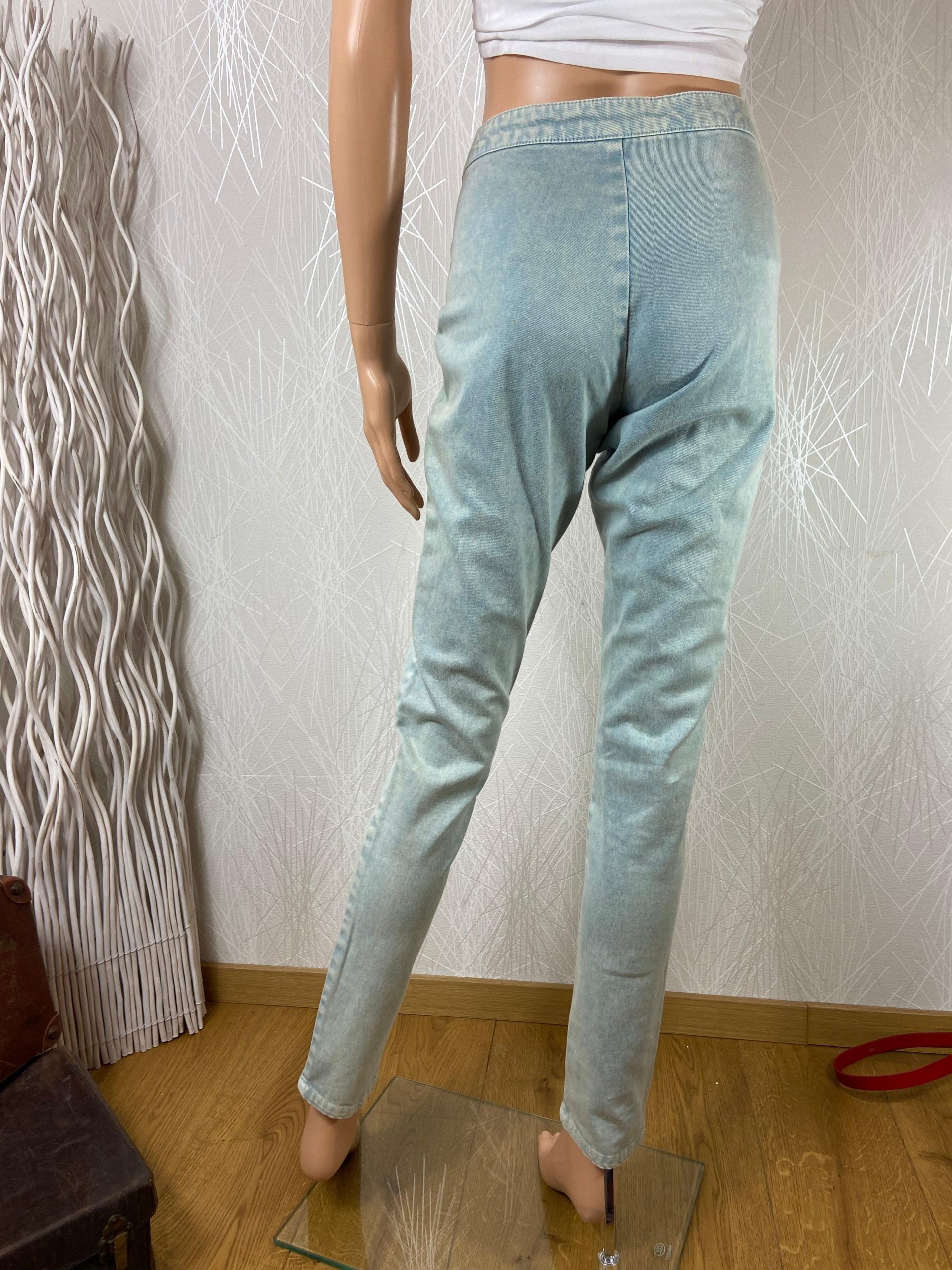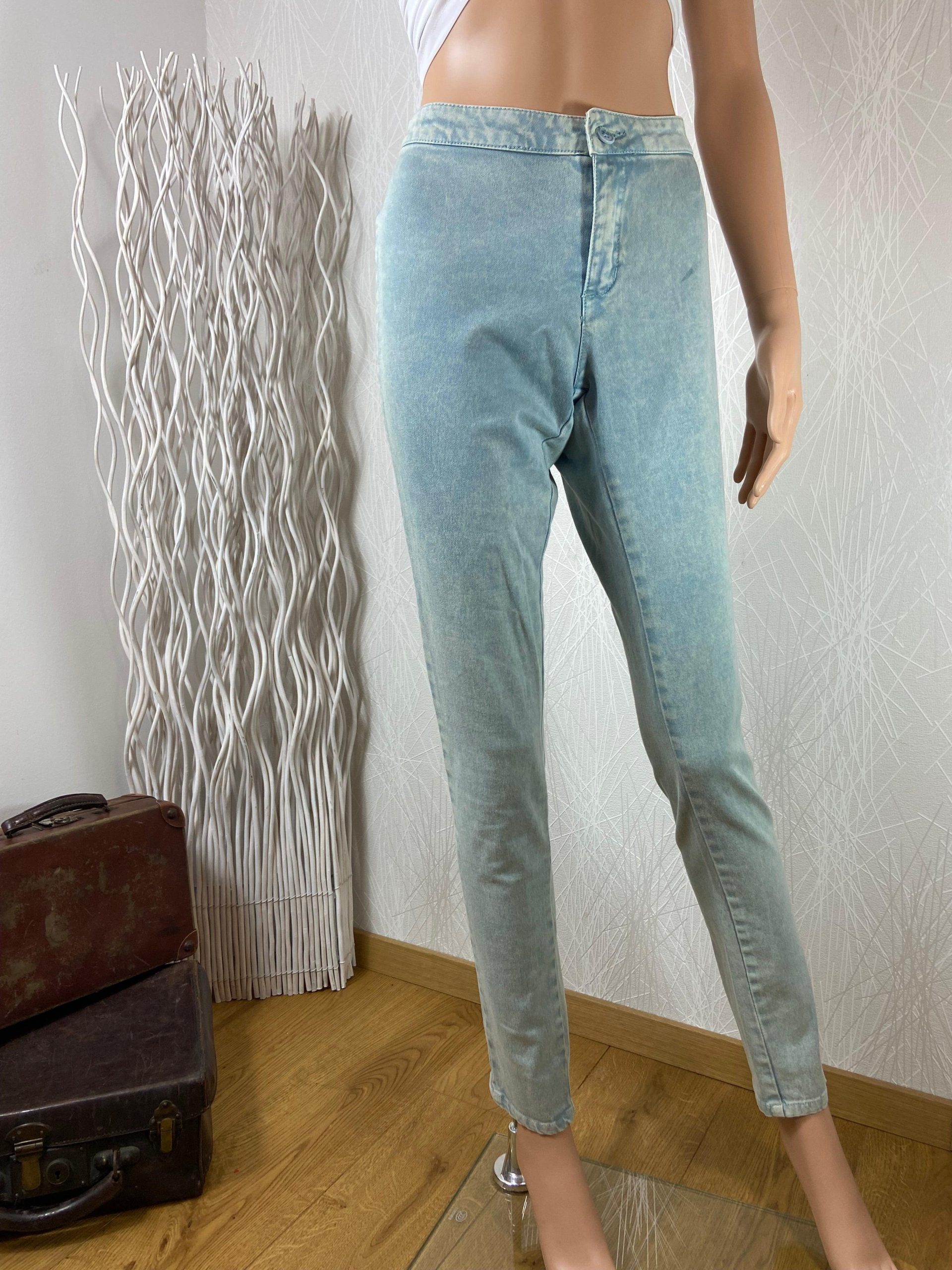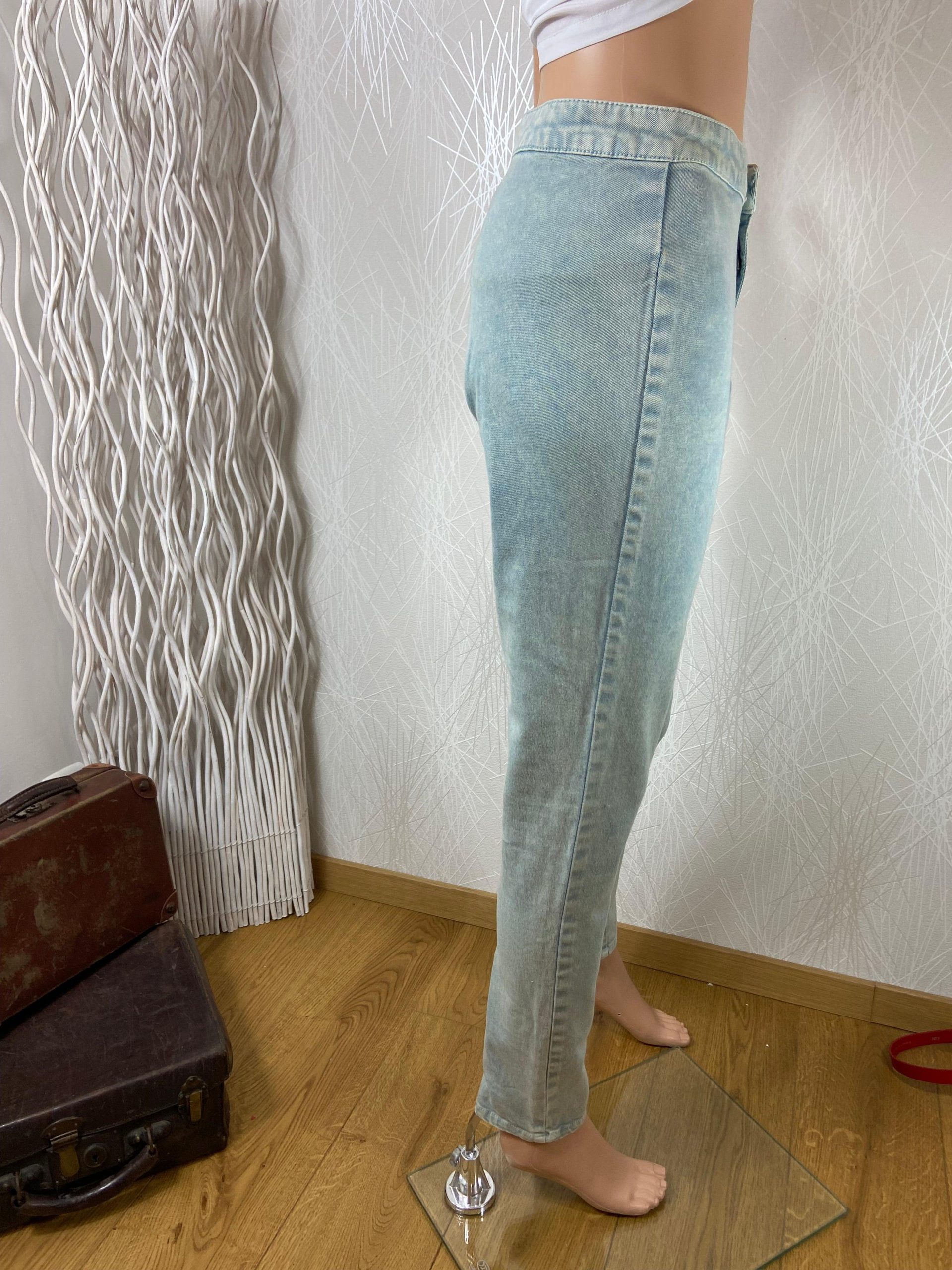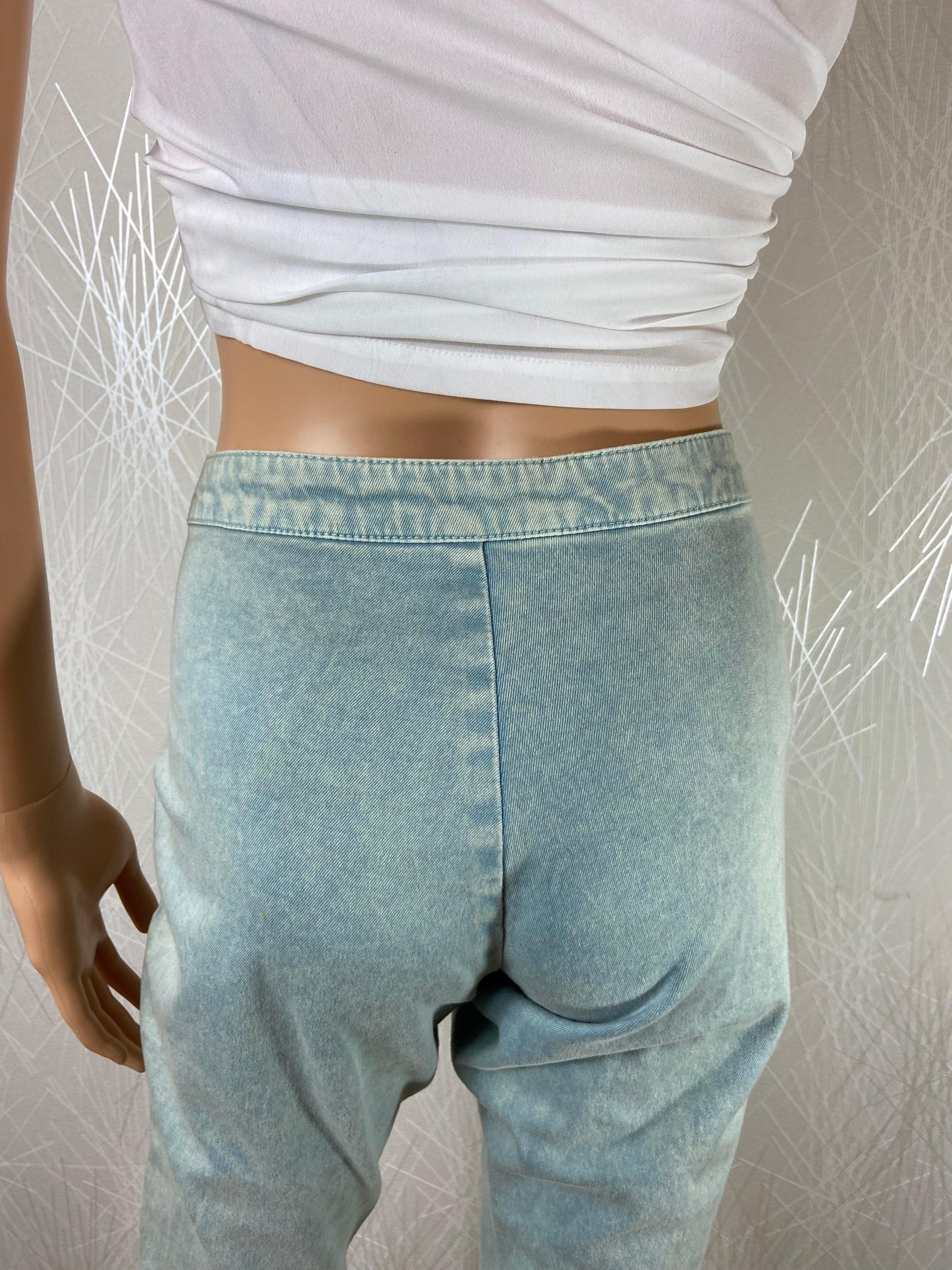 Denim stretch bleu clair délavé, taille normale et coupe slim.