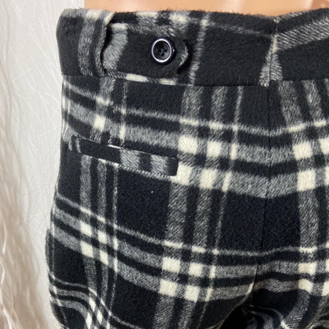Taille haute, coupe droite, tissu à carreaux noir et blanc doublé jusqu’au genou, 2 poches passepoilées décoratives à l’arrière et fermeture bouton et zip.