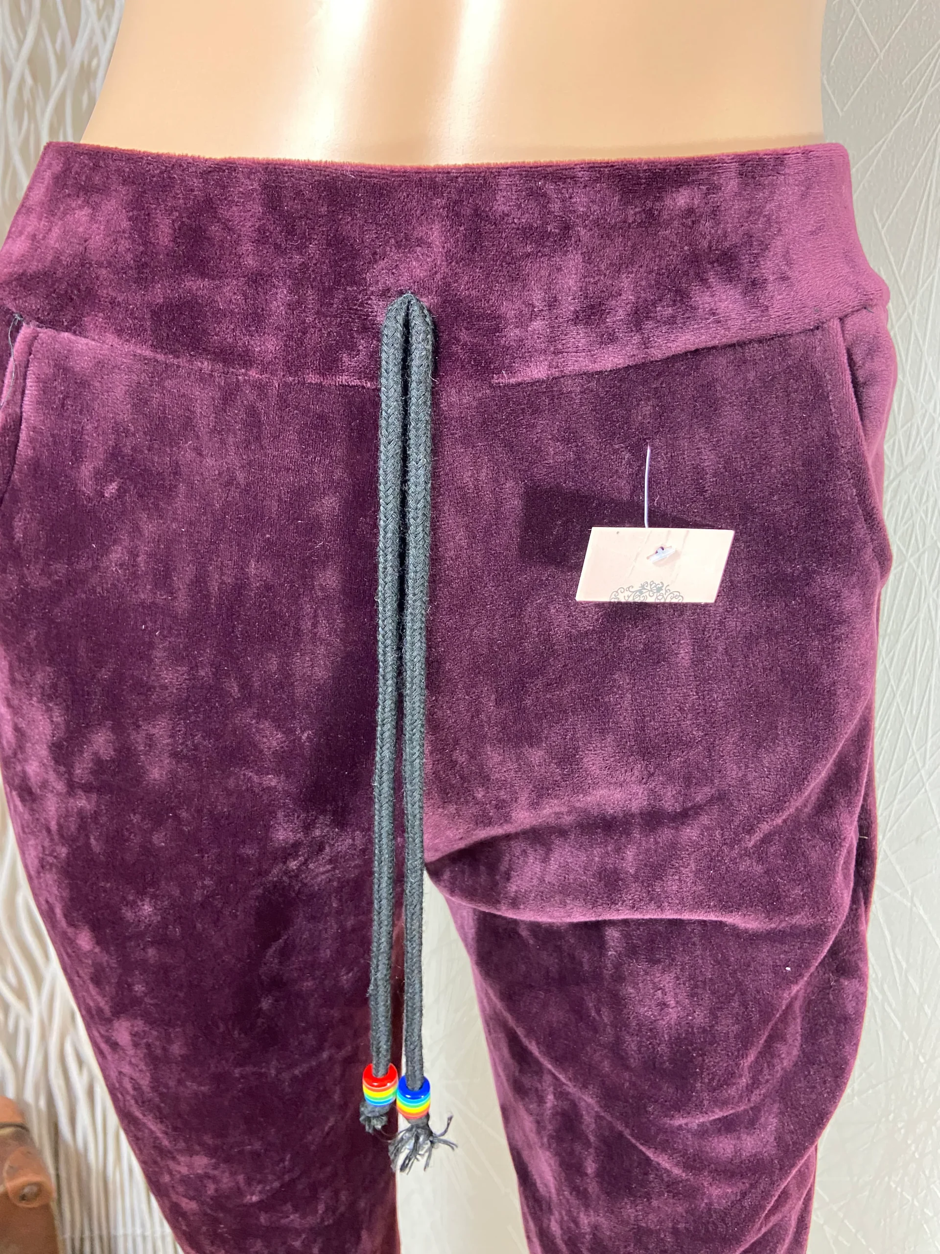 Taille élastique, cordon décoratif à la taille, resserré aux chevilles, taille haute et 2 poches à l’avant.
