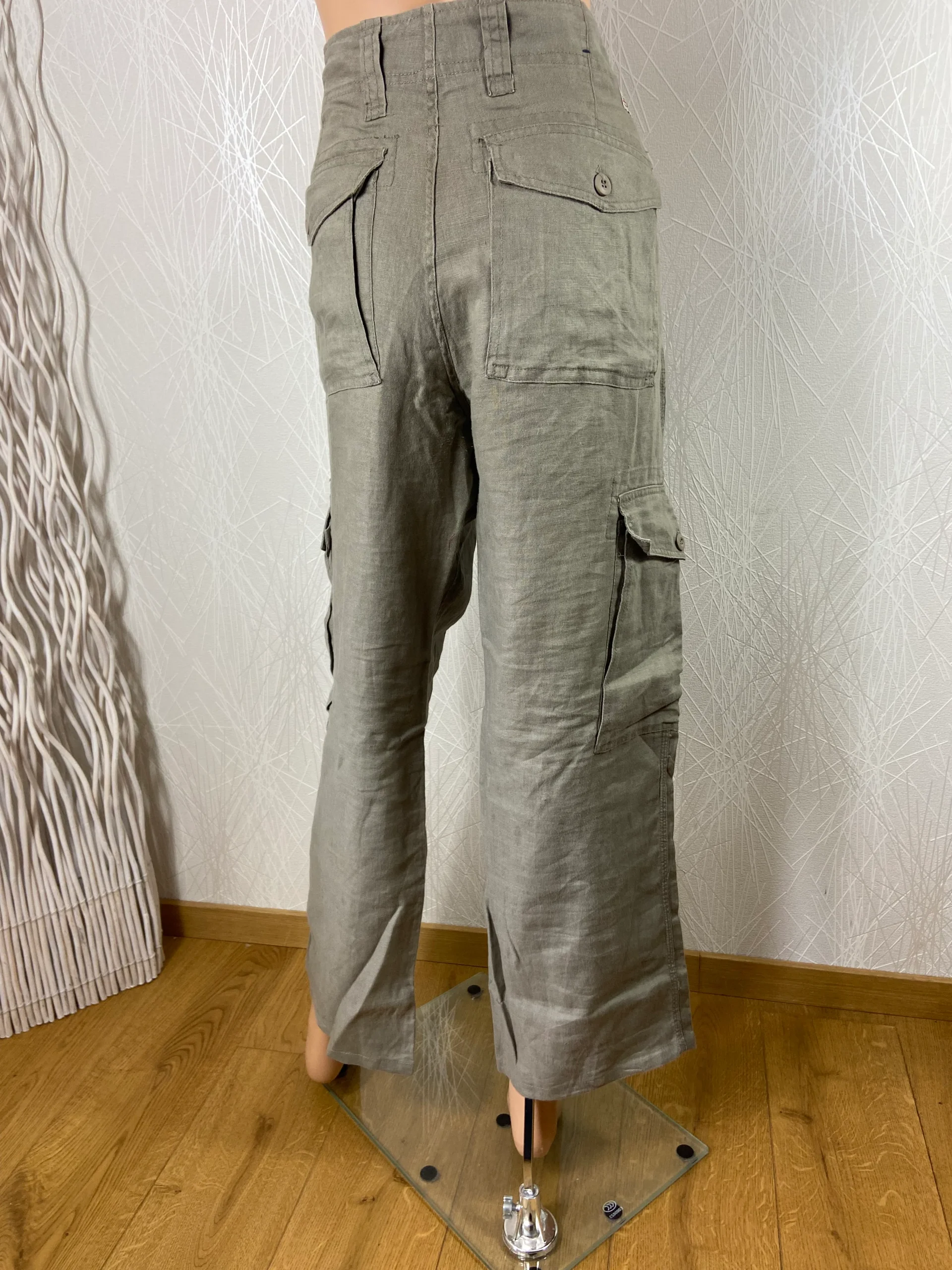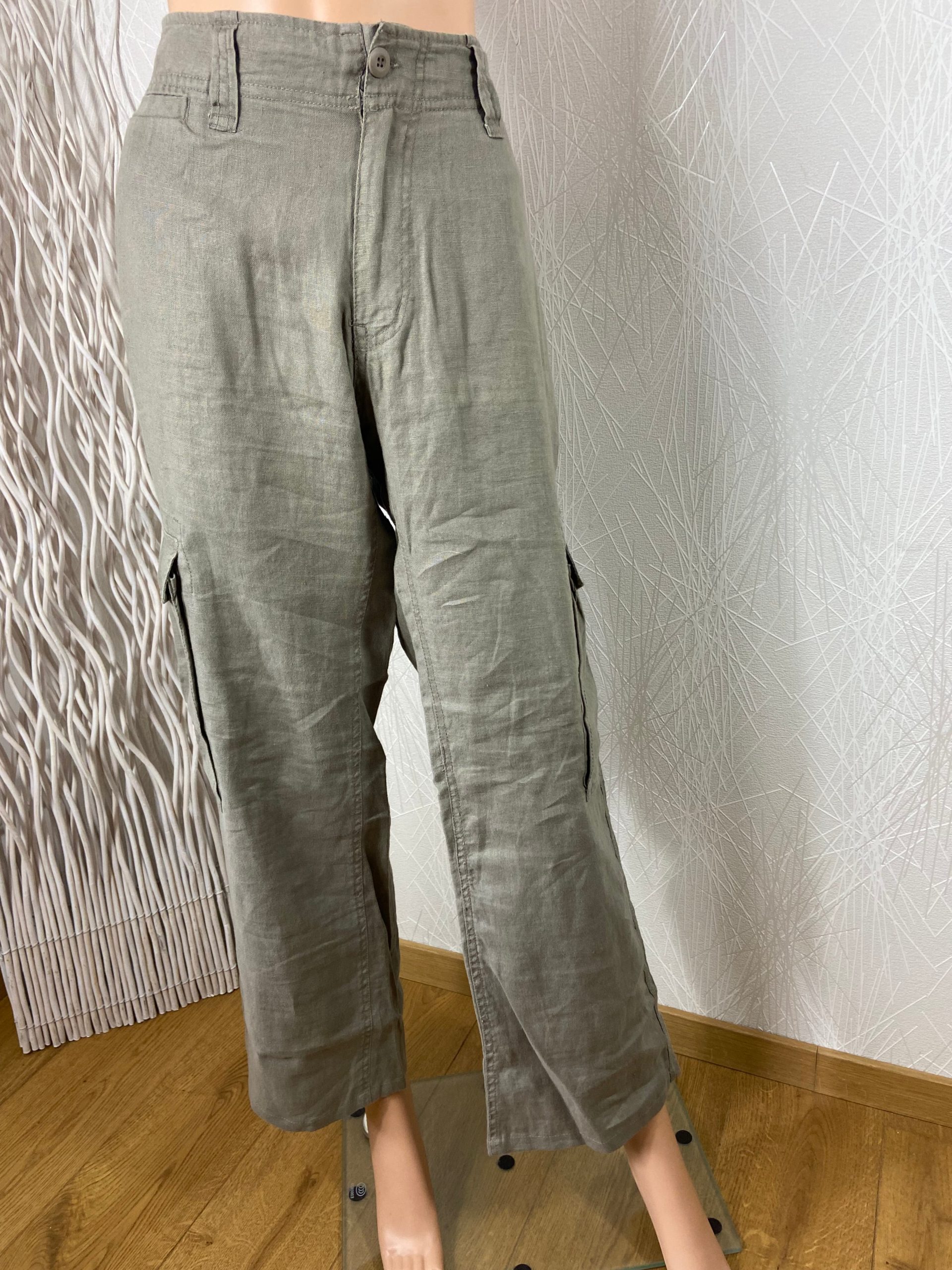Pantalon en lin gris kaki pour femme de la marque H&M. Taille haute, coupe large, 2 poches à l’avant, 2 poches à rabats sur les côtés, fermeture bouton et zip. Matière : 100% lin Couleur : Gris kaki Marque : H&M Taille 5XL / 50 – Réf : 50OP5722 Dimensions : Tour de taille : […]