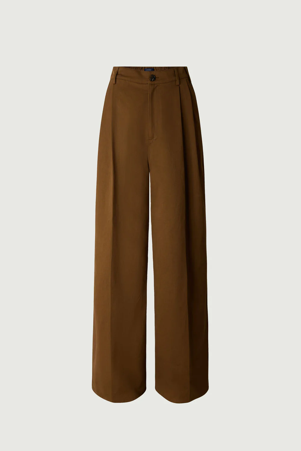 FREJUS est un pantalon à pinces en sergé de coton kaki-bronze. Sa taille cintrée et sa coupe évasée assurent une silhouette élégante. La taille élastiquée au dos garantit un confort optimal.