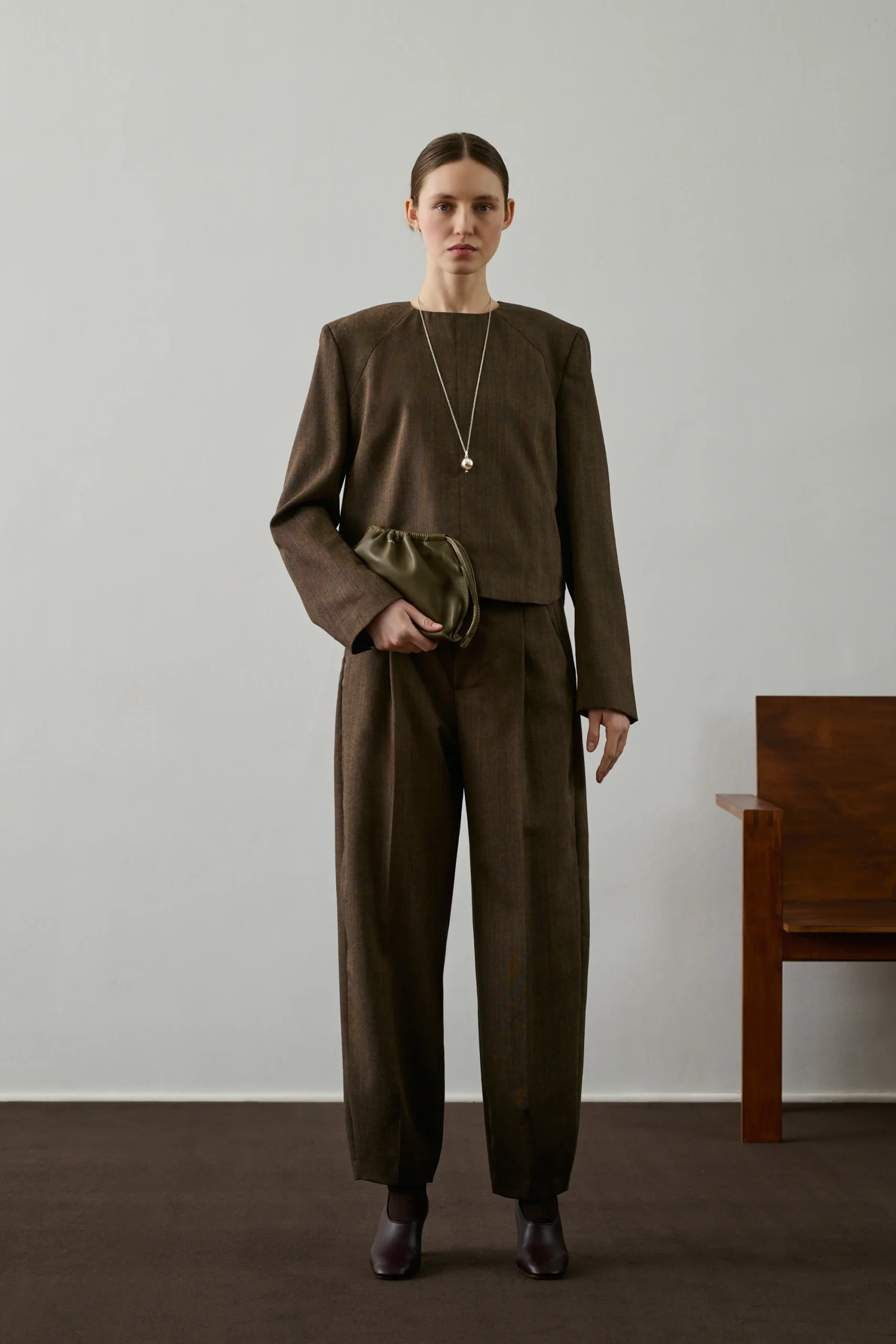 GRAHAM est un pantalon de tailleur en toile de laine vierge, coupe ajustée, longueur cheville. Taille mi-haute, fermeture par crochet et bouton, poches italiennes. Pli marqué, tissu souple, tombé impeccable. – Coupe ajustée– Longueur cheville– Taille mi-haute avec ouverture par crochet et bouton intérieur– Fermeture zippée sous patte– Deux poches italiennes devant, une poche passepoilée […]