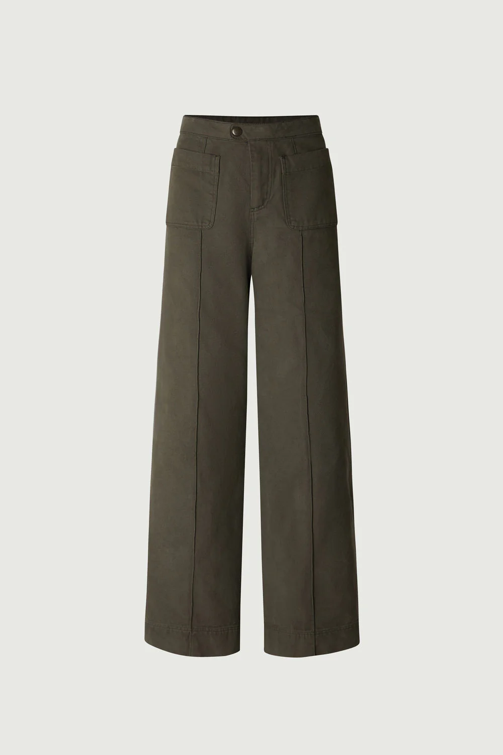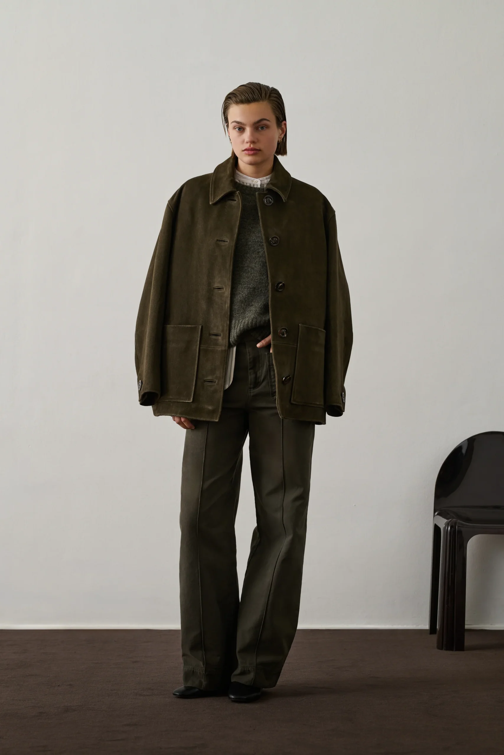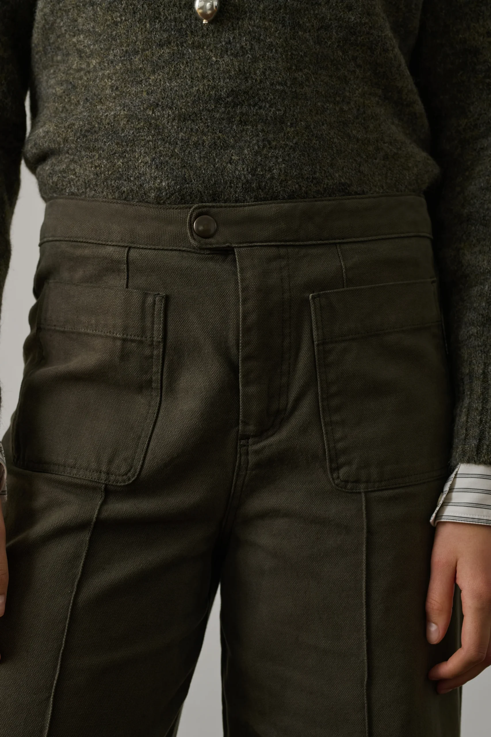 HAROLD est un pantalon iconique du vestiaire Soeur, identifiable par ses poches plaquées à l’avant et à l’arrière et son pli marqué le long de la jambe. Cette version en toile souple et texturée est proposée dans un kaki profond qui se fond dans les teintes de la saison automne-hiver.