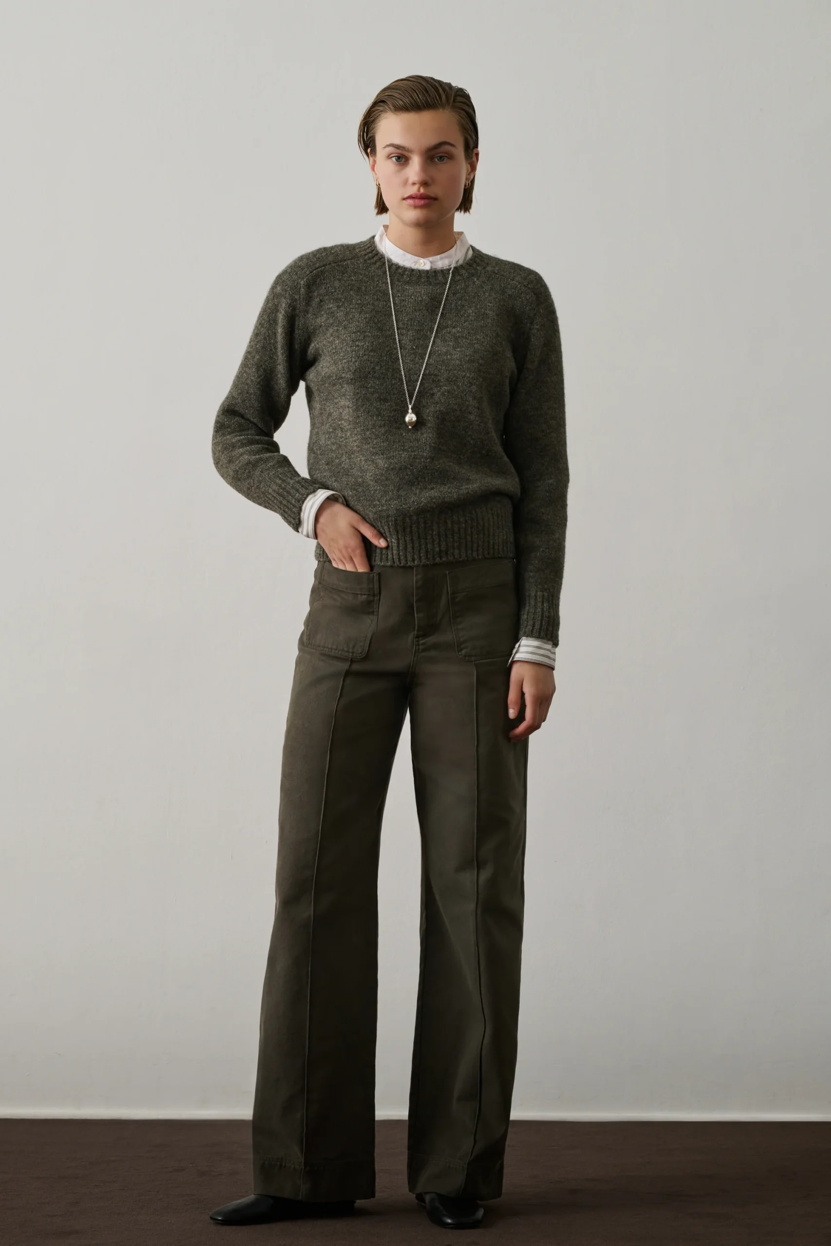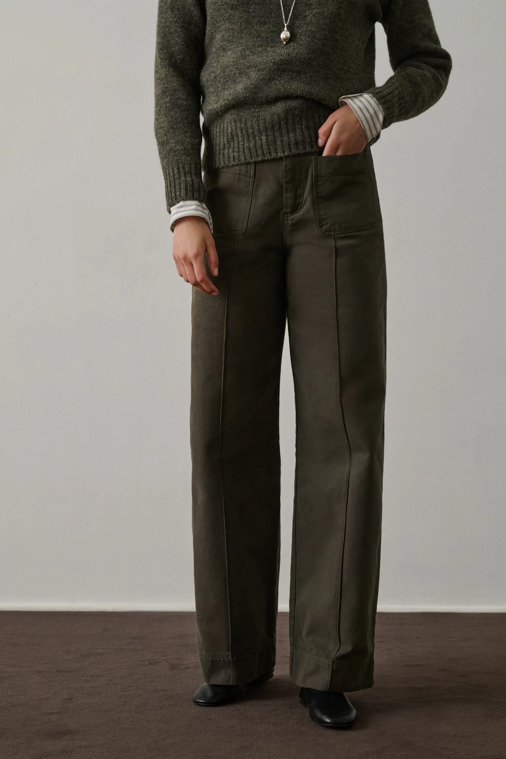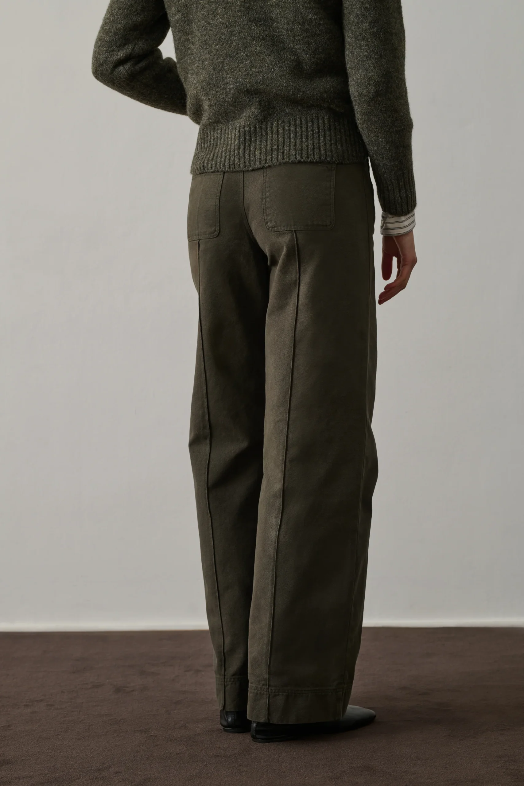 HAROLD est un pantalon iconique du vestiaire Soeur, identifiable par ses poches plaquées à l’avant et à l’arrière et son pli marqué le long de la jambe. Cette version en toile souple et texturée est proposée dans un kaki profond qui se fond dans les teintes de la saison automne-hiver.