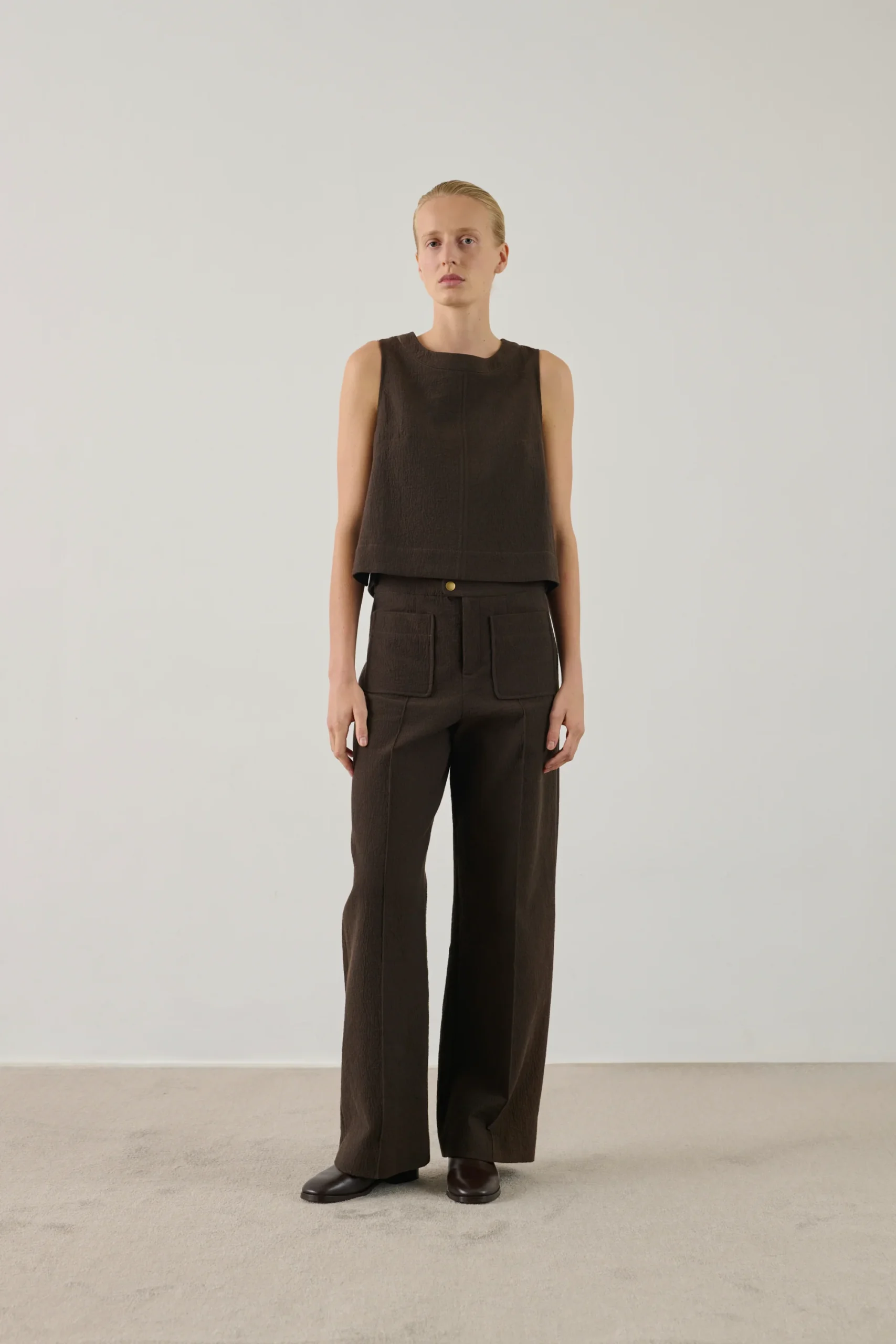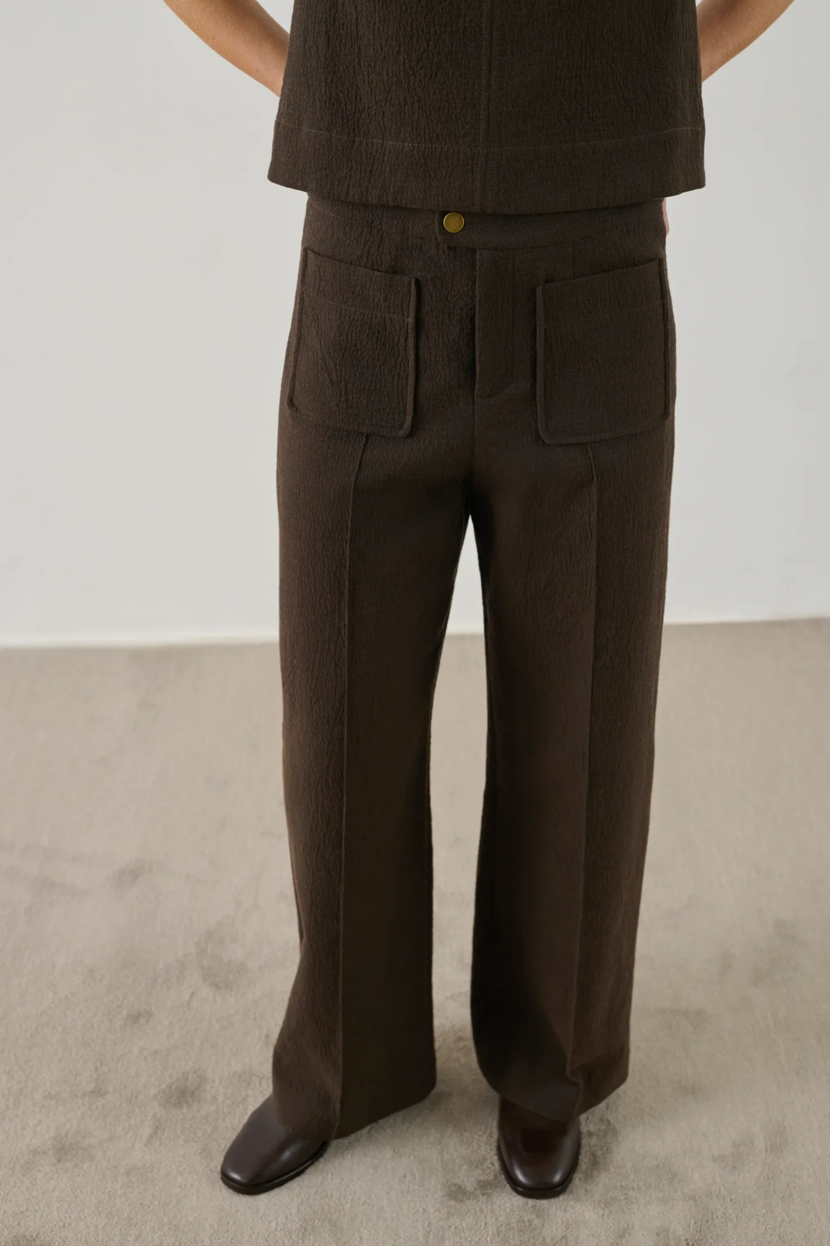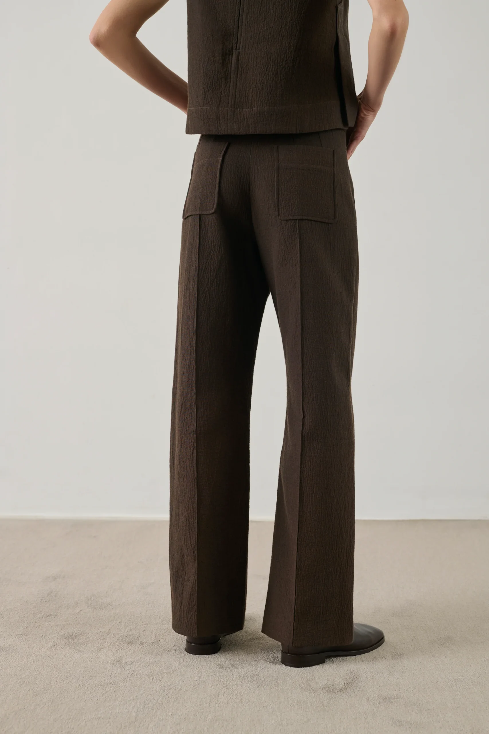 – Coupe droite légèrement évasée – Ouverture zippée et boutonnée à pression – Deux poches plaquées devant et dos – Pli marqué le long de la jambe – Coton gaufré