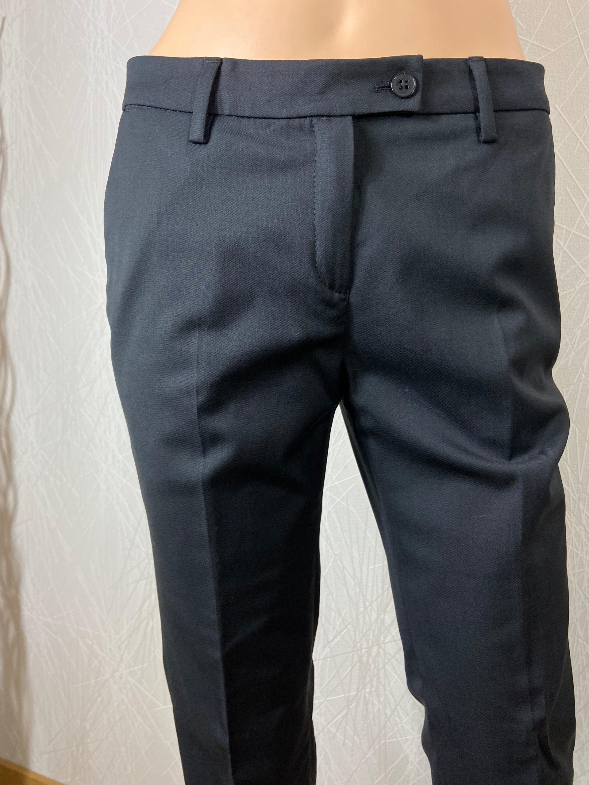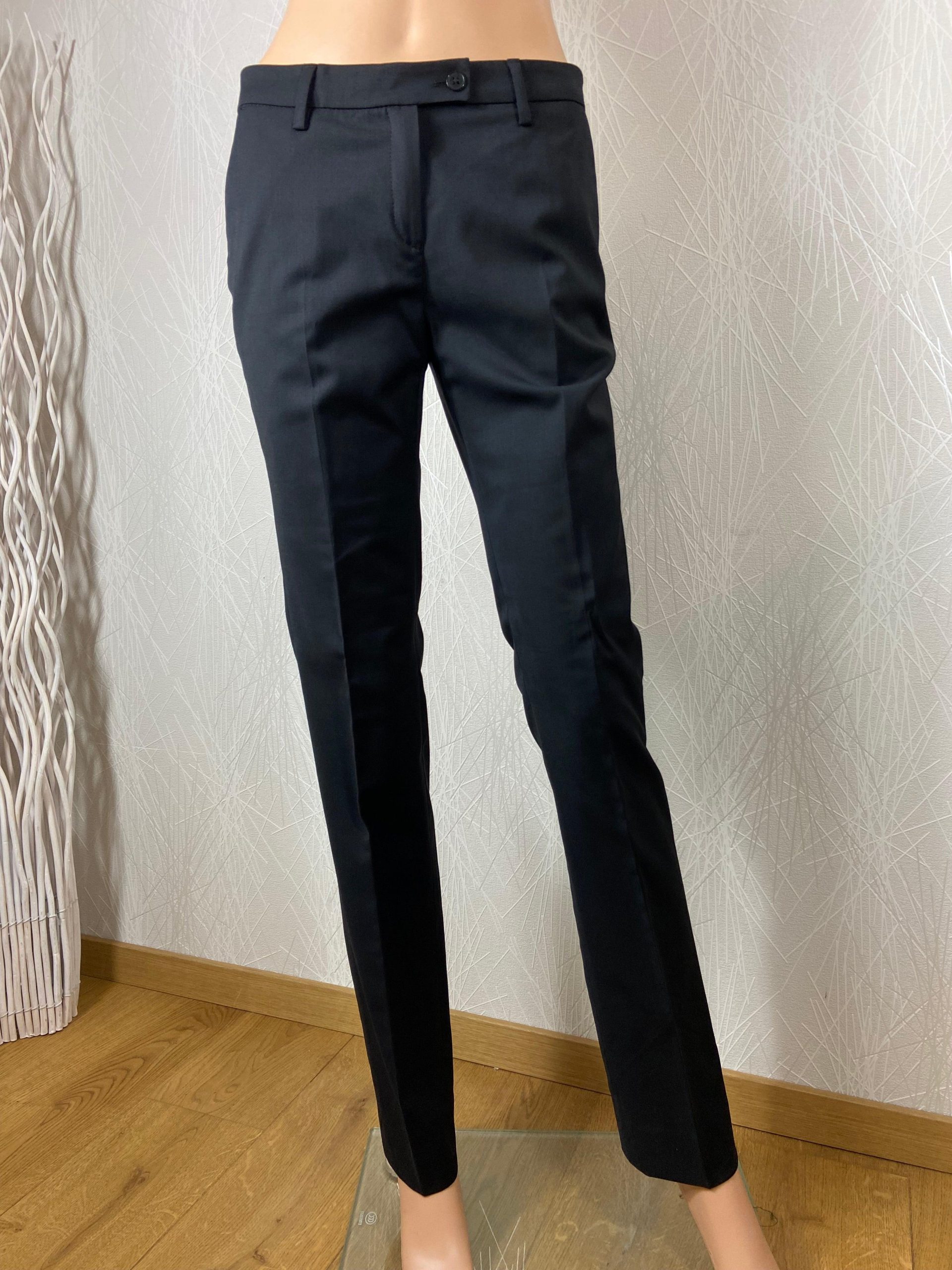 Pantalon doublé à l’avant, taille basse, coupe droite, 2 poches latérales, 2 poches passepoilées décoratives à l’arrière, fermeture avec crochet, zip et 2 boutons.
