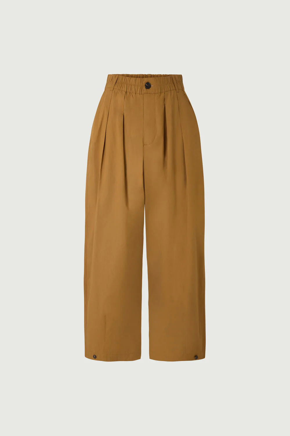 – Coupe ample, arrondie et légèrement étroite en bas de jambe – Taille élastiquée – Ouverture boutonnée et zippée devant – Deux poches côtés et deux poches dos passepoilées – Pinces devant et dos