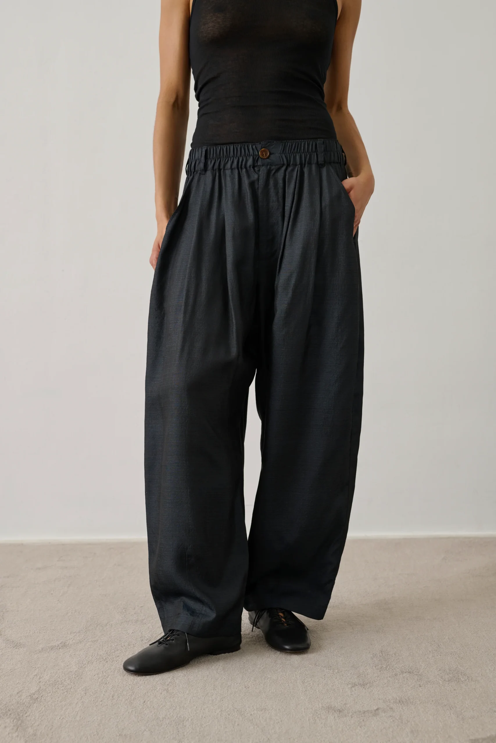 – Coupe ample, arrondie et légèrement étroite en bas de jambe – Taille élastiquée – Ouverture boutonnée et zippée devant – Deux poches côtés et deux poches dos passepoilées