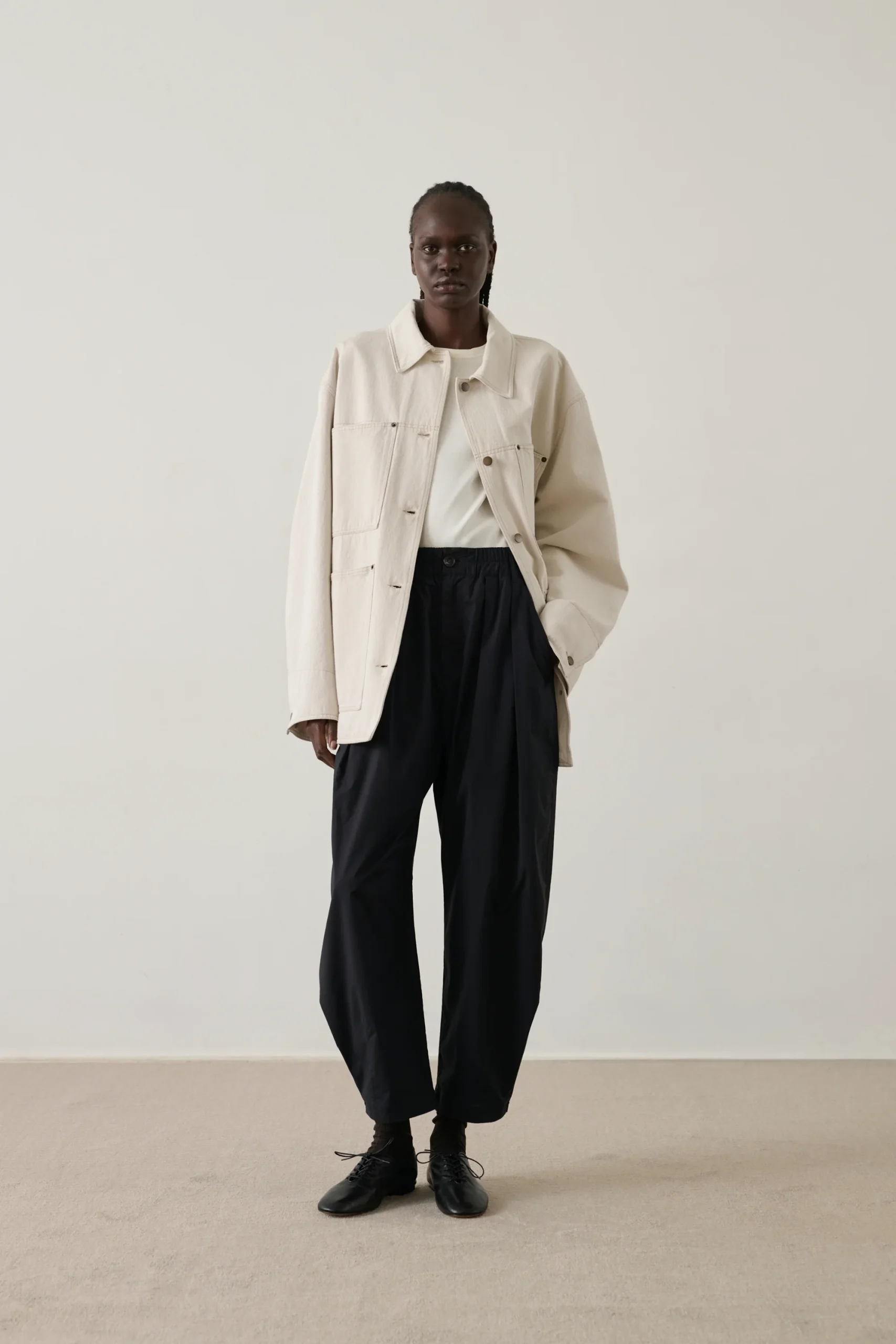 – Coupe ample, arrondie et légèrement étroite en bas de jambe