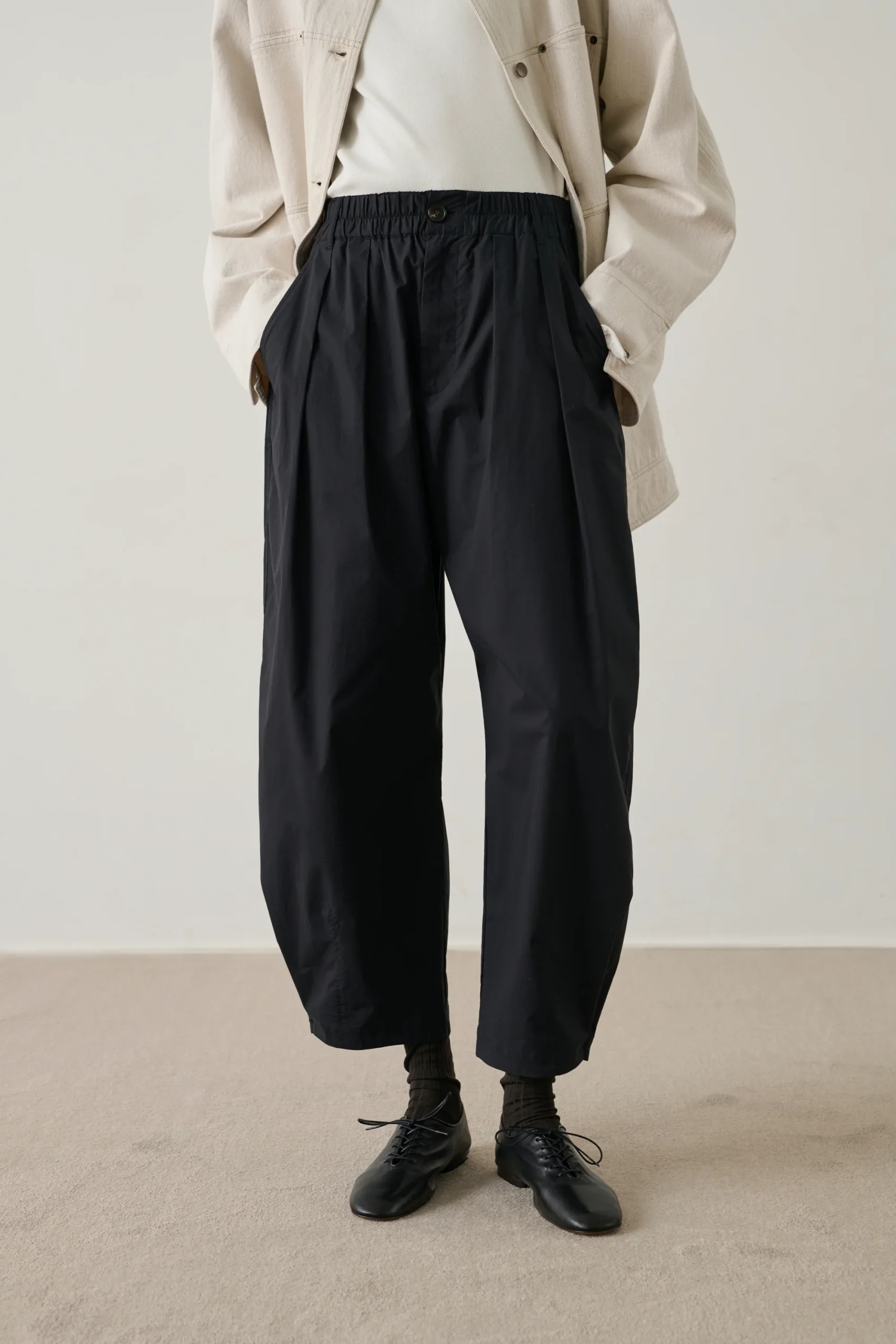 – Coupe ample, arrondie et légèrement étroite en bas de jambe– Taille élastiquée– Ouverture boutonnée et zippée devant– Deux poches côtés et deux poches dos passepoilées– Pinces devant et dos– Popeline de coton