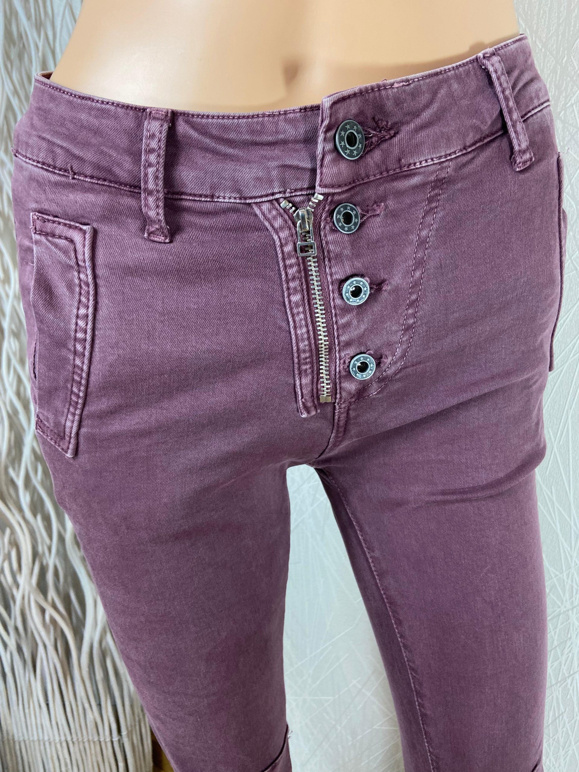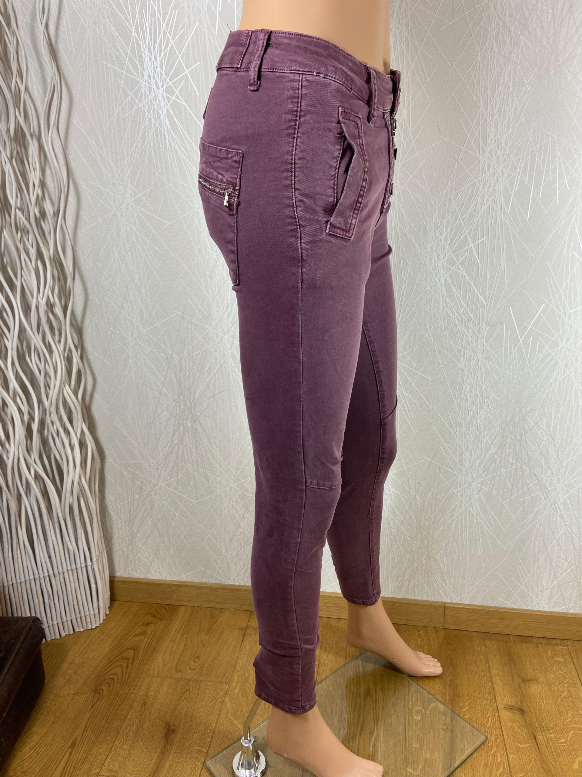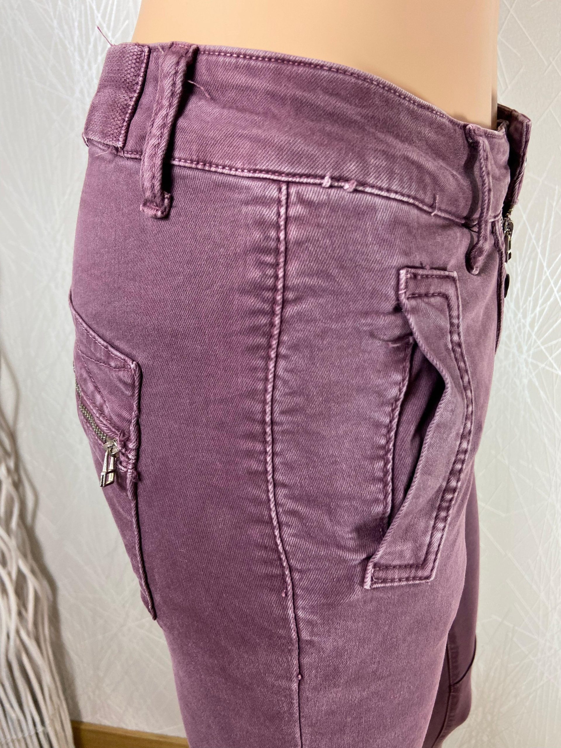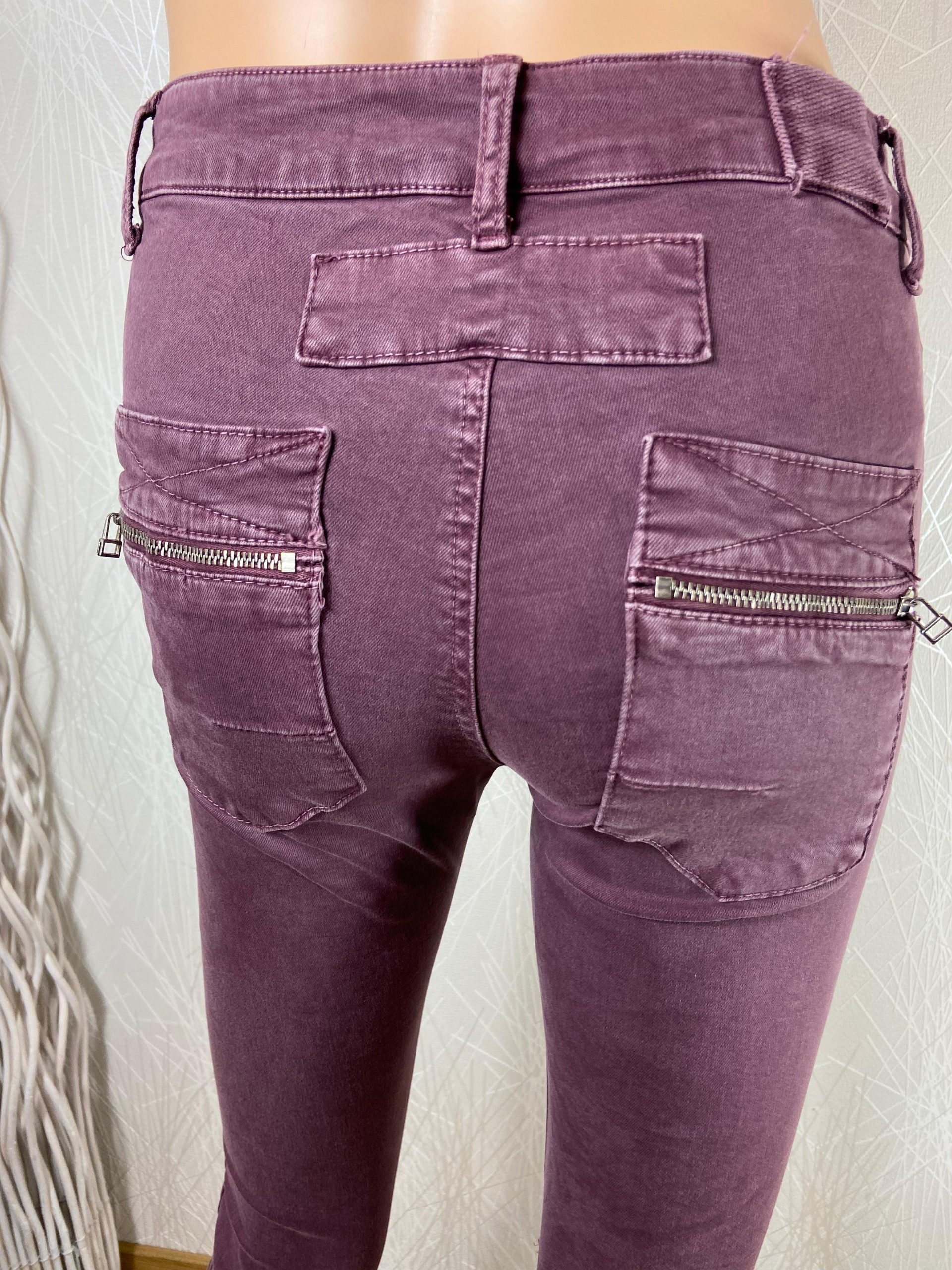 Taille mi-haute, coupe près du corps, 2 poches à l’avant, 2 poches à l’arrière, fermeture avec boutons et zip.