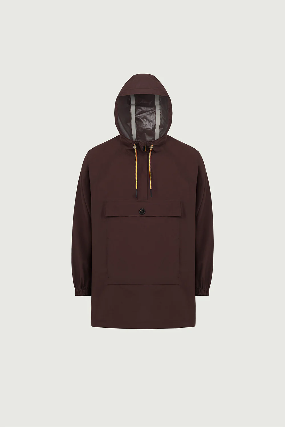 Les détails pratiques ne manquent pas : une large poche centrale à rabat pour l’essentiel, un demi zip devant pour l’enfilage, et des cordons contrastés au col et à la capuche pour ajuster le volume selon l’envie.