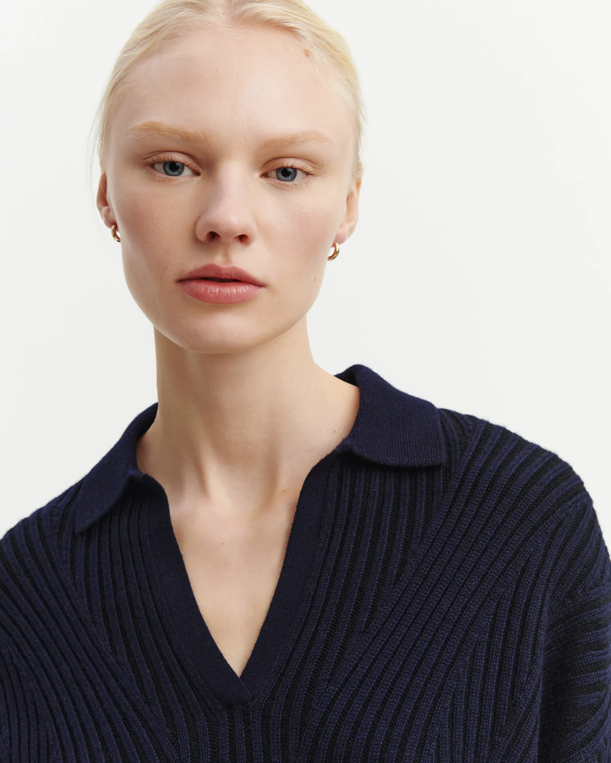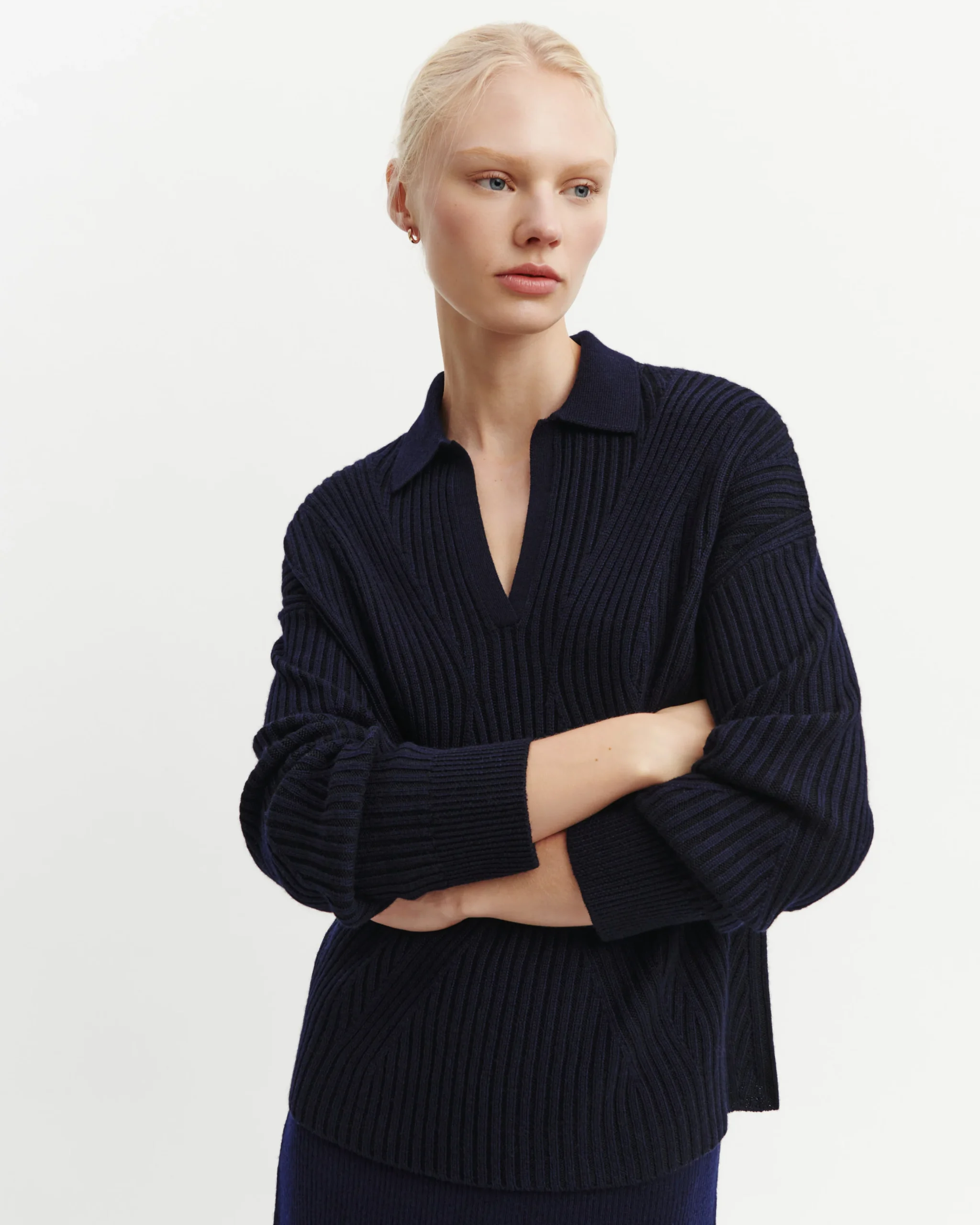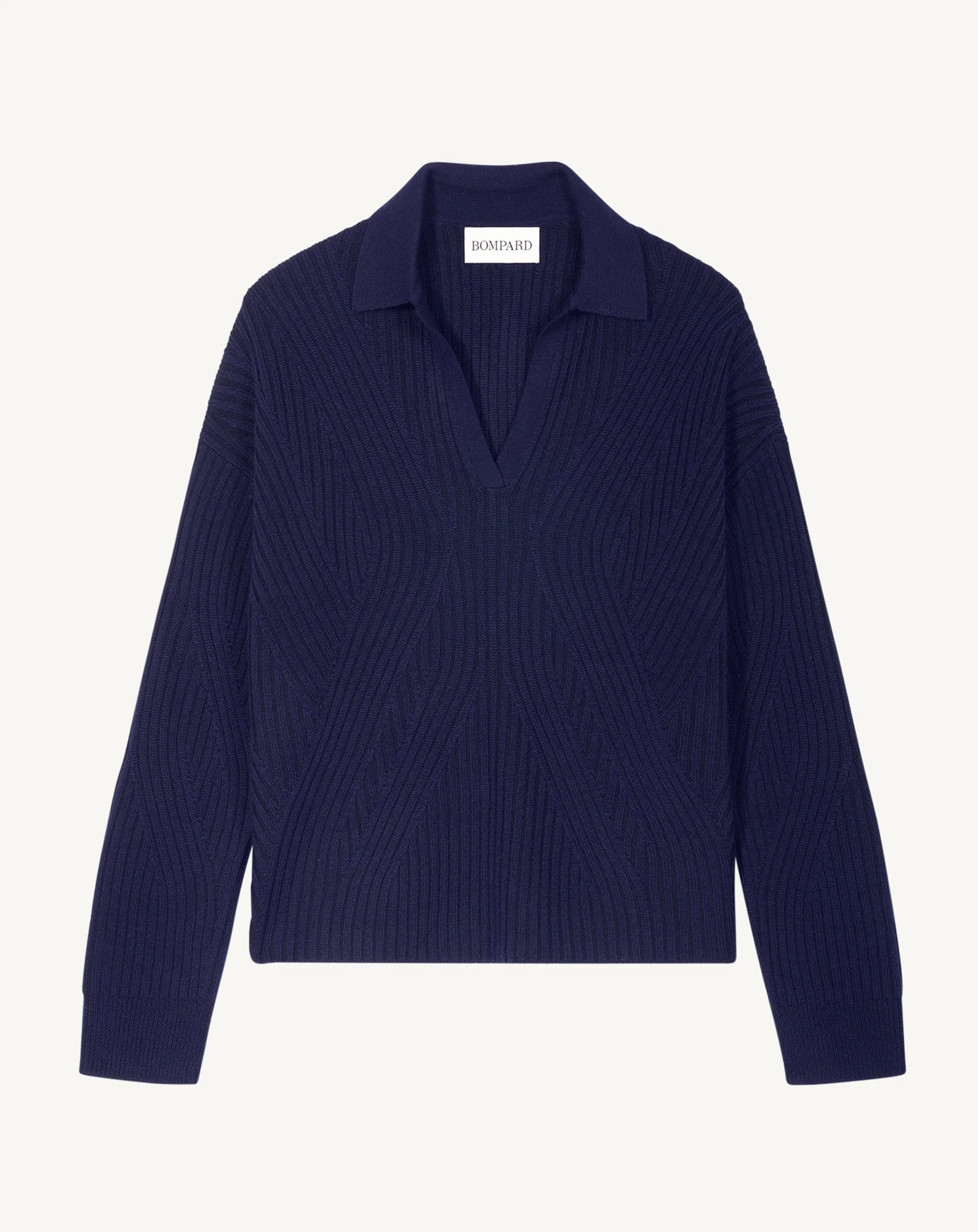 Pull à encolure polo doté d’un jeu de côtes bicolore vanisées sur les côtés. Coupe ample et manches longues pour une silhouette décontractée.