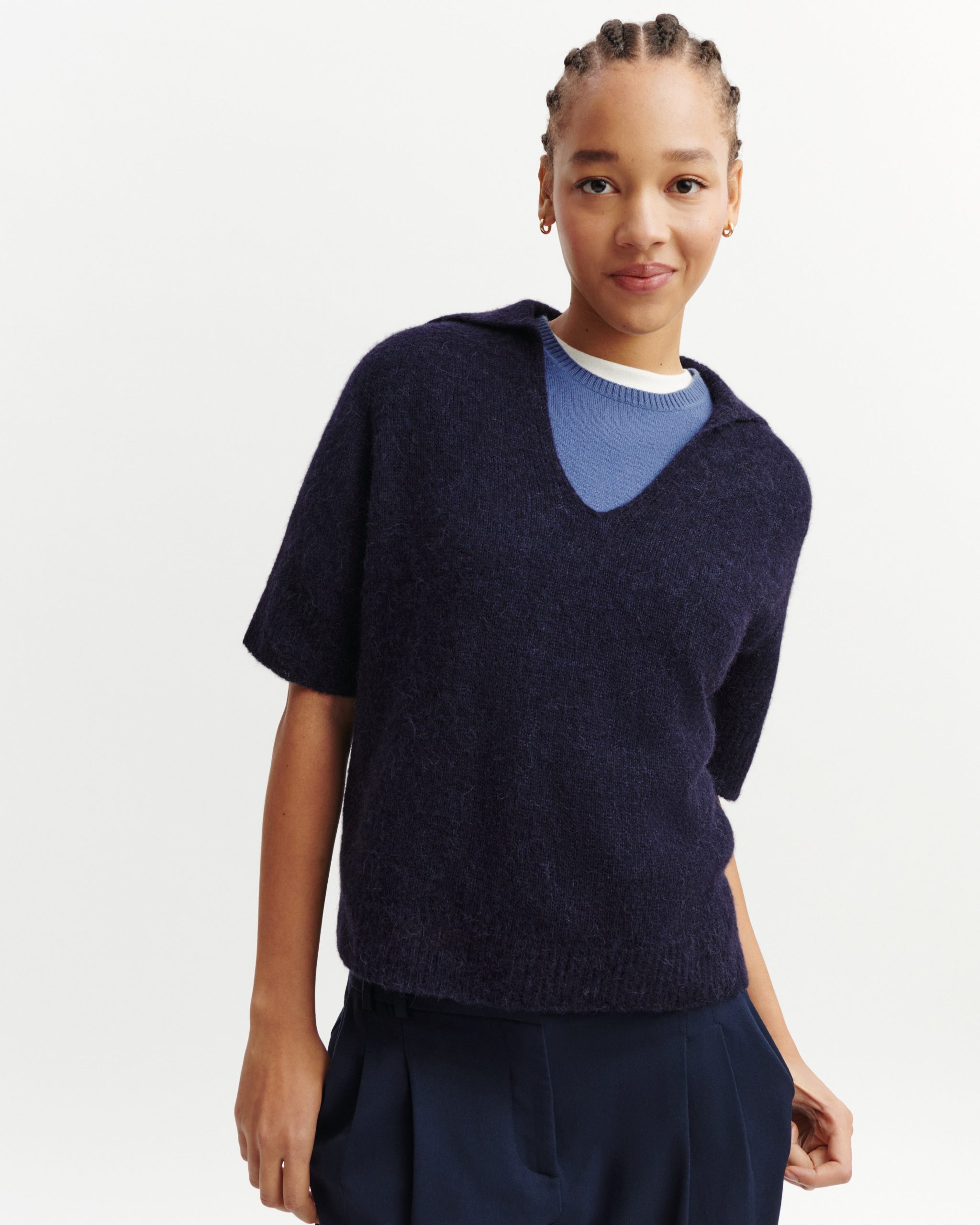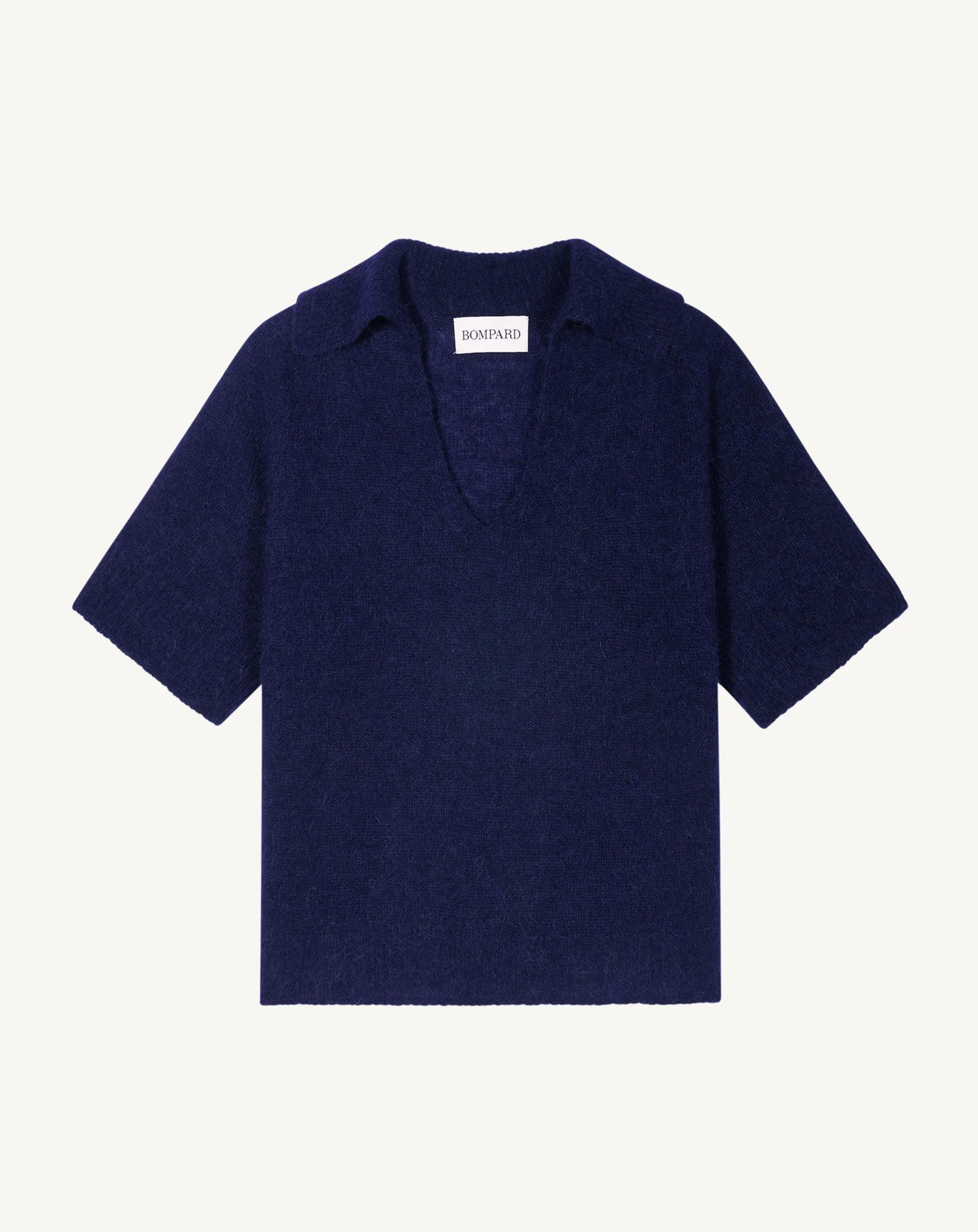 Polo féminin en maille légère, alliance précieuse de cachemire, soie et baby alpaga. Silhouette ample et raffinée, rehaussée d’une maille plume aérienne.