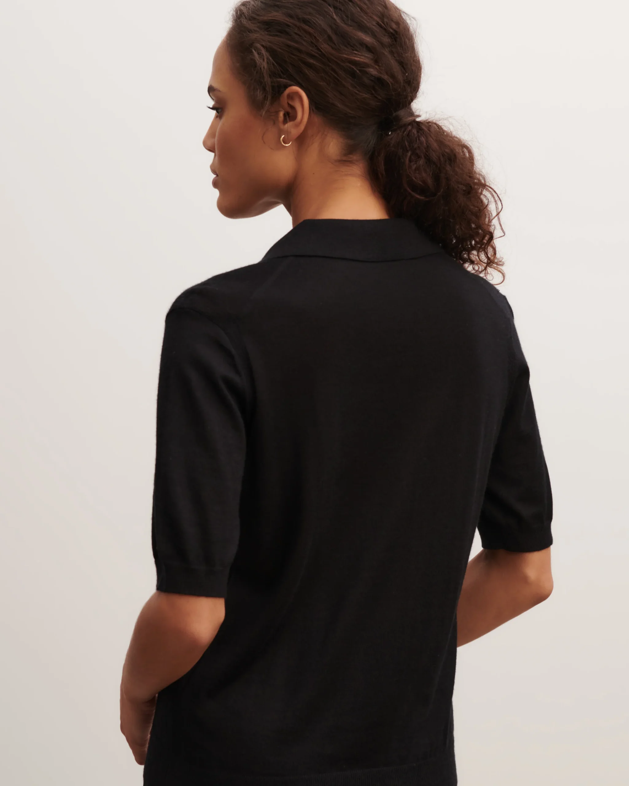 Polo femme en jersey ultrafin de cachemire et soie. Modèle à col boutonné, manches courtes et coupe ajustée.