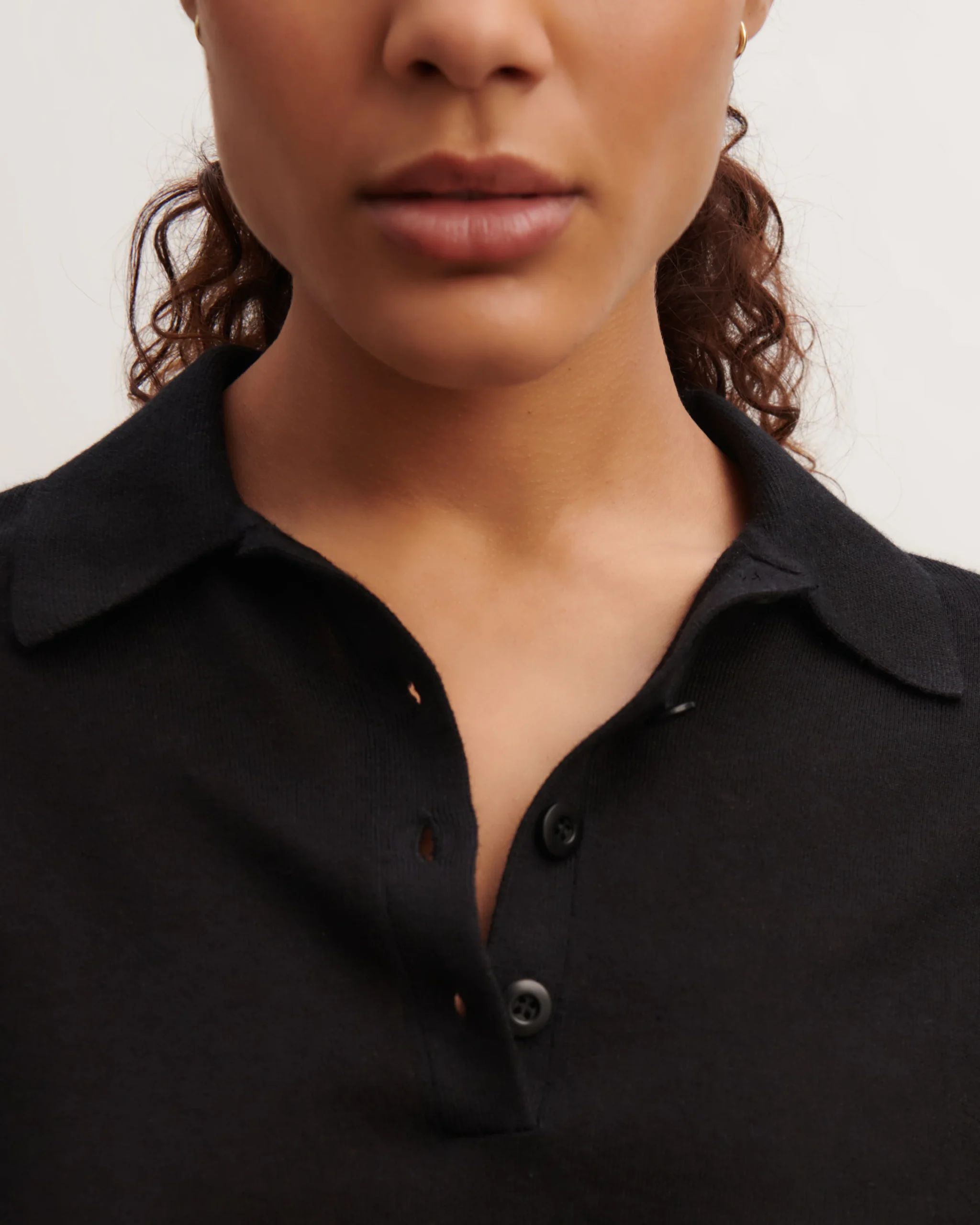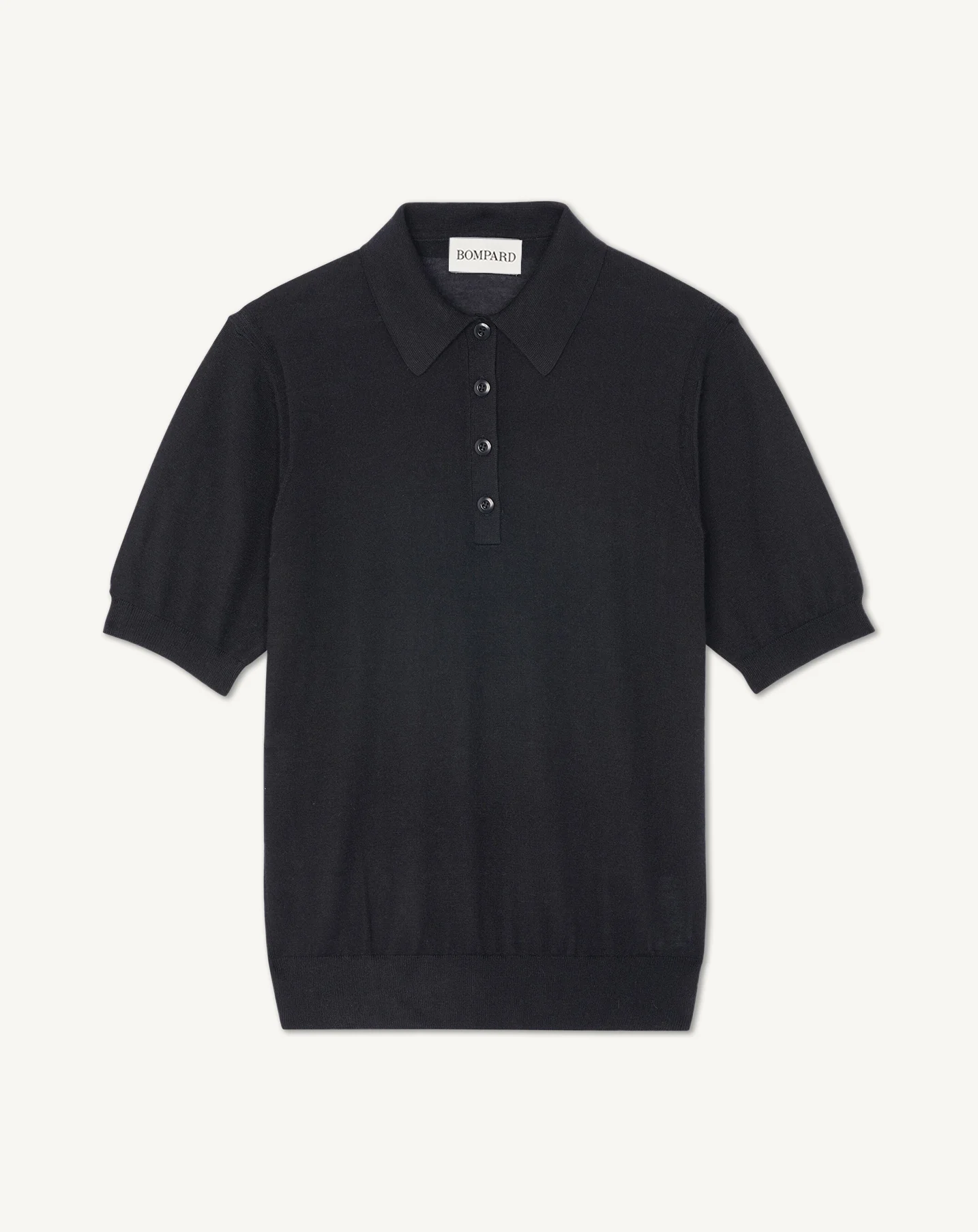 Polo femme en jersey ultrafin de cachemire et soie. Modèle à col boutonné, manches courtes et coupe ajustée. – Polo ultrafin 70% cachemire 30% soie– Polo femme– Coupe près du corps– Longueur classique – Emmanchure droite– Manches courtes – 4 boutons col en corozo – Finitions côtelées aux manches et sur le bas du vêtement