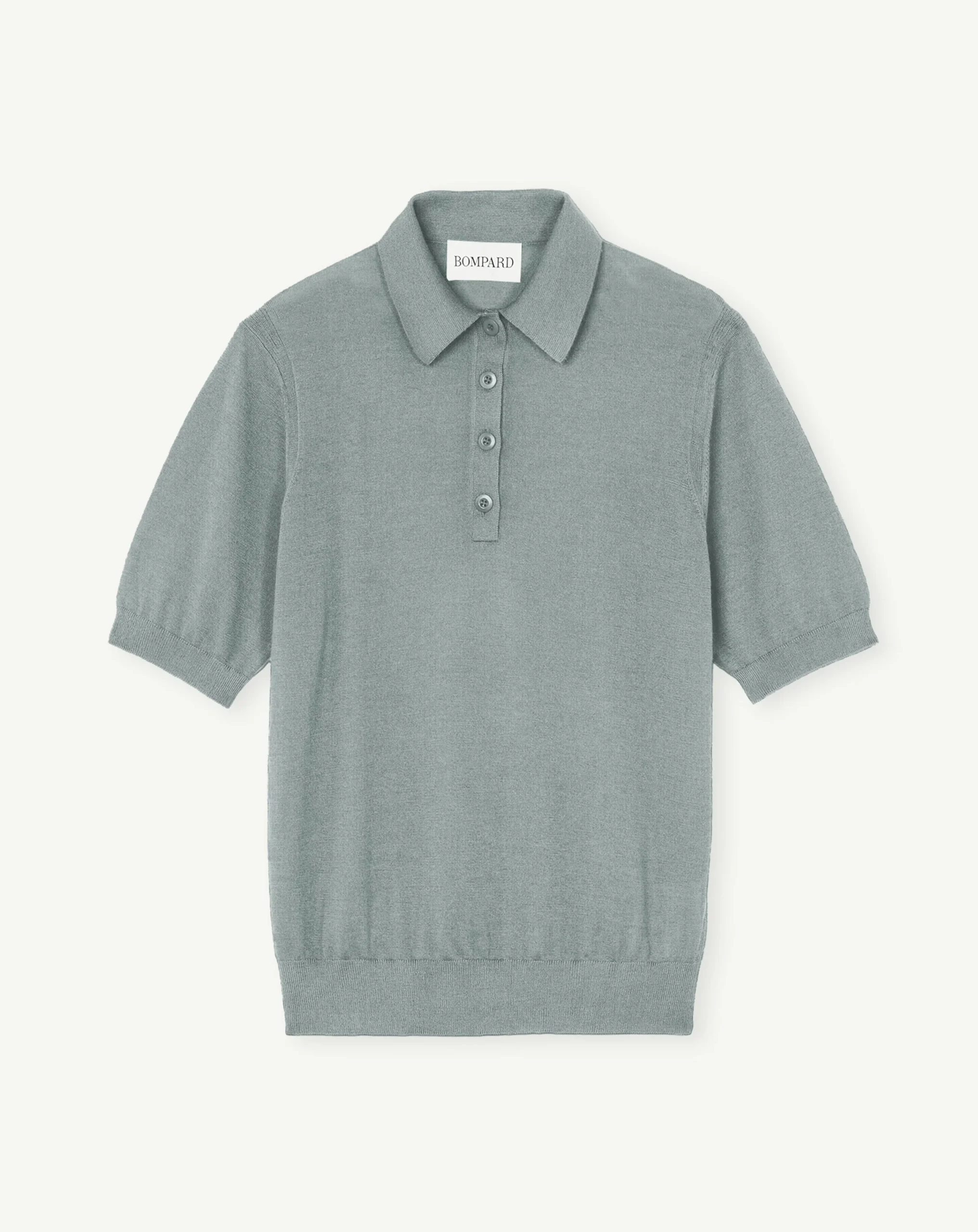 Polo femme en jersey ultrafin de cachemire et soie. Modèle à col boutonné, manches courtes et coupe ajustée. – Polo ultrafin 70% cachemire 30% soie– Polo femme– Coupe près du corps– Longueur classique – Emmanchure droite– Manches courtes – 4 boutons col en corozo – Finitions côtelées aux manches et sur le bas du vêtement