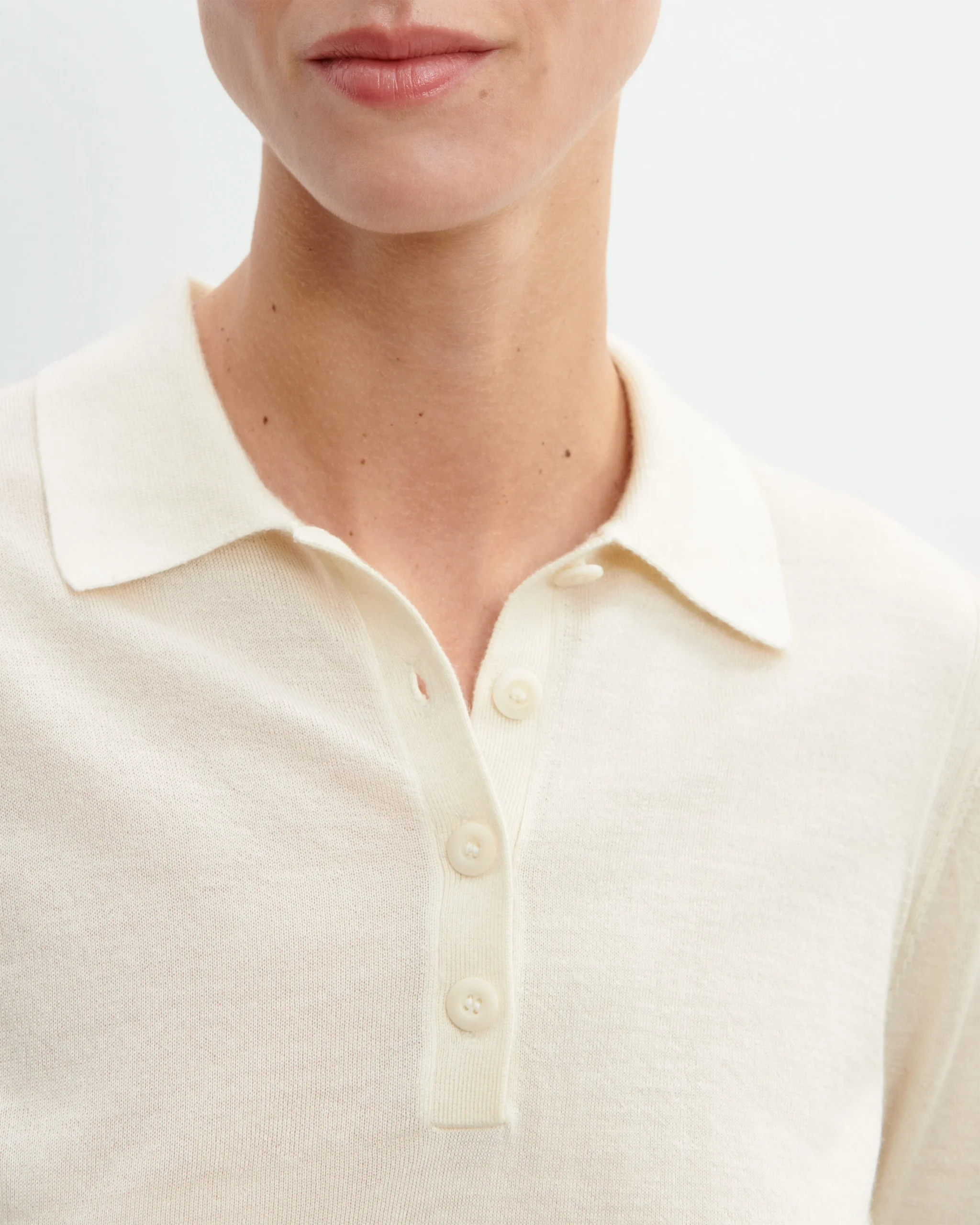 Polo femme en jersey ultrafin de cachemire et soie. Modèle à col boutonné, manches courtes et coupe ajustée. – Polo ultrafin 70% cachemire 30% soie– Polo femme– Coupe près du corps– Longueur classique – Emmanchure droite– Manches courtes – 4 boutons col en corozo – Finitions côtelées aux manches et sur le bas du vêtement