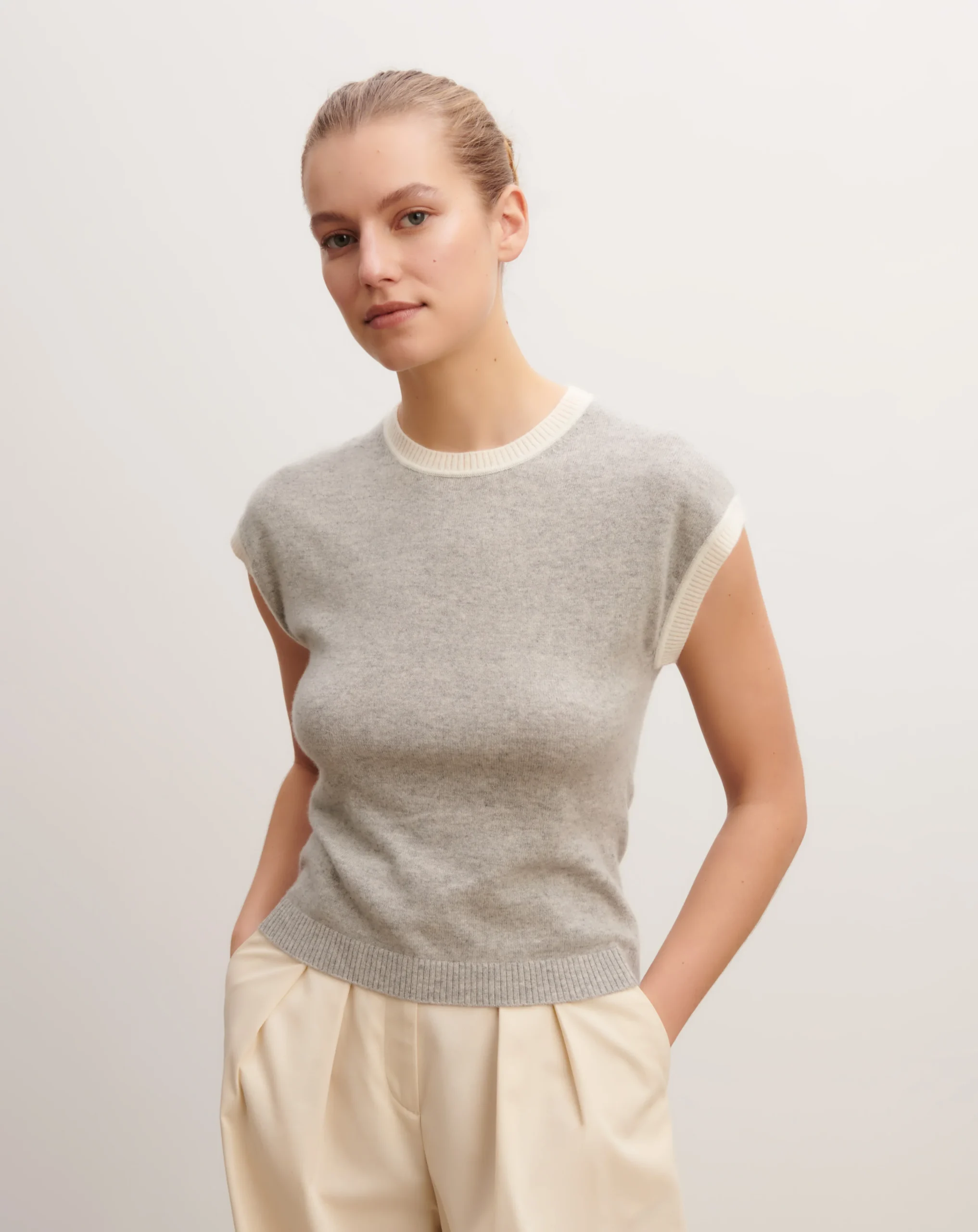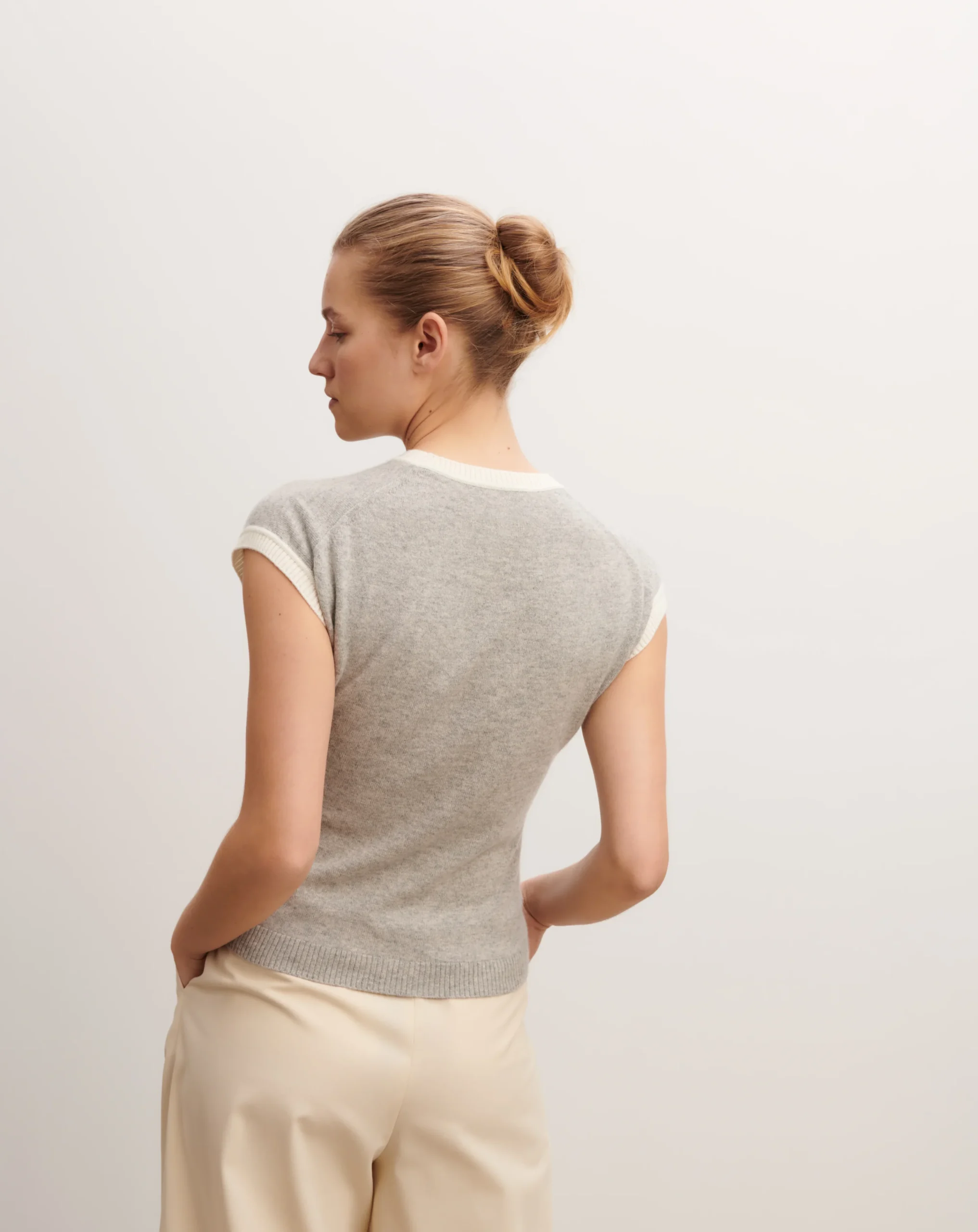 Top en cachemire à manches courtes orné d’un détail contrasté. Coupe droite intemporelle.