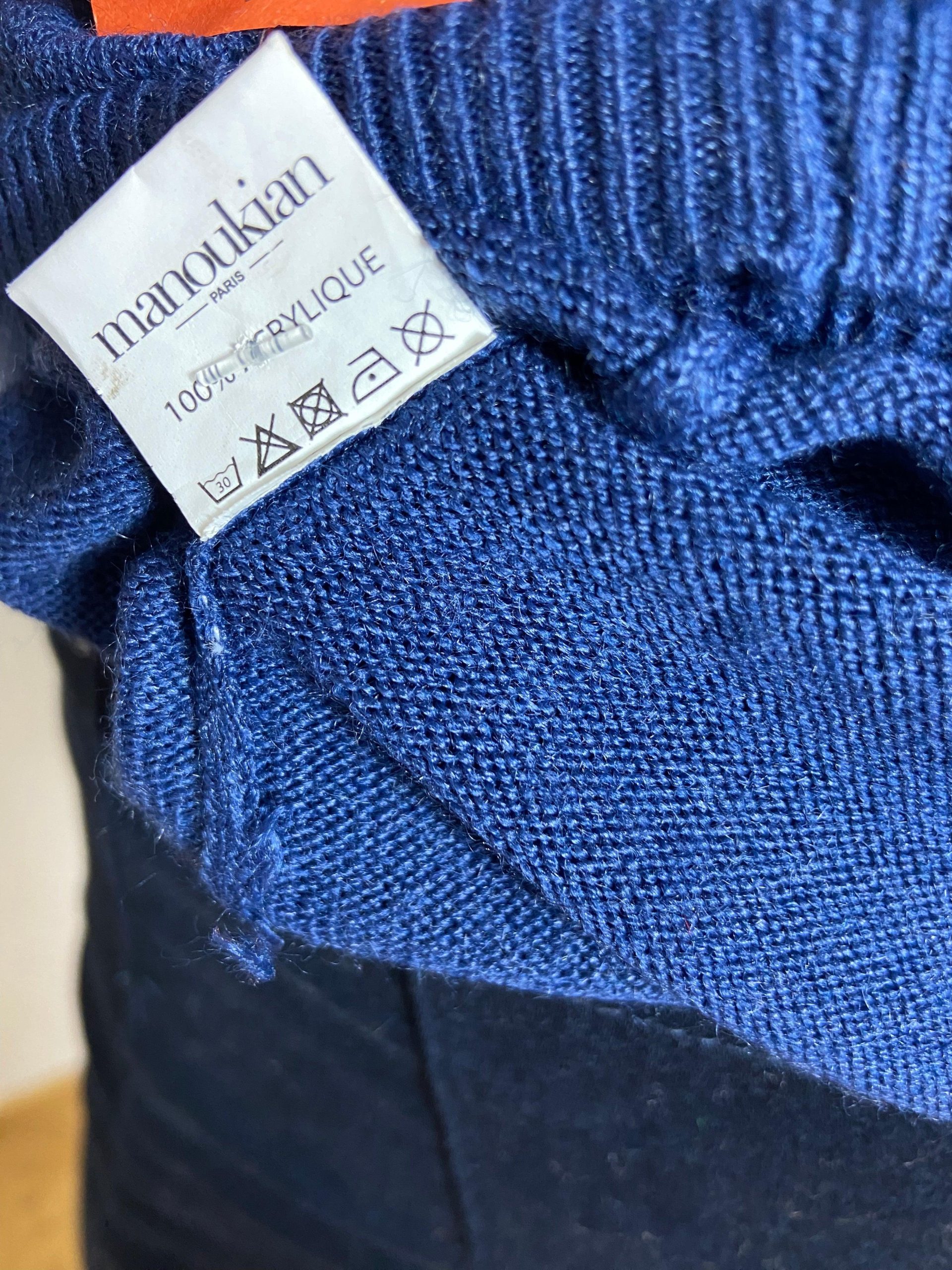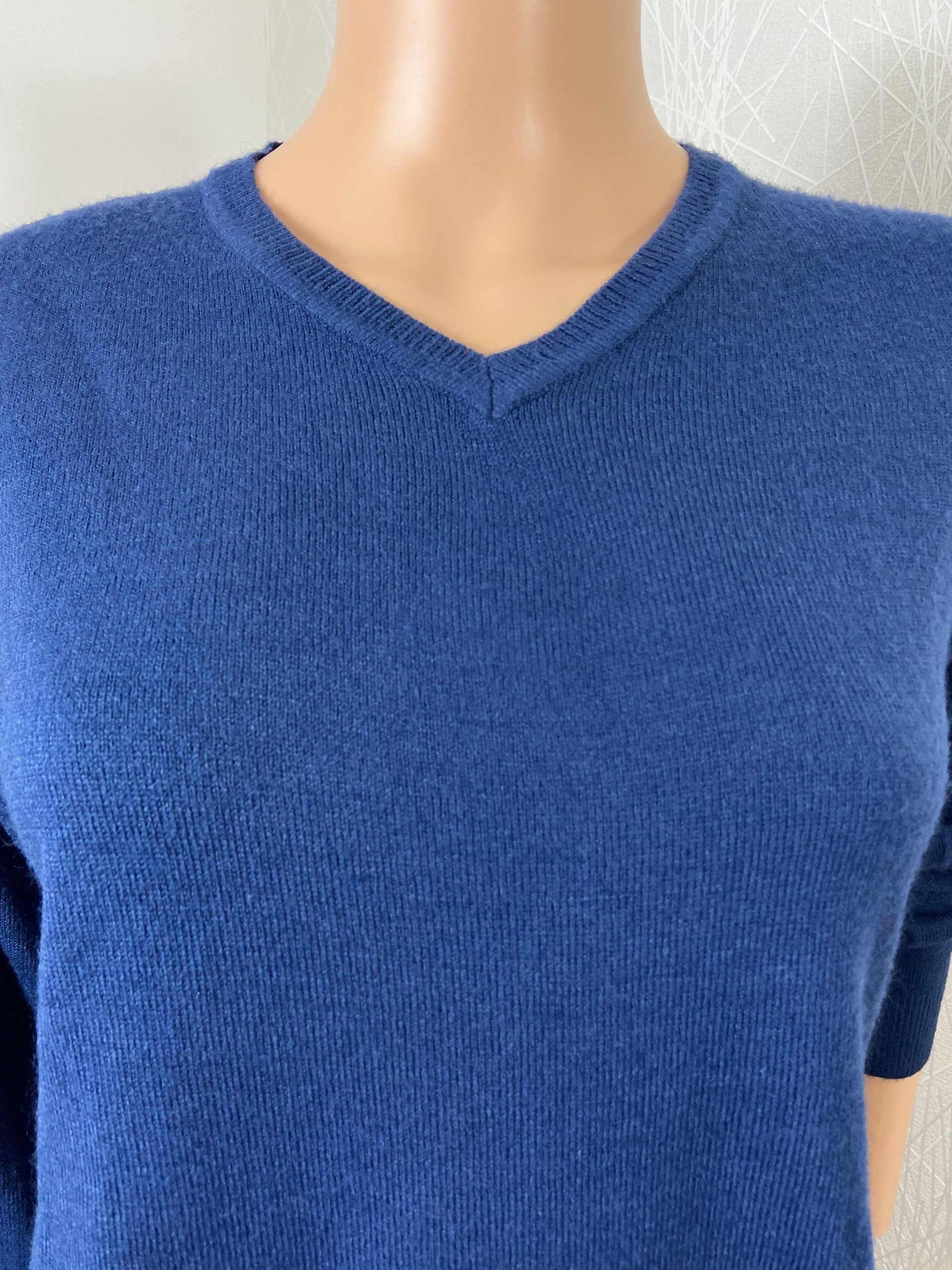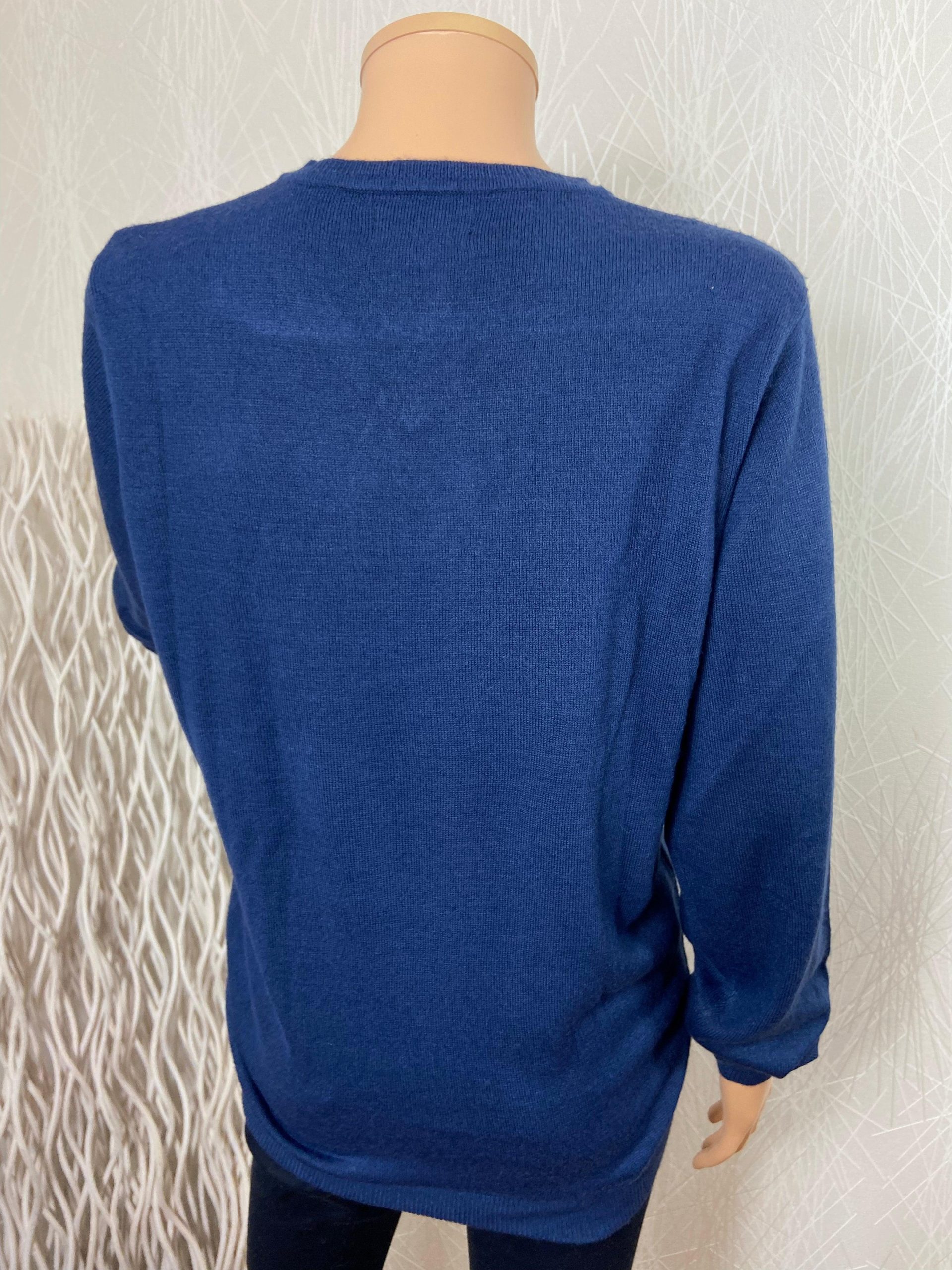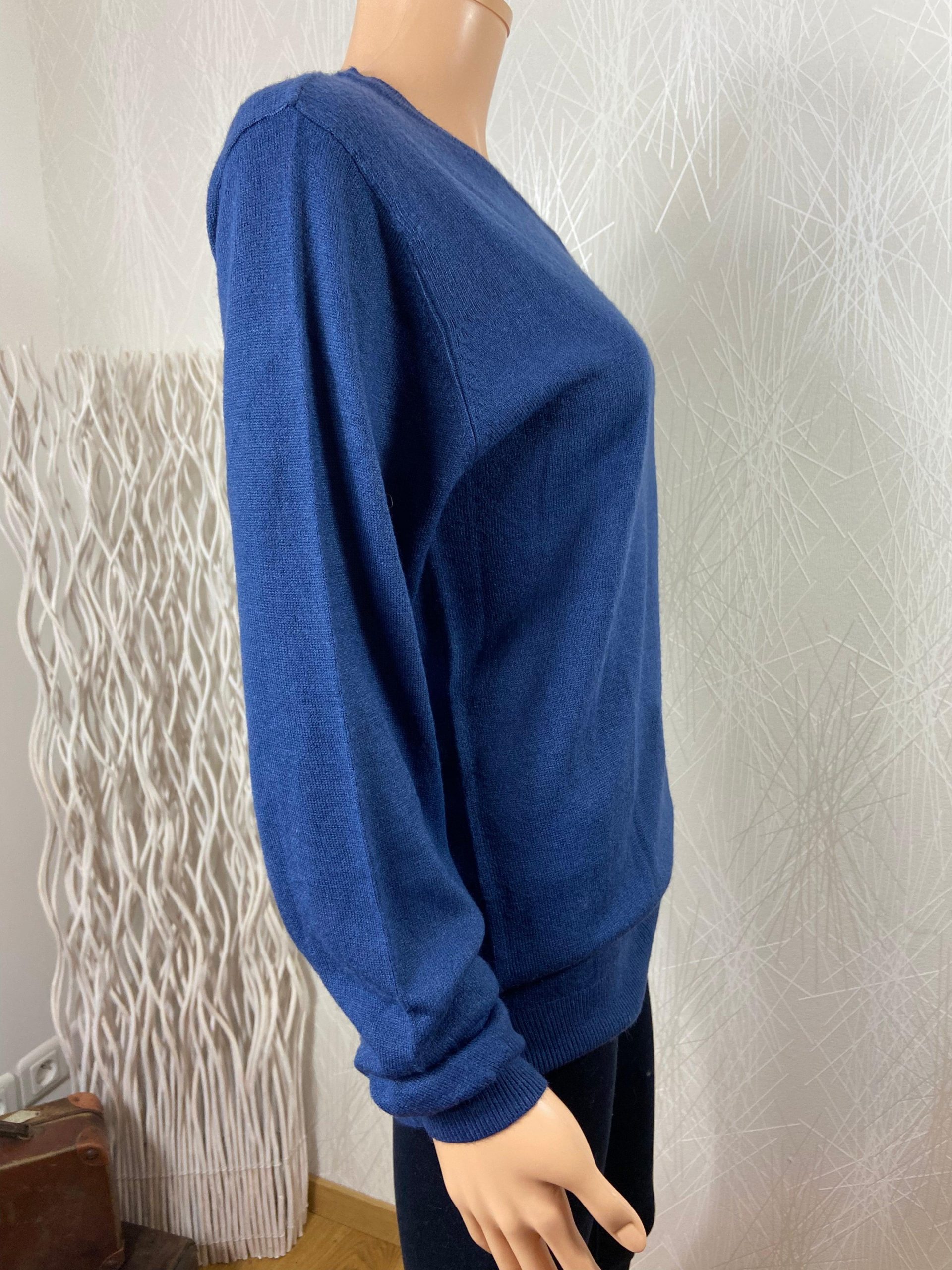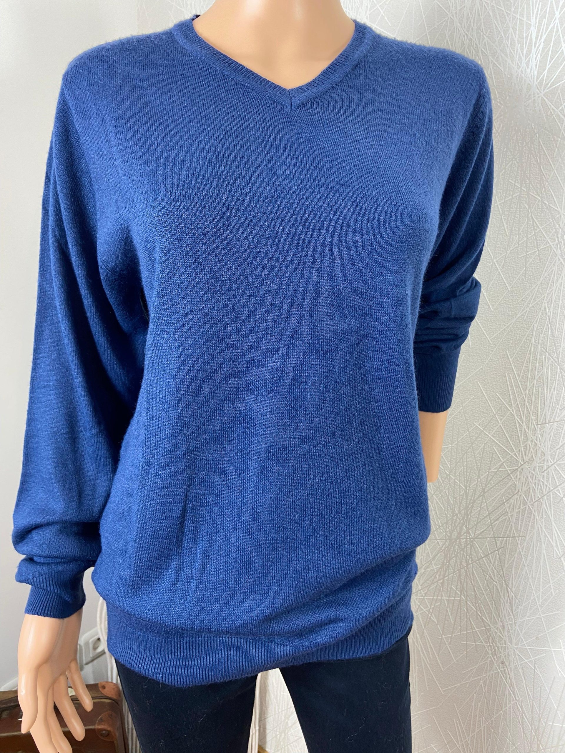 Pull bleu pour femme de la marque Manoukian. Manches longues, encolure en V et bords côtelés. Matière : 100% acrylique Couleur : Bleu Marque : Manoukian Taille M / 38 – Réf : 38QP2891 Dimensions : Largeur épaule : 39 cm ; tour de poitrine : 98 cm ; longueur : 67 cm.