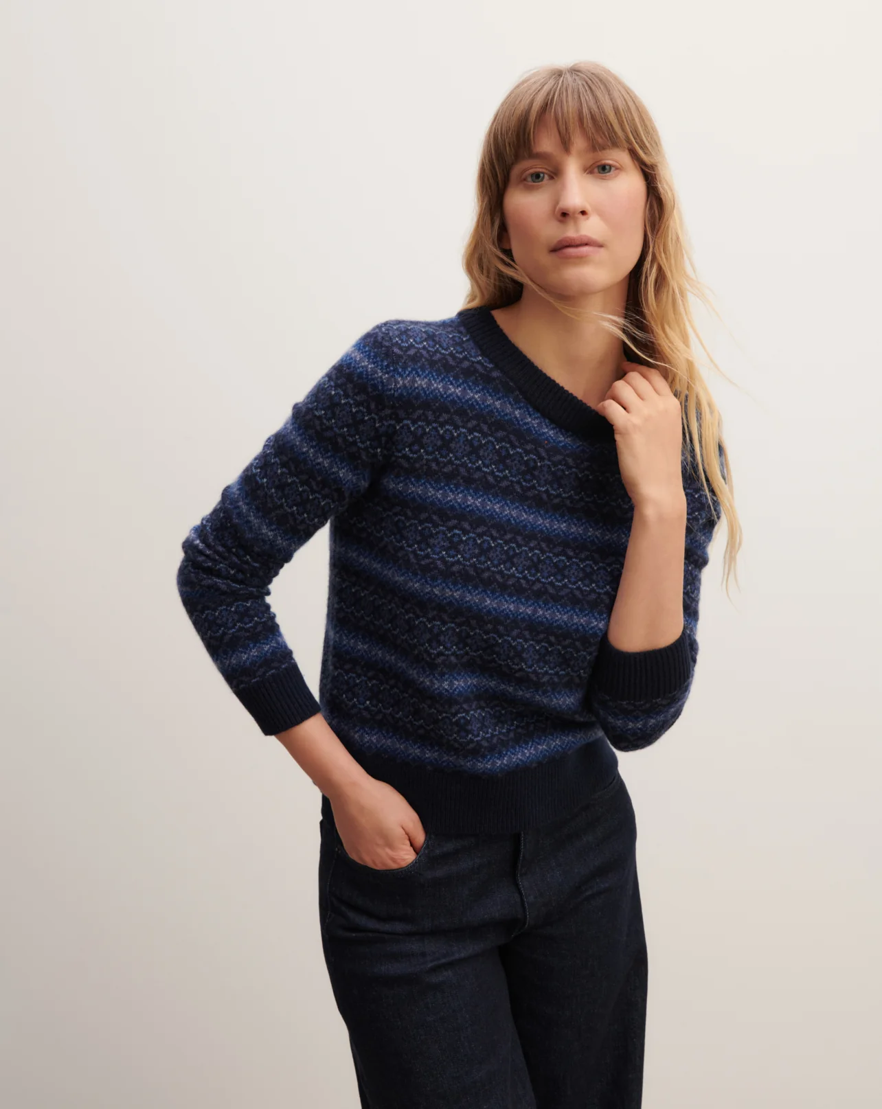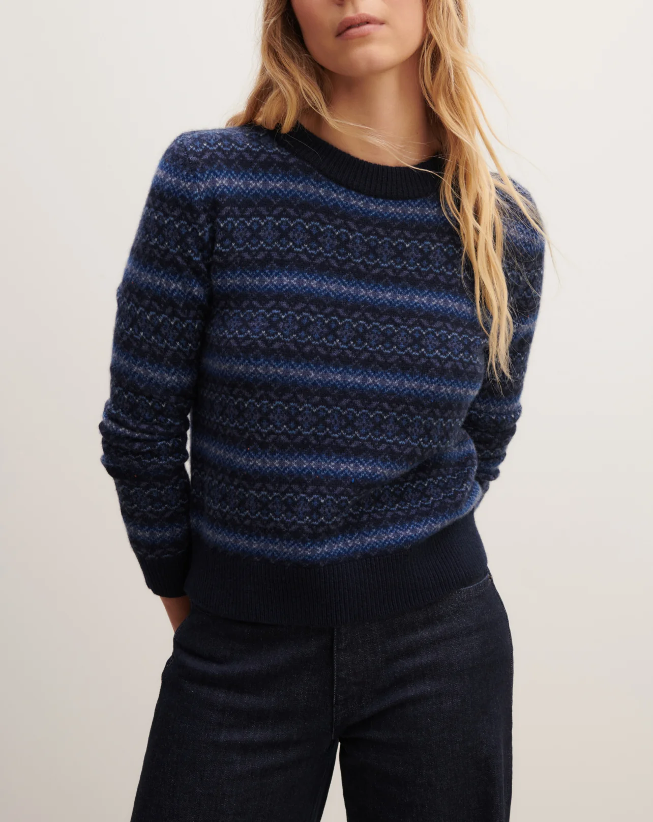 Pull court en cachemire agrémenté d’un motif Fair Isle en jacquard. Modèle à encolure ronde et finitions côtelées.