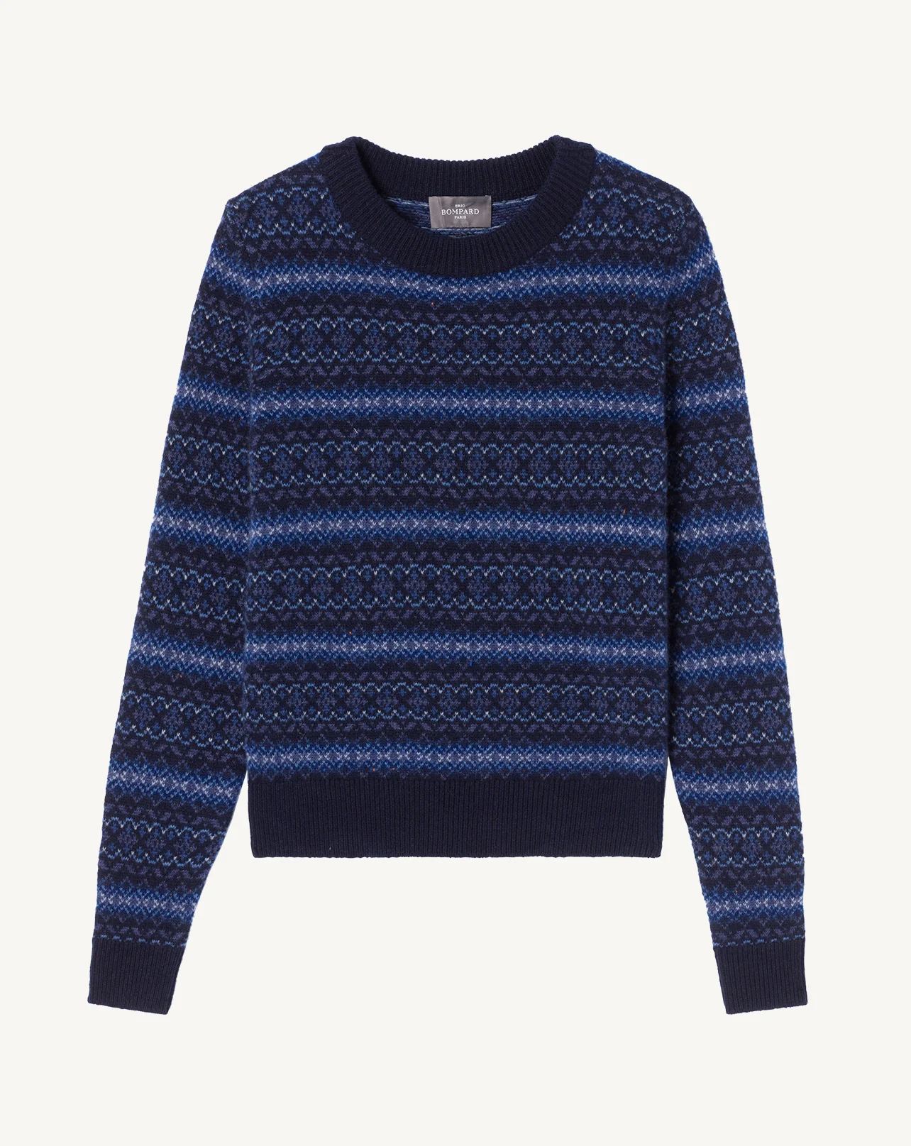 Pull court en cachemire agrémenté d’un motif Fair Isle en jacquard. Modèle à encolure ronde et finitions côtelées. -Pull col rond femme-Coupe droite-Longueur courte « cropped »-Emmanchure droite-Manches longues -Motif Fair Isle en jacquard