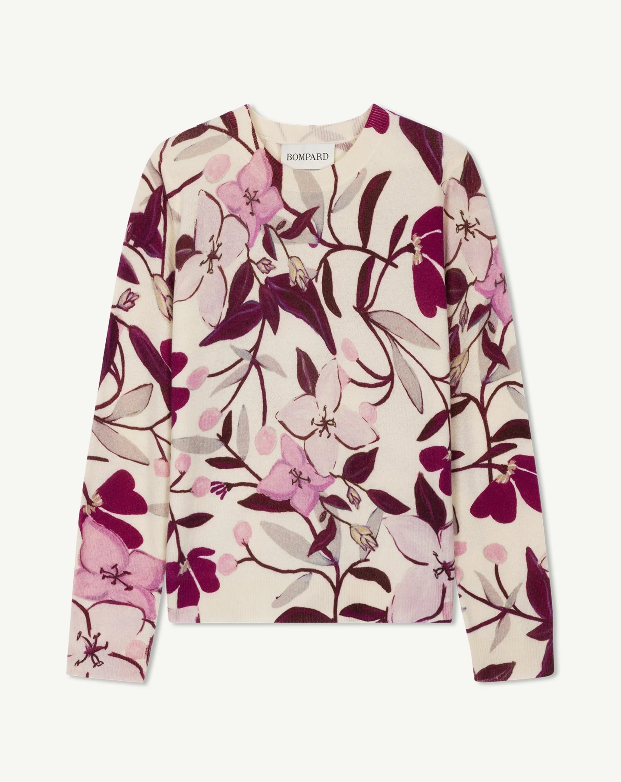 Pull à imprimé floral. Modèle en pur cachemire, muni d’un col rond et d’une coupe droite intemporelle. -Pull 100% cachemire-Ultra-doux, moelleux, chaleur enveloppante — signature Bompard-Pull à col rond femme-Coupe droite-Longueur classique-Emmanchure droite-Manches longues-Motif floral imprimé -Dessin exclusif Bompard