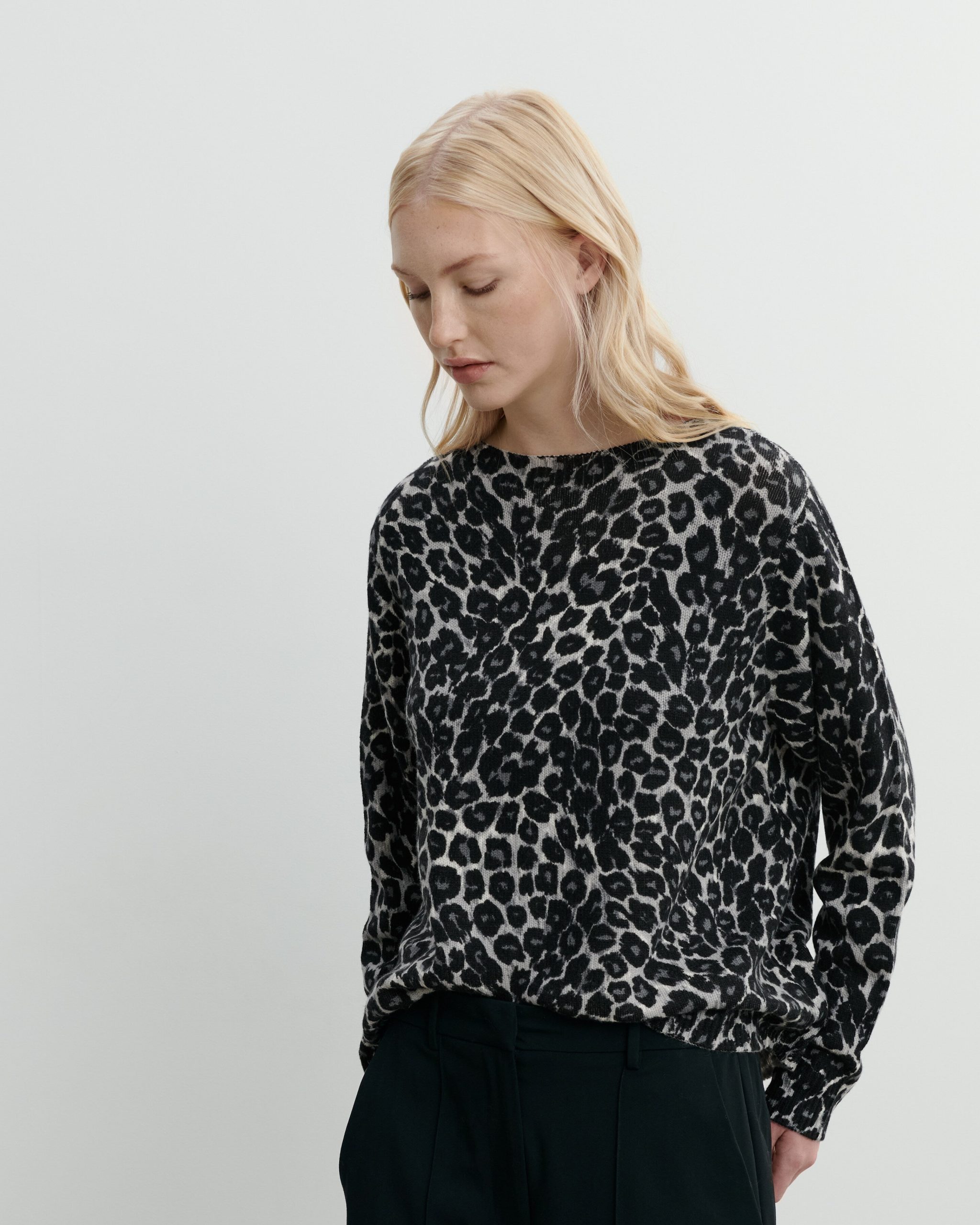 Pull à motif léopard. Modèle en cachemire à col rond, coupe ample et manches longues.