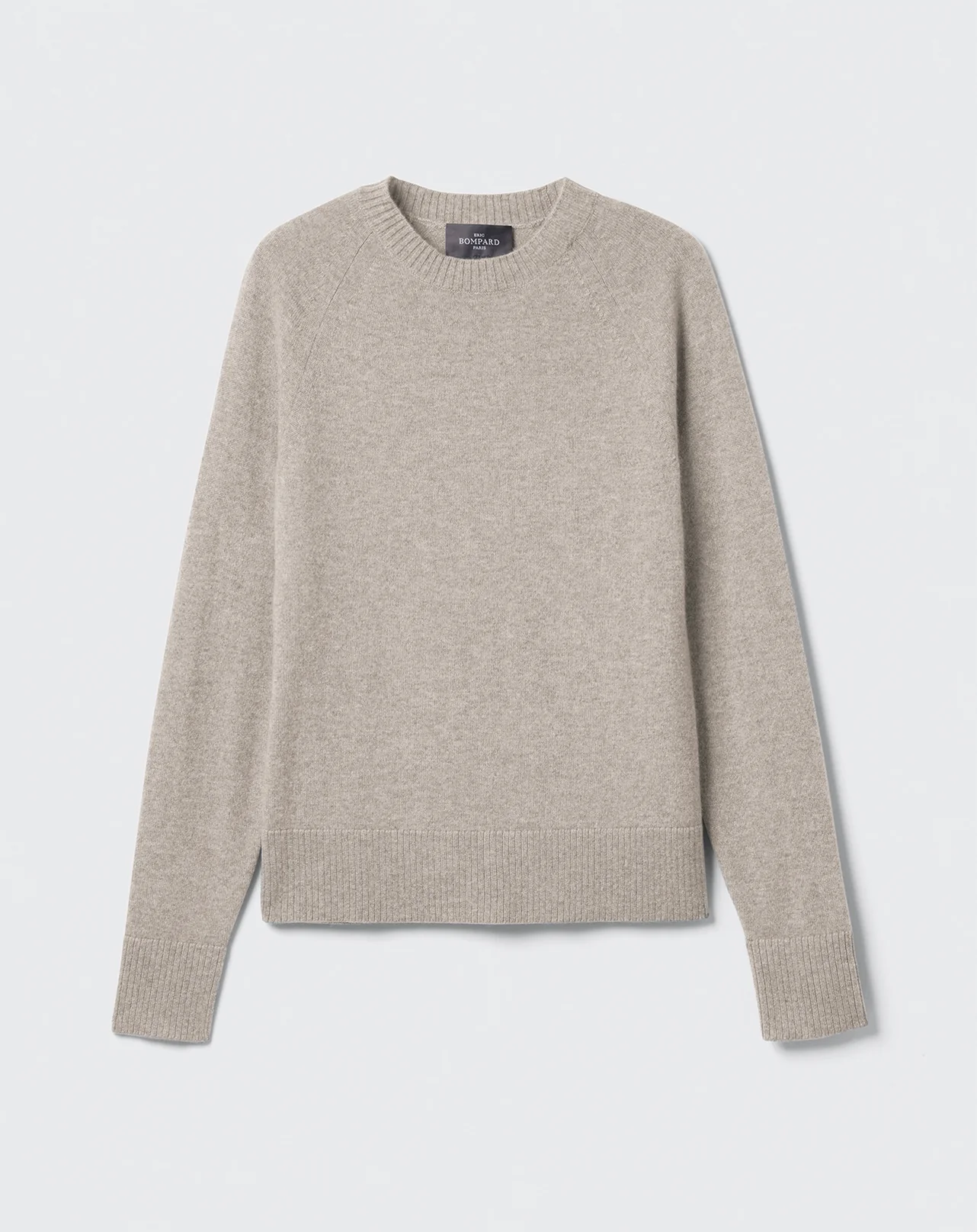 Pull col rond à manches raglan et coupe près du corps. Maille 100% cachemire.