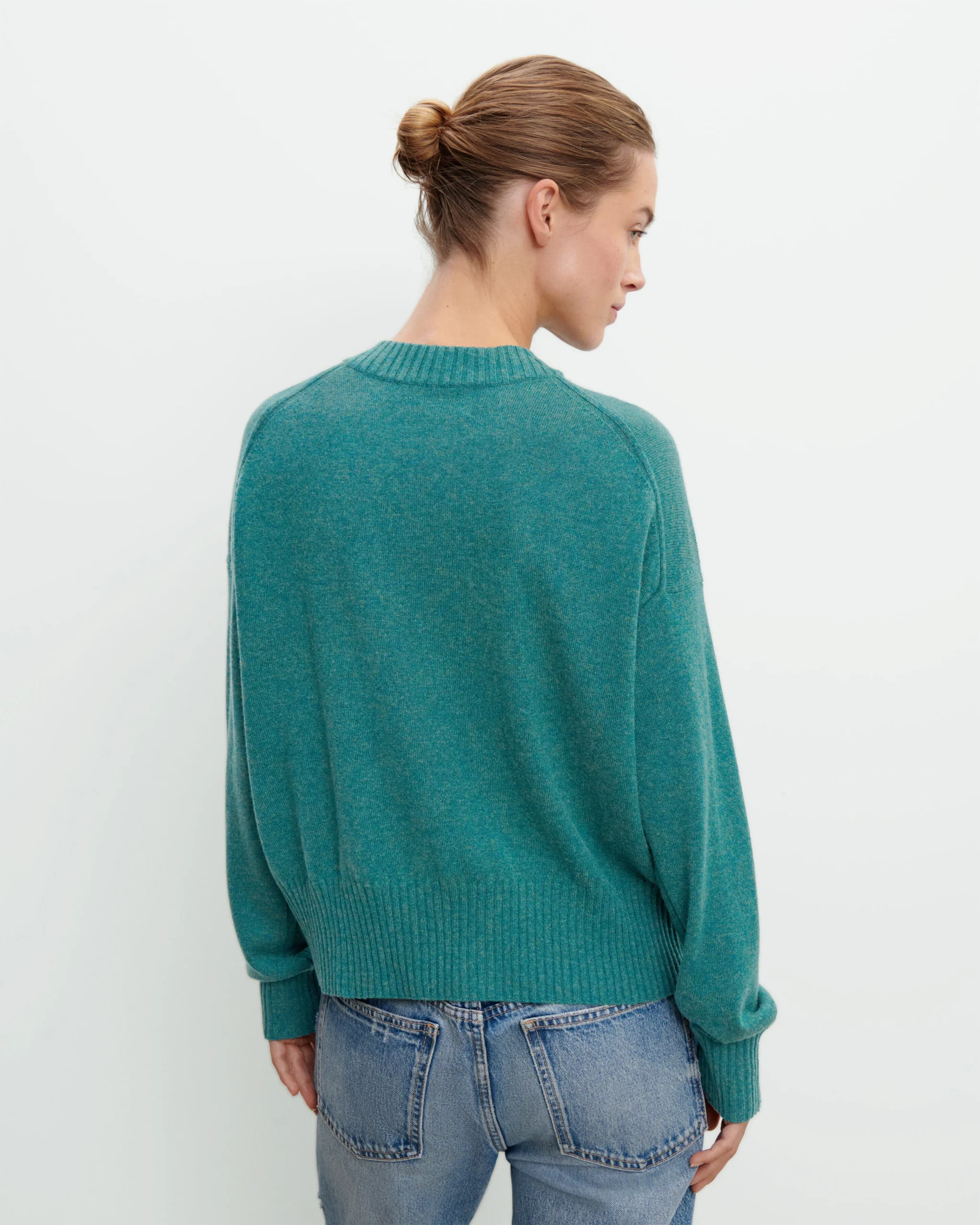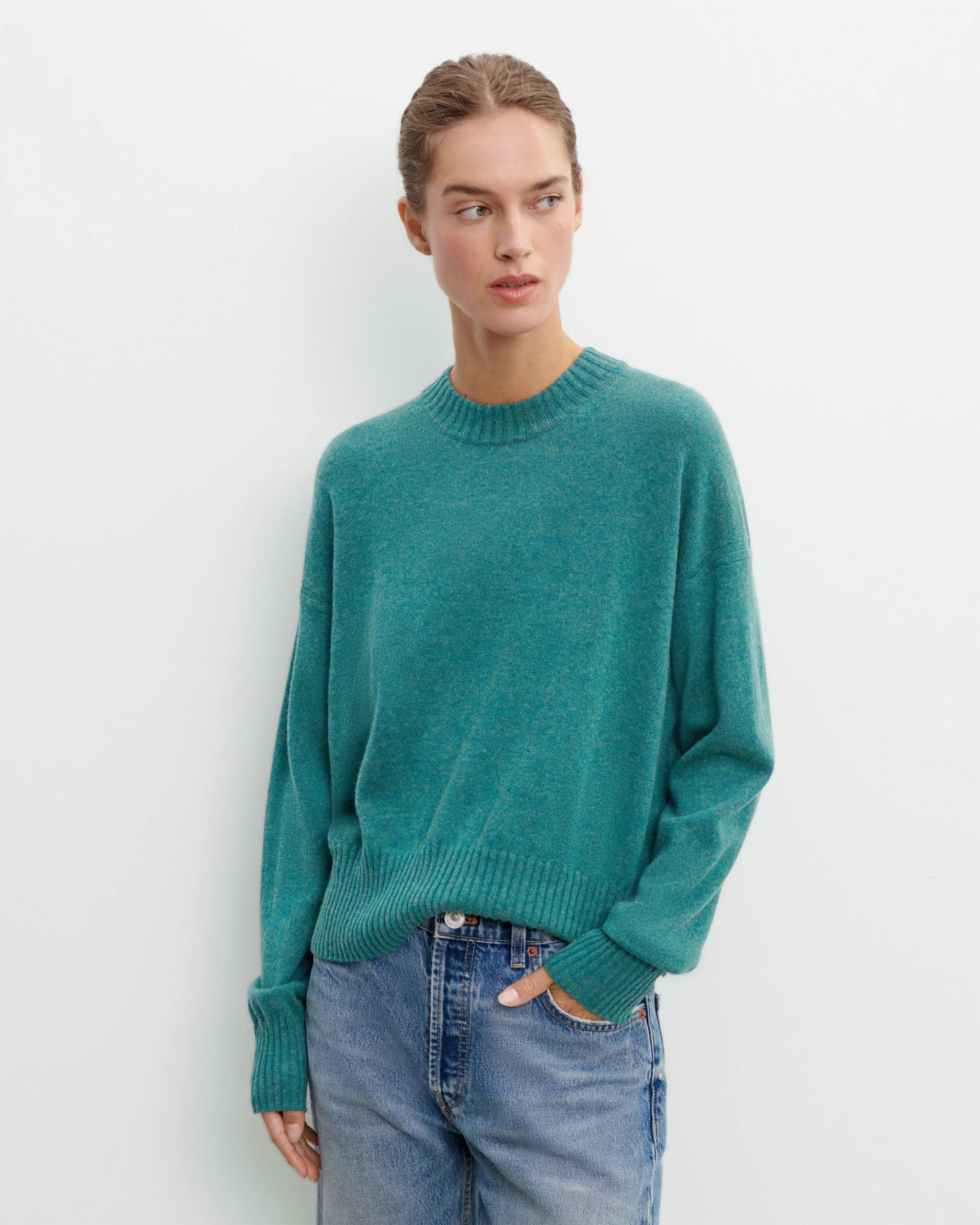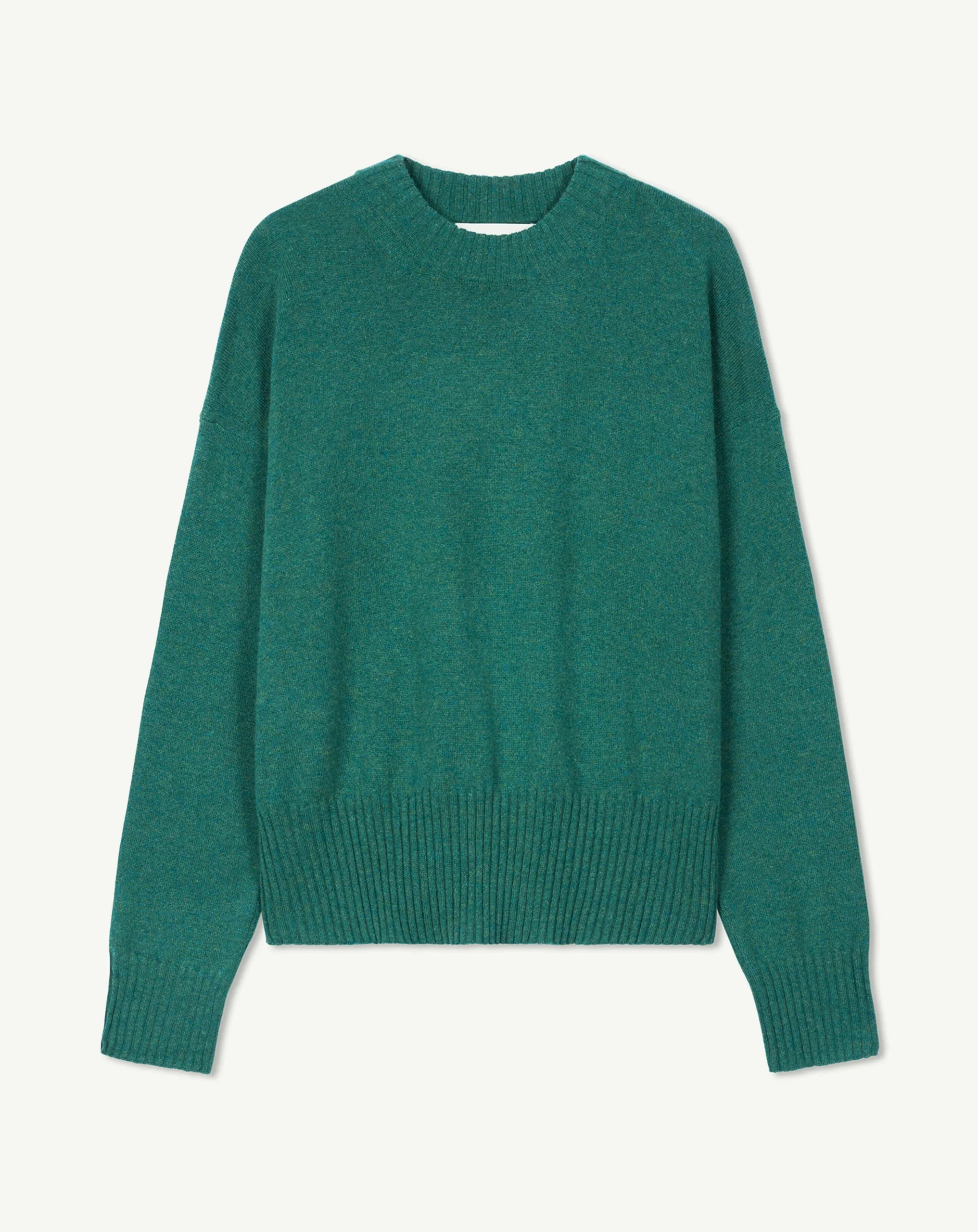 Pull à coupe ample en maille de cachemire et soie. Modèle à encolure ronde, manches longues et coupe raccourcie.