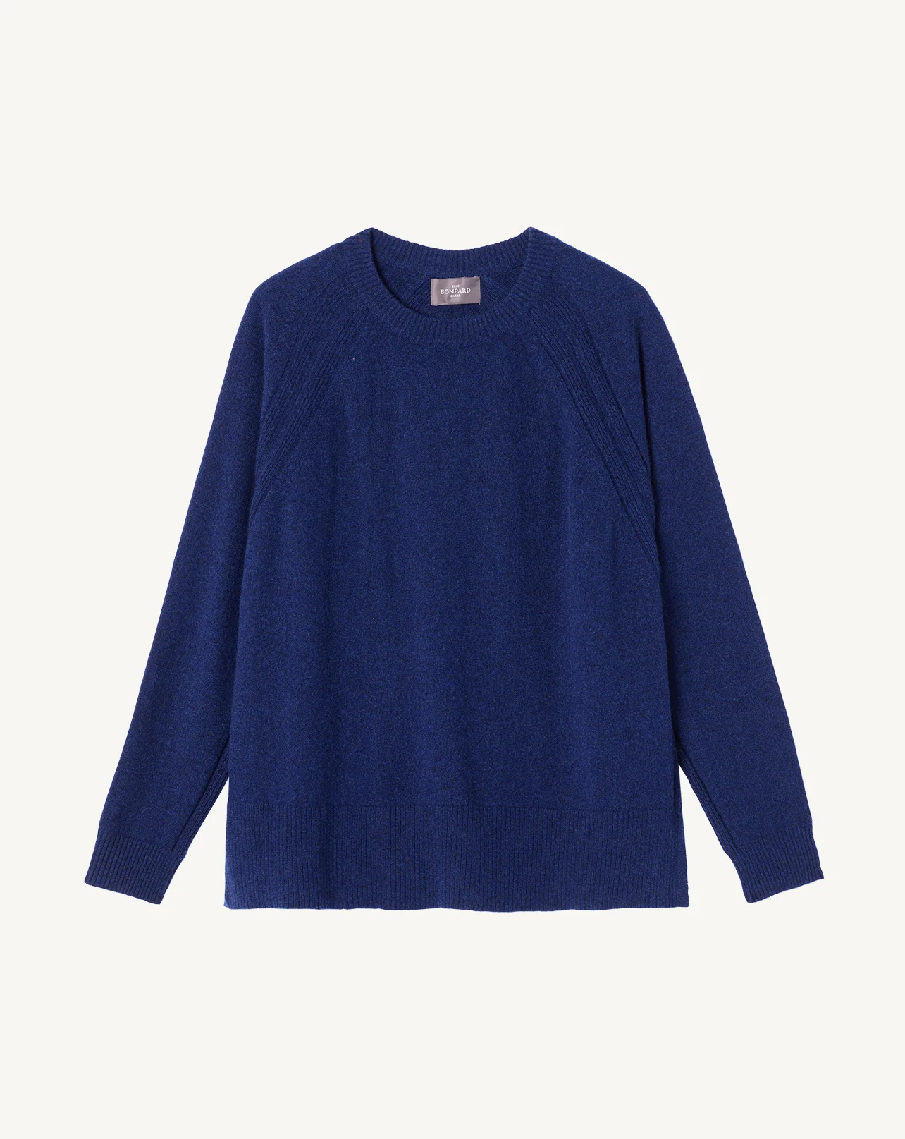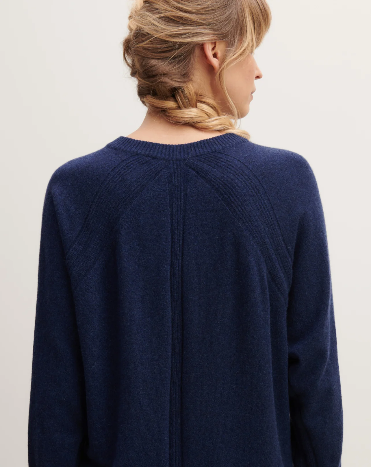 Pull oversize en cachemire. Modèle à col rond, emmanchure raglan et détail en point chevron. -Pull col rond femme-Coupe oversized-Taillé long-Emmanchure raglan-Manches longues -Ligne décorative tricotée en point chevron le long de l’emmanchure et le dos du milieu