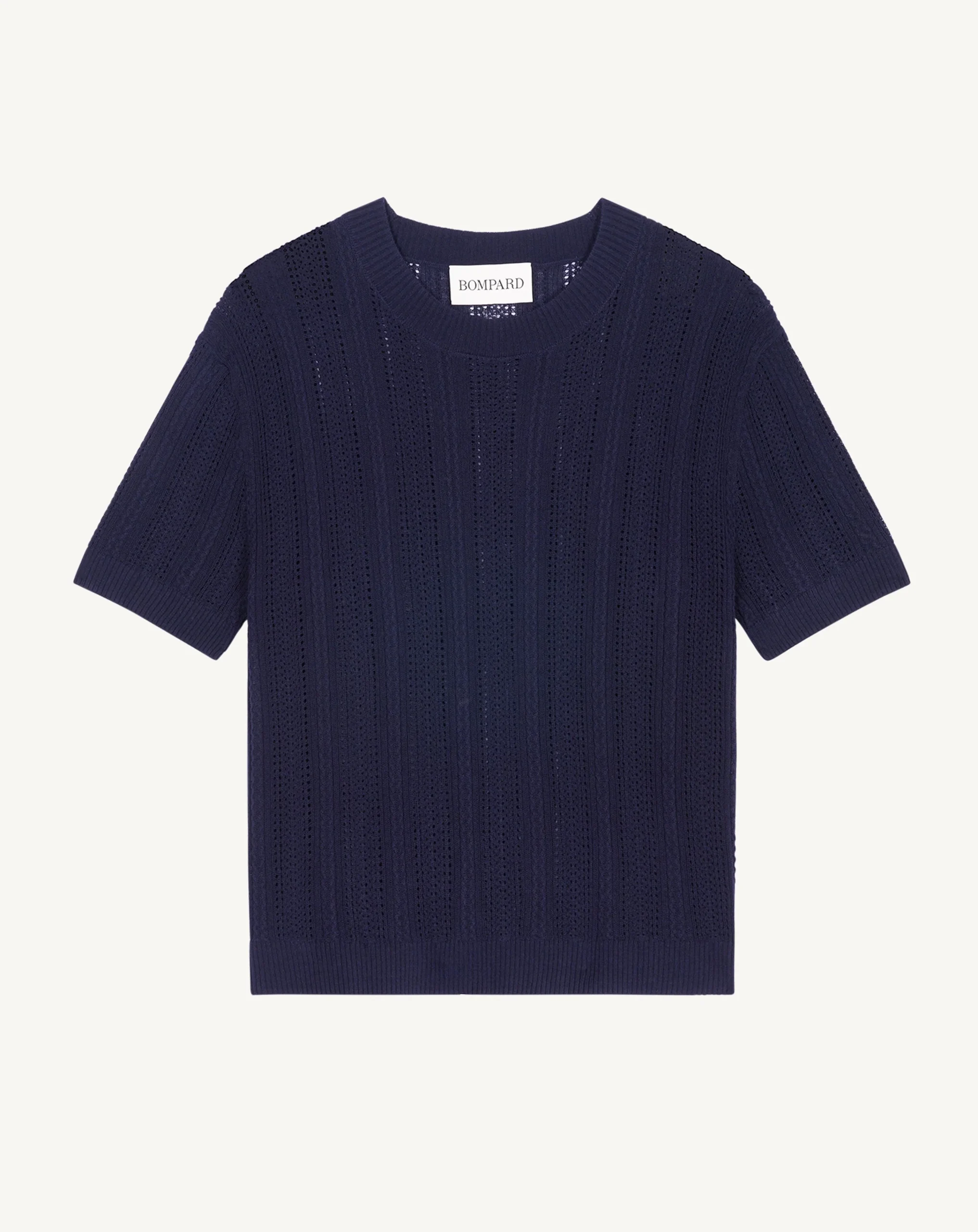 Ce top col rond à manches courtes est sublimé par un jeu raffiné de pointelles pour une allure aérienne et contemporaine.
