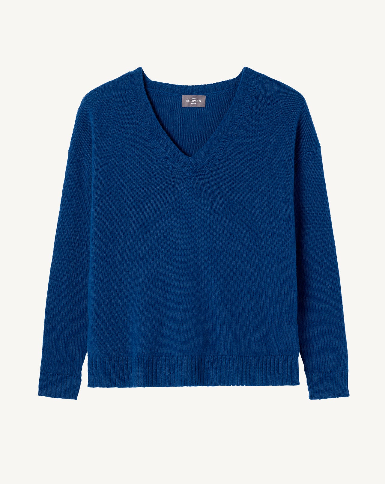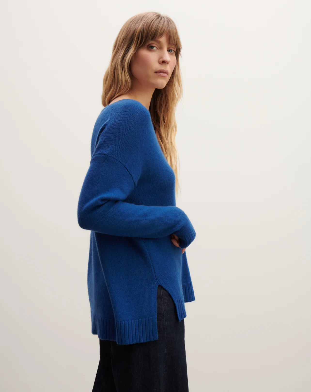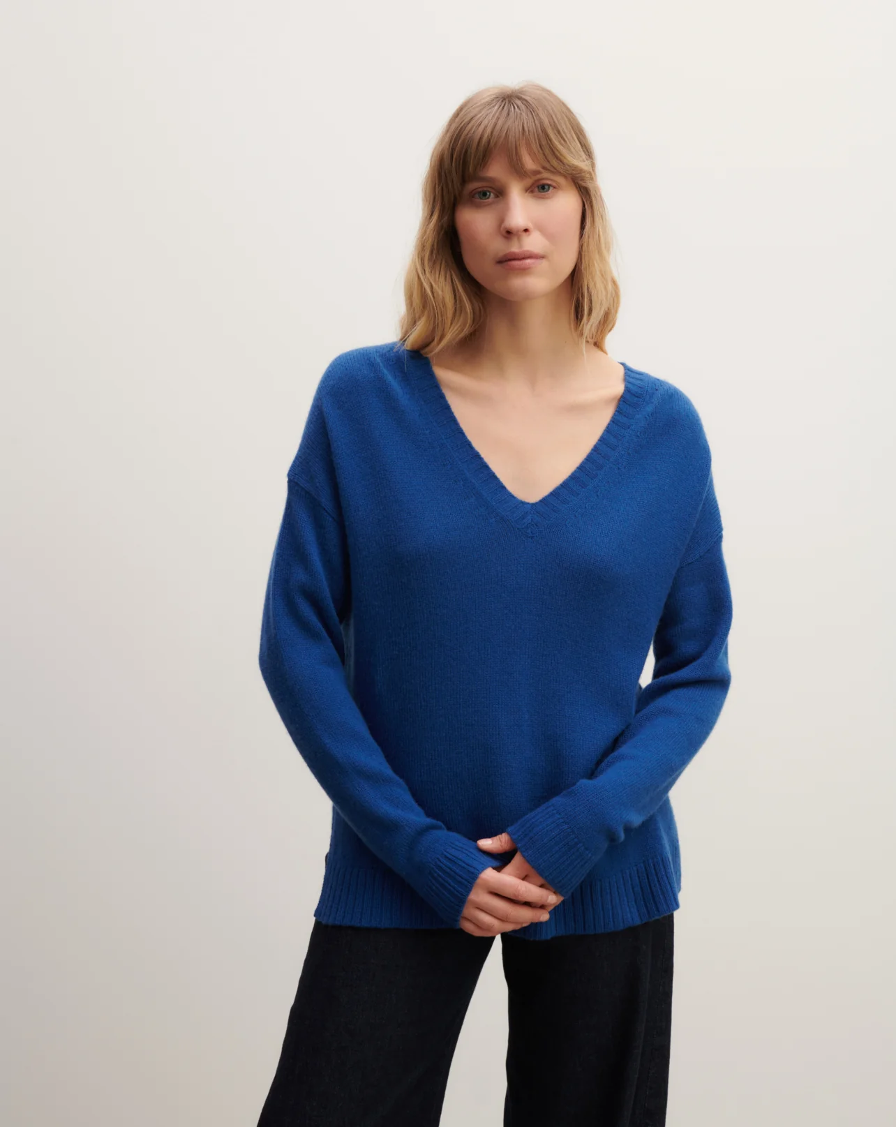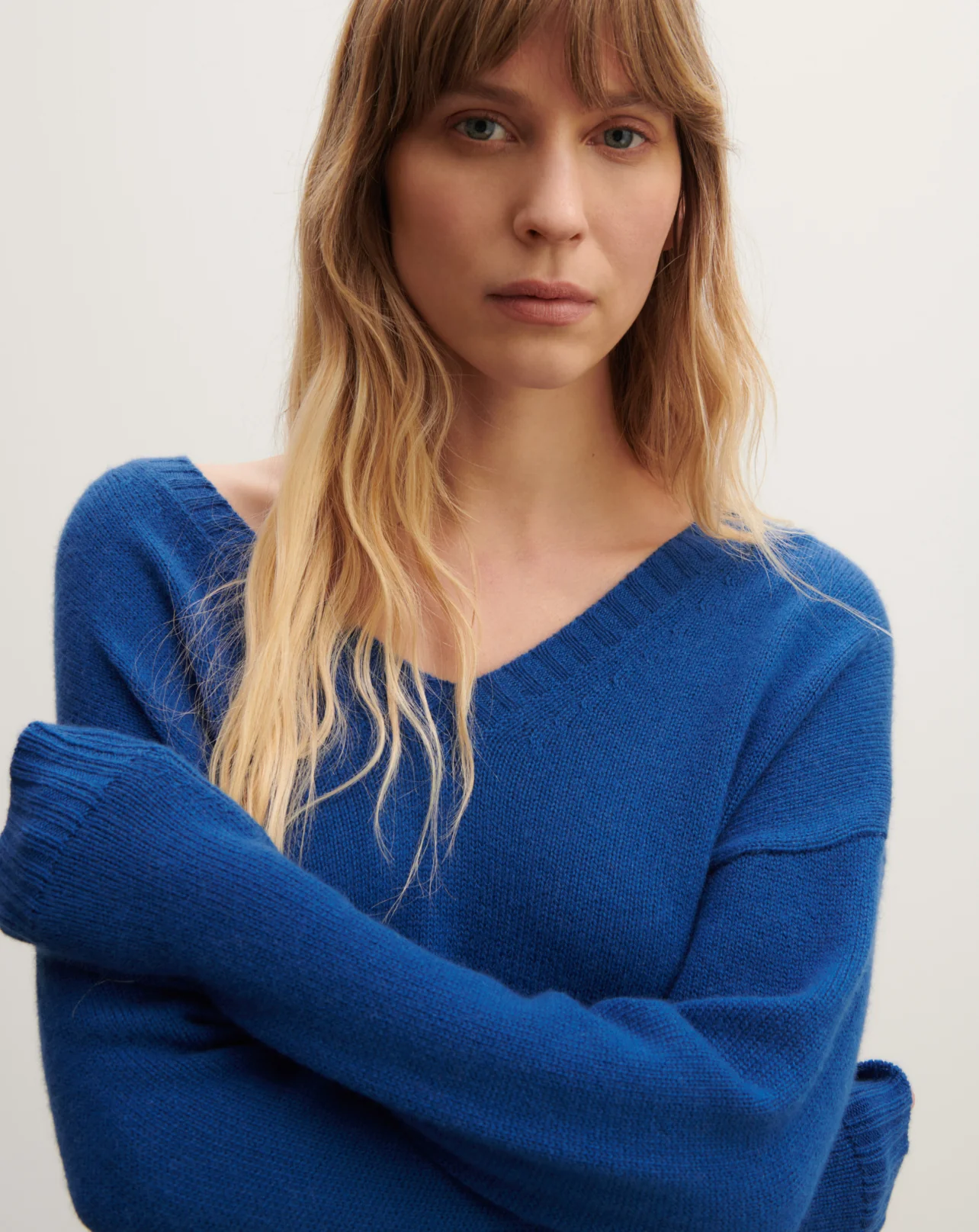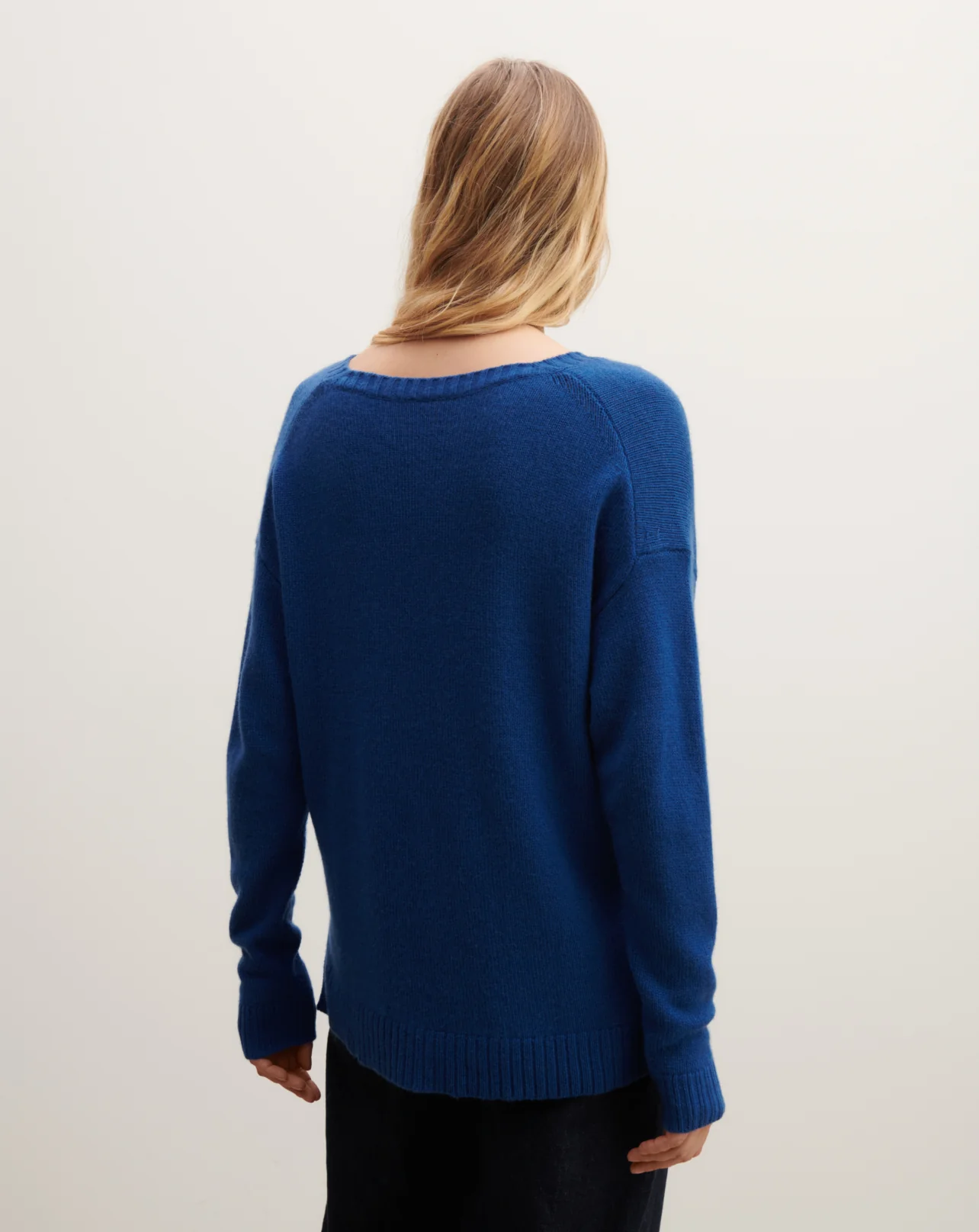 Pull V oversize pour femme en cachemire 4 fils. -Coupe ample-Taillé long-Emmanchure tombante-Manches longues-Fentes côtés-Tricot en Jersey
