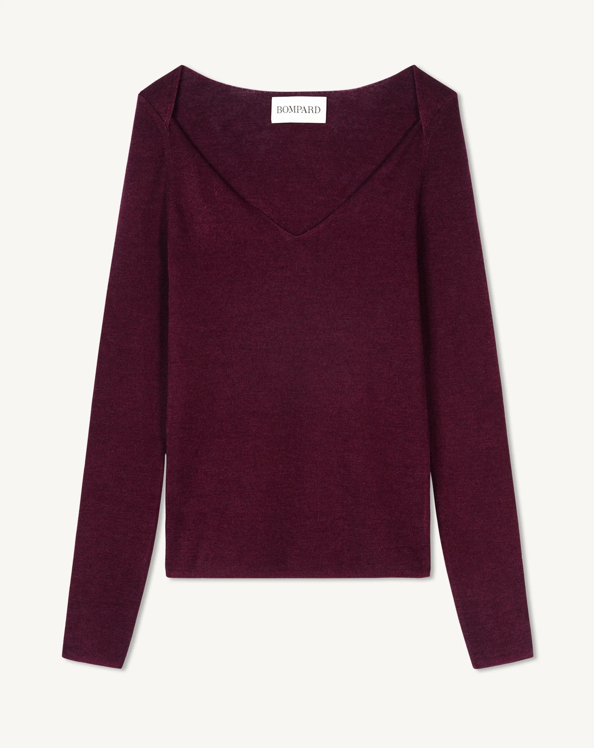 Pull femme en cachemire et soie ultrafin. Encolure V profonde. -Coupe ajustée -Taillé long-Emmanchure droite-Manches longues-Détail épaules