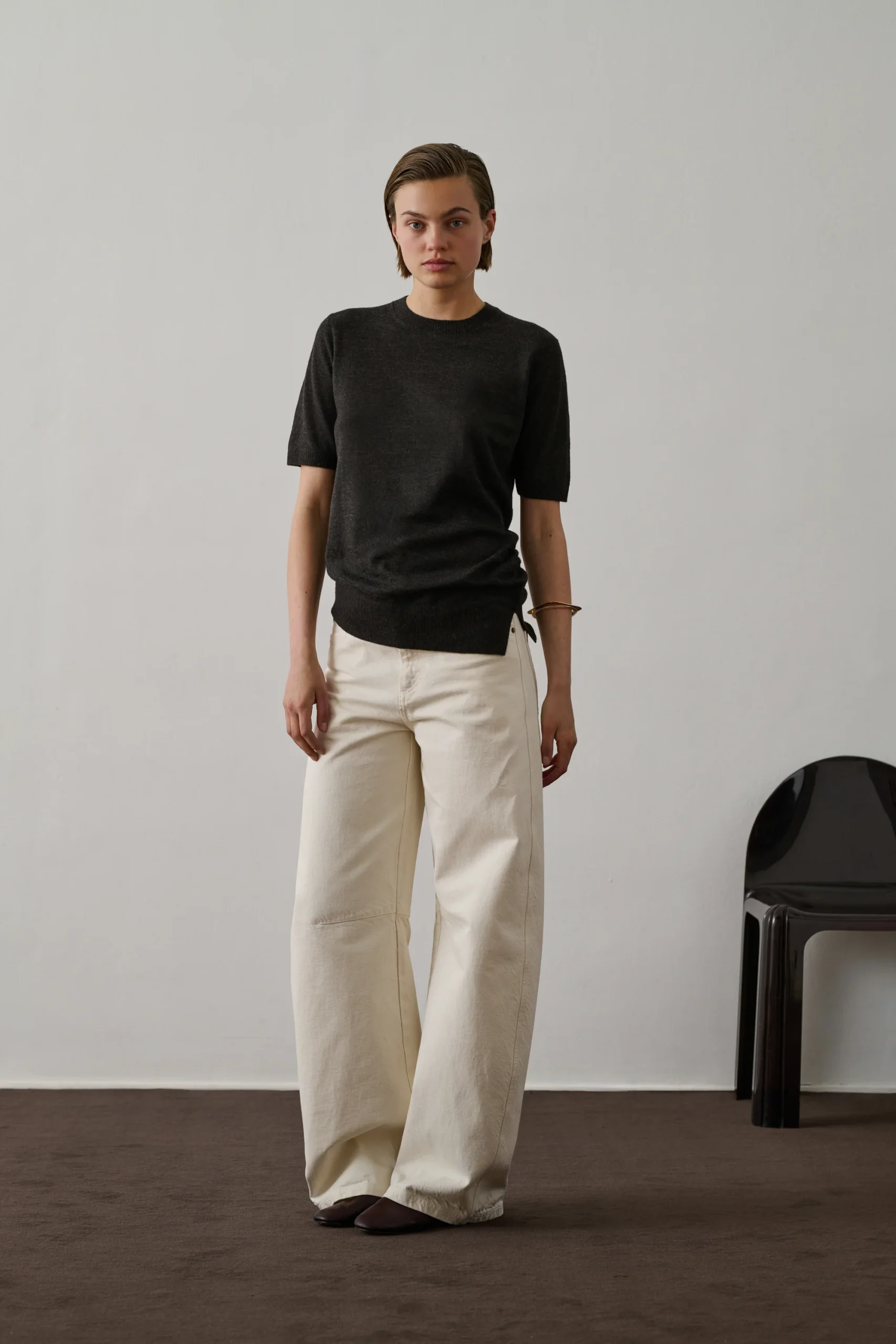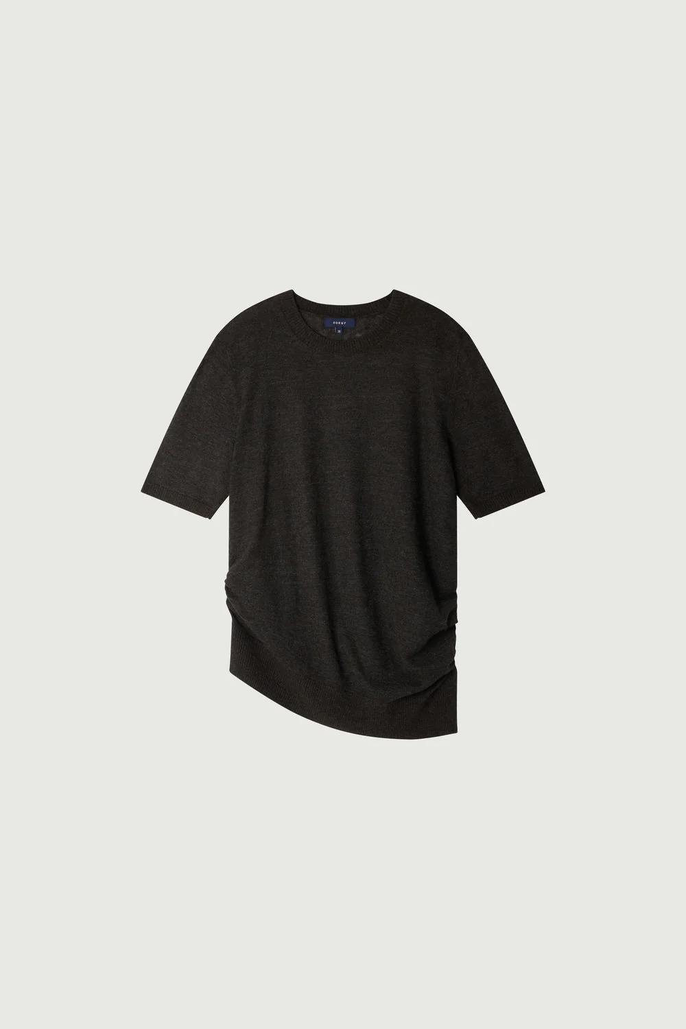 FLORIS est un pull manches courtes drapé en alpaga et laine. Sa coupe ajustée et ses fronces à la taille créent un look sophistiqué. La maille extra fine et douce joue sur la transparence.