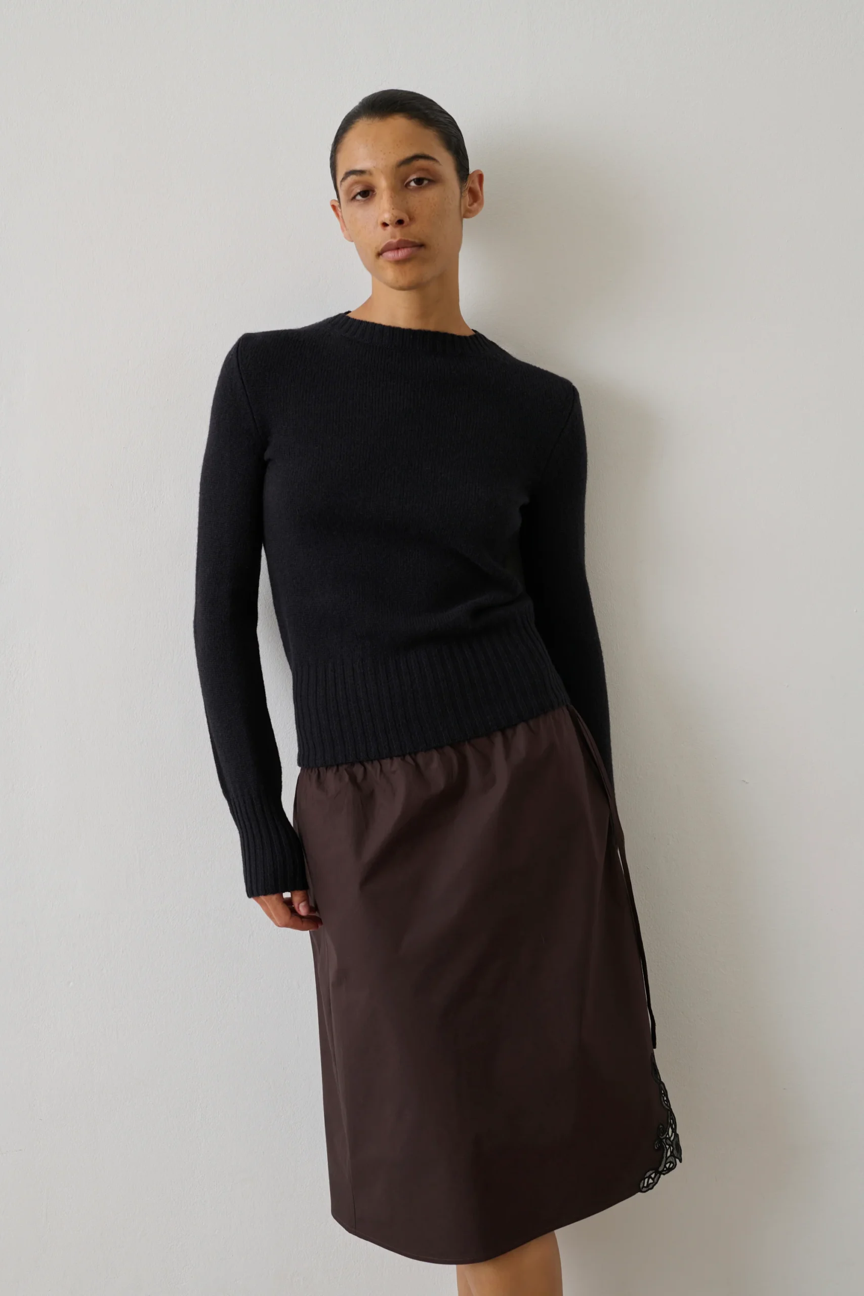– Coupe près du corps – Manches longues – Col bateau – Finition bord côtes bas de corps et poignets
