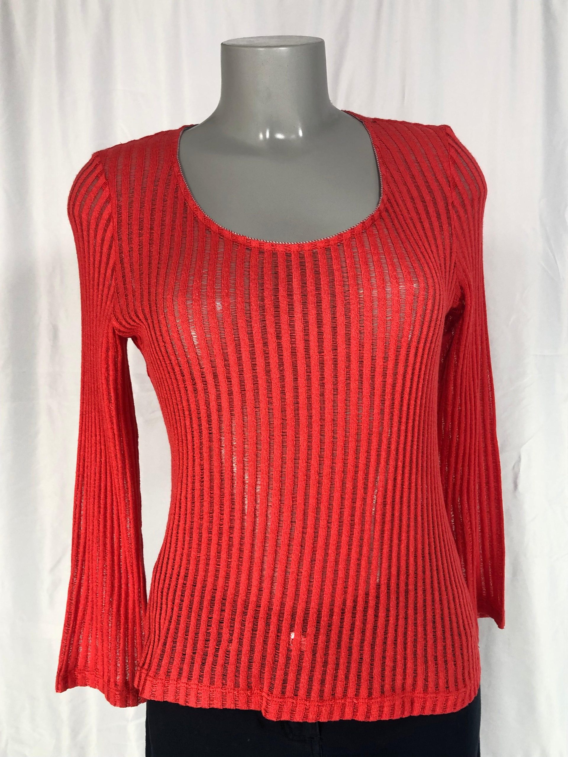 Pull ajouré moulant pour femme, de couleur rose corail, manches longues et encolure ronde 40% viscose – 30% coton – 30% acrylique Tour de poitrine 100 cm longueur 55 cm Couleur rose Taille 44 Marque Lo Les Filles Réf : 44AP1065 Valeur en boutique 95€