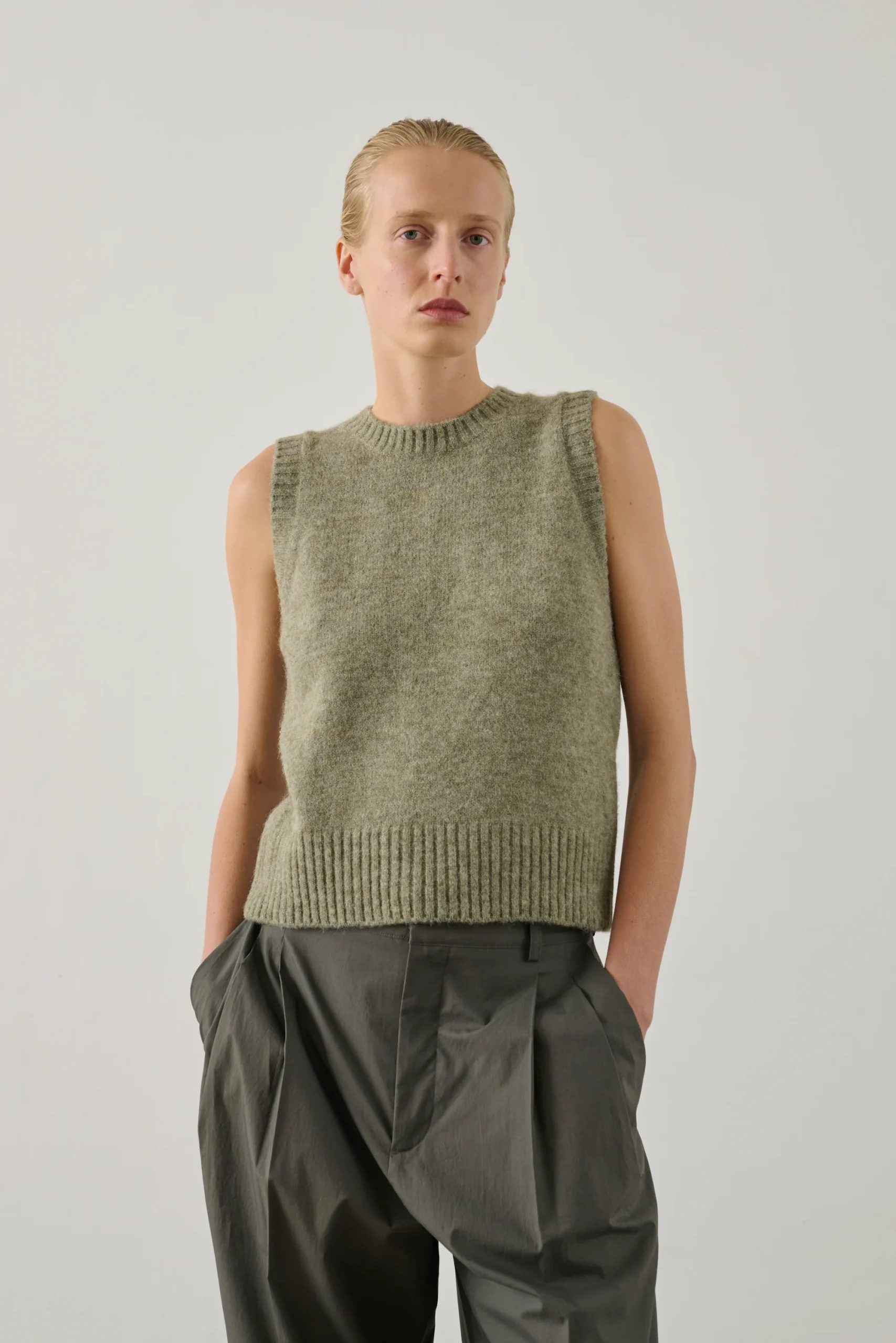 – Coupe droite – Sans manches – Col rond – Finitions bords côtes – Mélange de fil, jauge moyenne