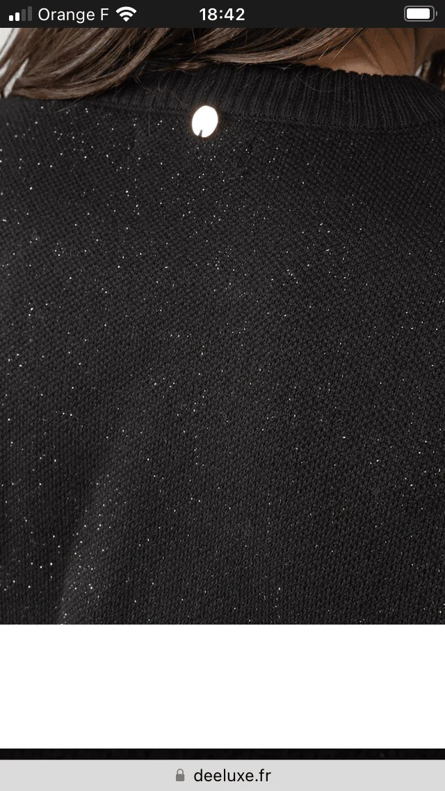 Pull noir pour femme à col rond de la marque Deeluxe. Un joli pull noir pas cher. Valeur en boutique : 39 € Matière : 45% acrylique, 37% coton, 10% nylon et 8% fils métalliques Couleur : Noir et fils argenté Marque : Deeluxe. Taille : L / 40 – Réf : LCP359
