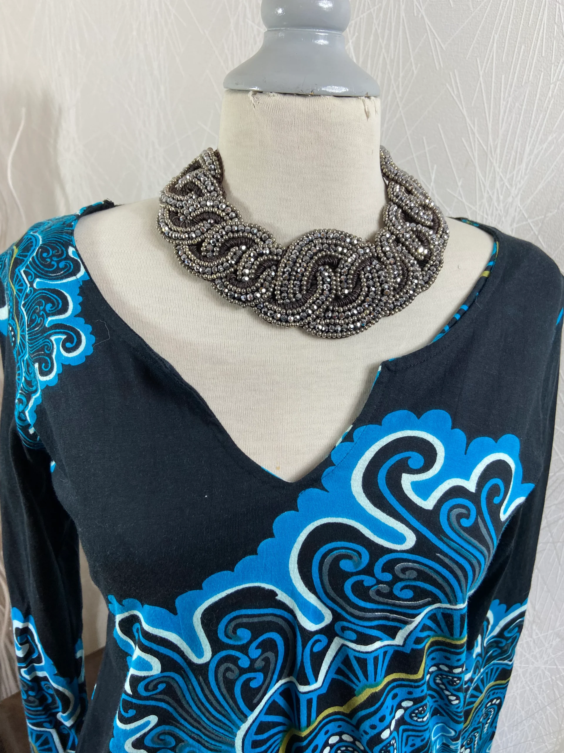 Pull pour femme à manches longues avec une encolure en V de la marque Aller Simplement de style hippie chic, fabriqué de manière artisanale. Matière : 100 % coton Couleur : noir, bleu, blanc, gris et vert. Dimensions : Largeur épaule : 40 cm ; tour de poitrine : 88 cm ; longueur 64 cm […]