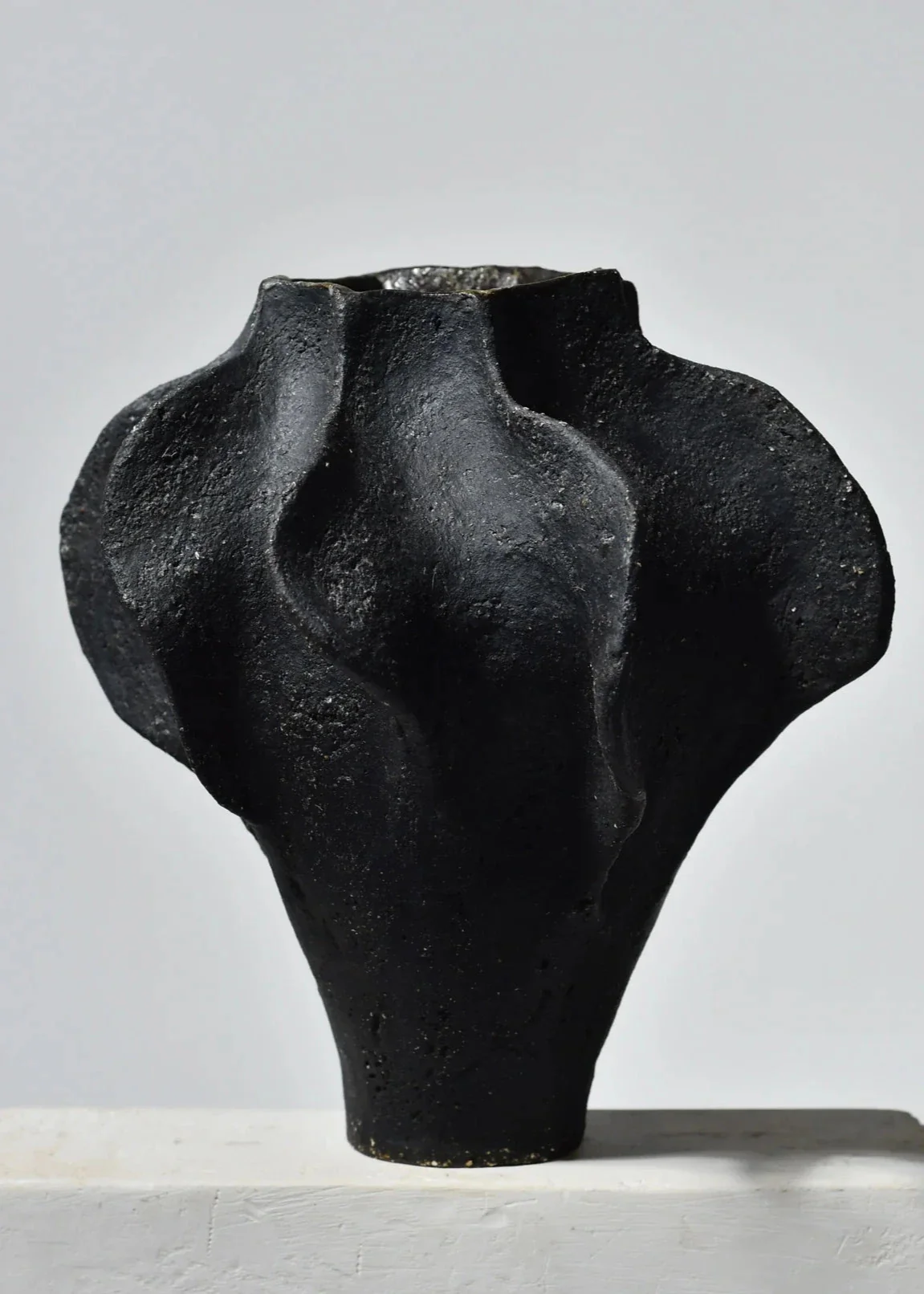 Sculpté à la main avec une délicatesse infinie, Ailes Noir est un réceptacle en grès qui semble capturer les mouvements en constante évolution de la vie. Chaque courbe, chaque creux est une invitation à la contemplation, révélant une danse subtile de formes et d’ombres. Pour ajouter à son attrait, une barbotine d’oxyde équitable est méticuleusement appliquée sur sa surface, ce qui donne une finition noire luxueuse et profonde. L’intérieur subit un processus de vitrification, offrant un contraste raffiné avec l’extérieur robuste.