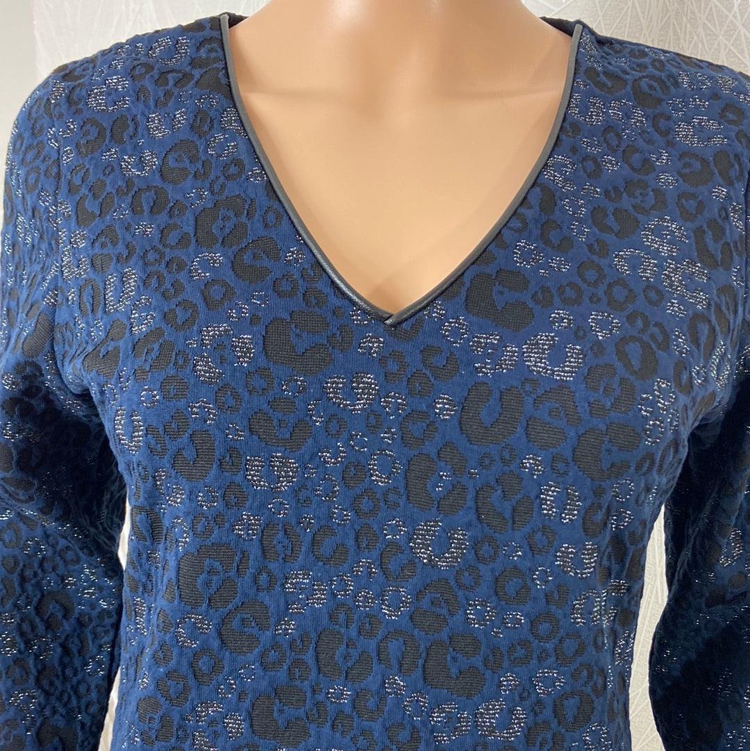 Manches 3/4, encolure en V en cuir synthétique, coupe droite, 2 poches décoratives à l’avant et tissu bleu marine avec fils argentés avec motifs en relief.