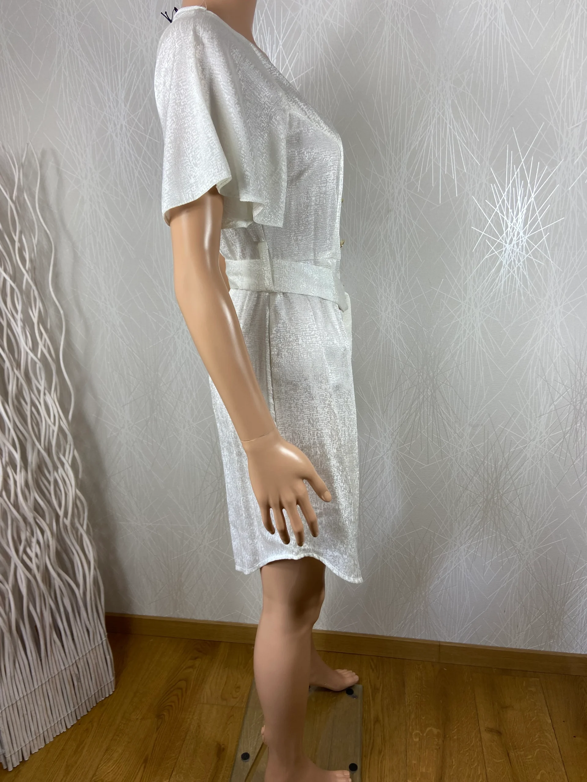 Belle confection haut de gamme avec manches courtes, boutons décoratifs dorés, ceinture à la taille et fermeture zip sur le côté.
