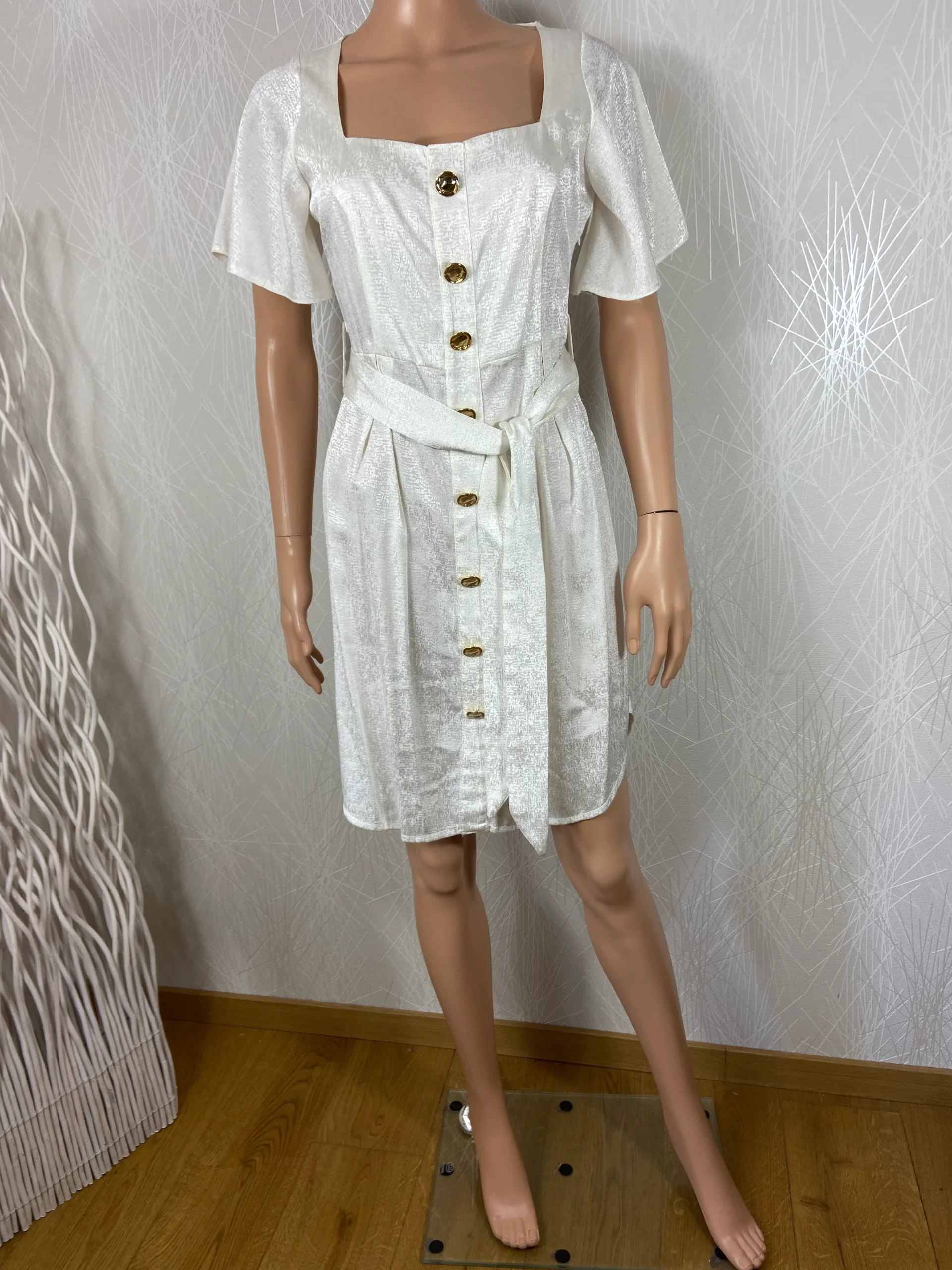 Robe blanche satinée de la marque Opullence. Belle confection haut de gamme avec manches courtes, boutons décoratifs dorés, ceinture à la taille et fermeture zip sur le côté. Matière : 100% polyester. Couleur : Blanc. Marque : Opullence Pars Taille : M / 38 – Réf : 38MR1917 Dimensions : Largeur épaule : 31 cm […]
